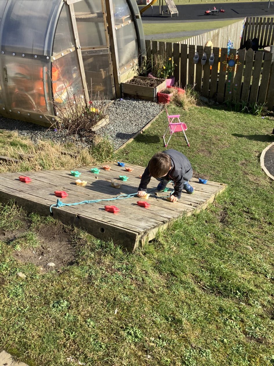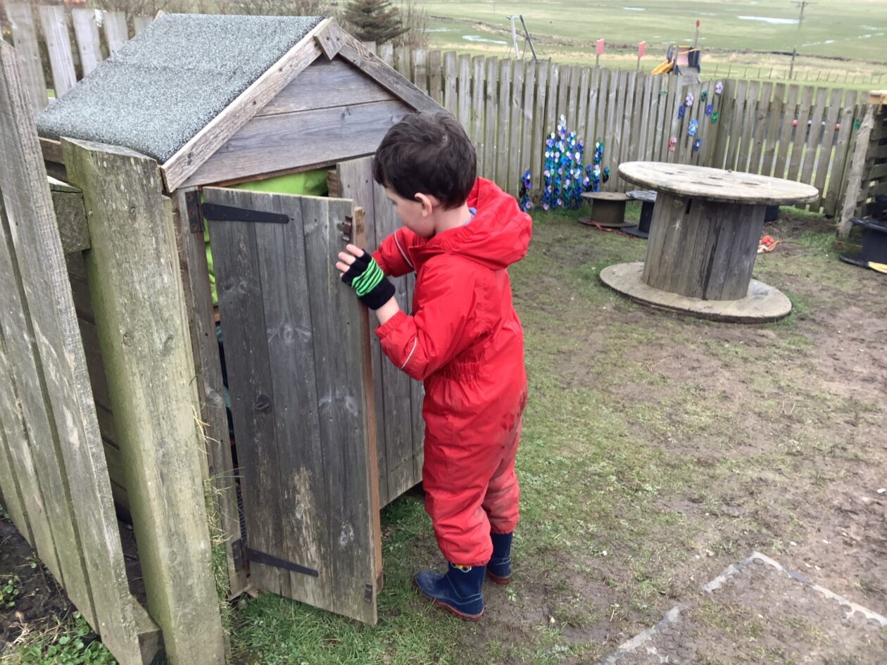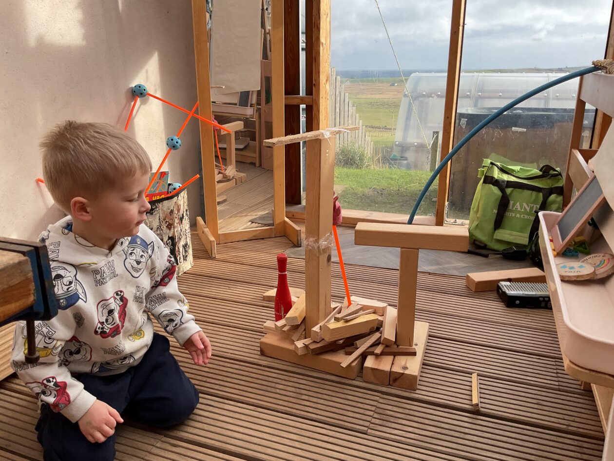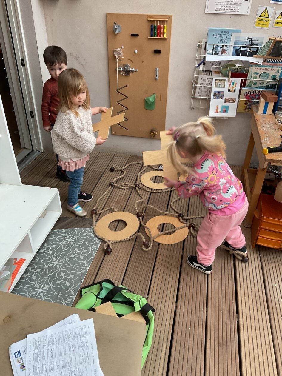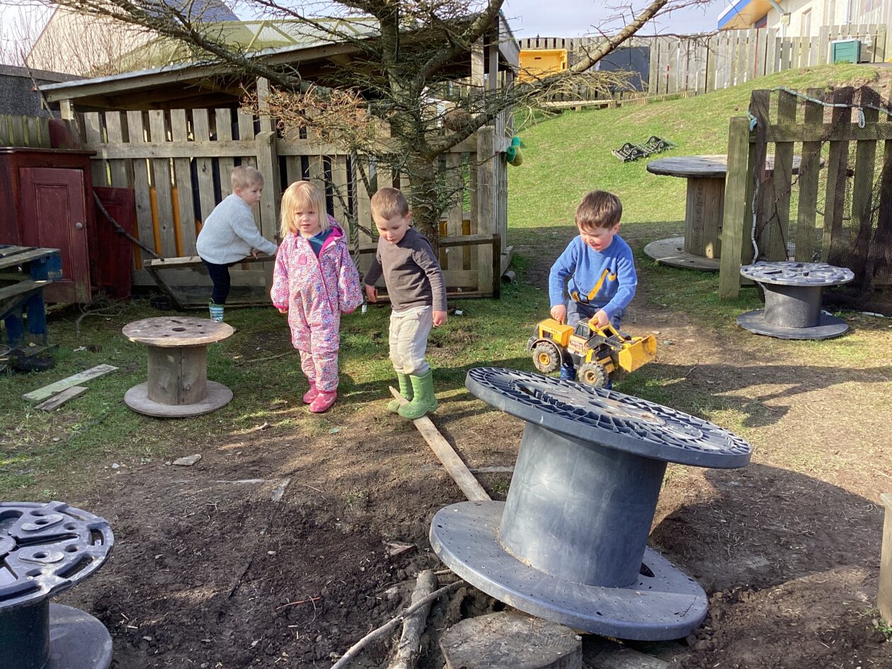 The outdoor room is always a popular choice and a great place to observe schemas (a repeated action used to explore and test theories in play). The bairns have used positioning, transporting, trajectory, enveloping, rotation and enclosure schemas in their play this week. They made paper aeroplanes and then built a platform to launch their planes from, watching how far they flew. They have also been engaged in imaginative play using the large hollow blocks and cable drums as fishing boats. “He is da een dat goes in da water. He is da fishing een and I’m da Captain.”