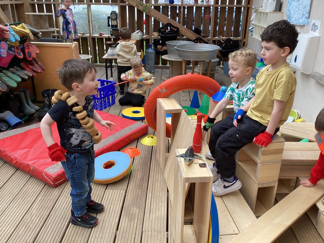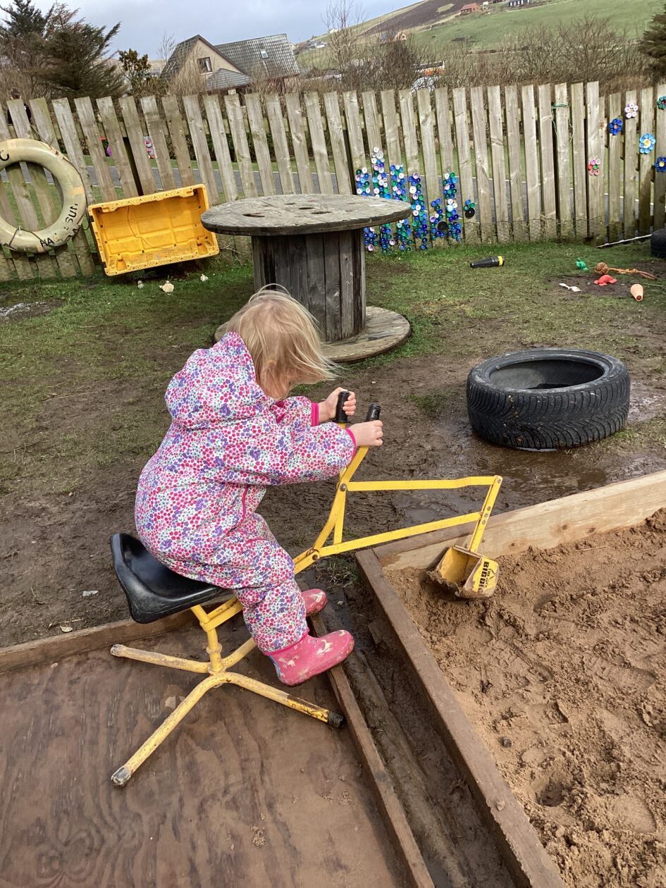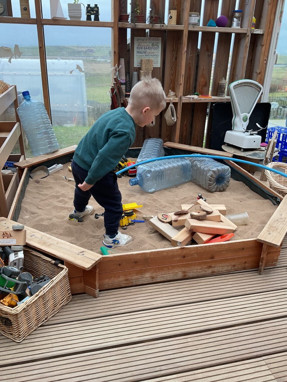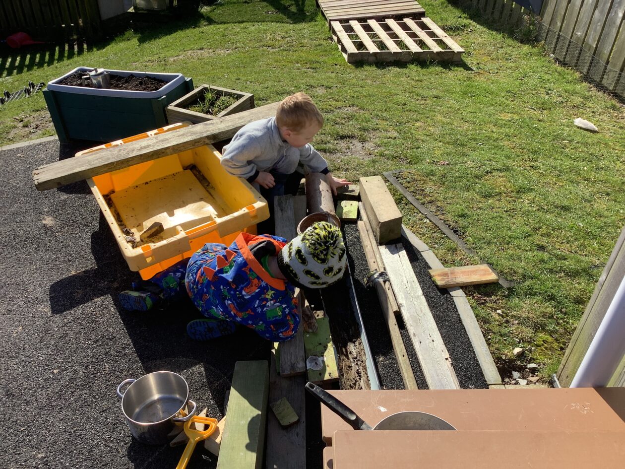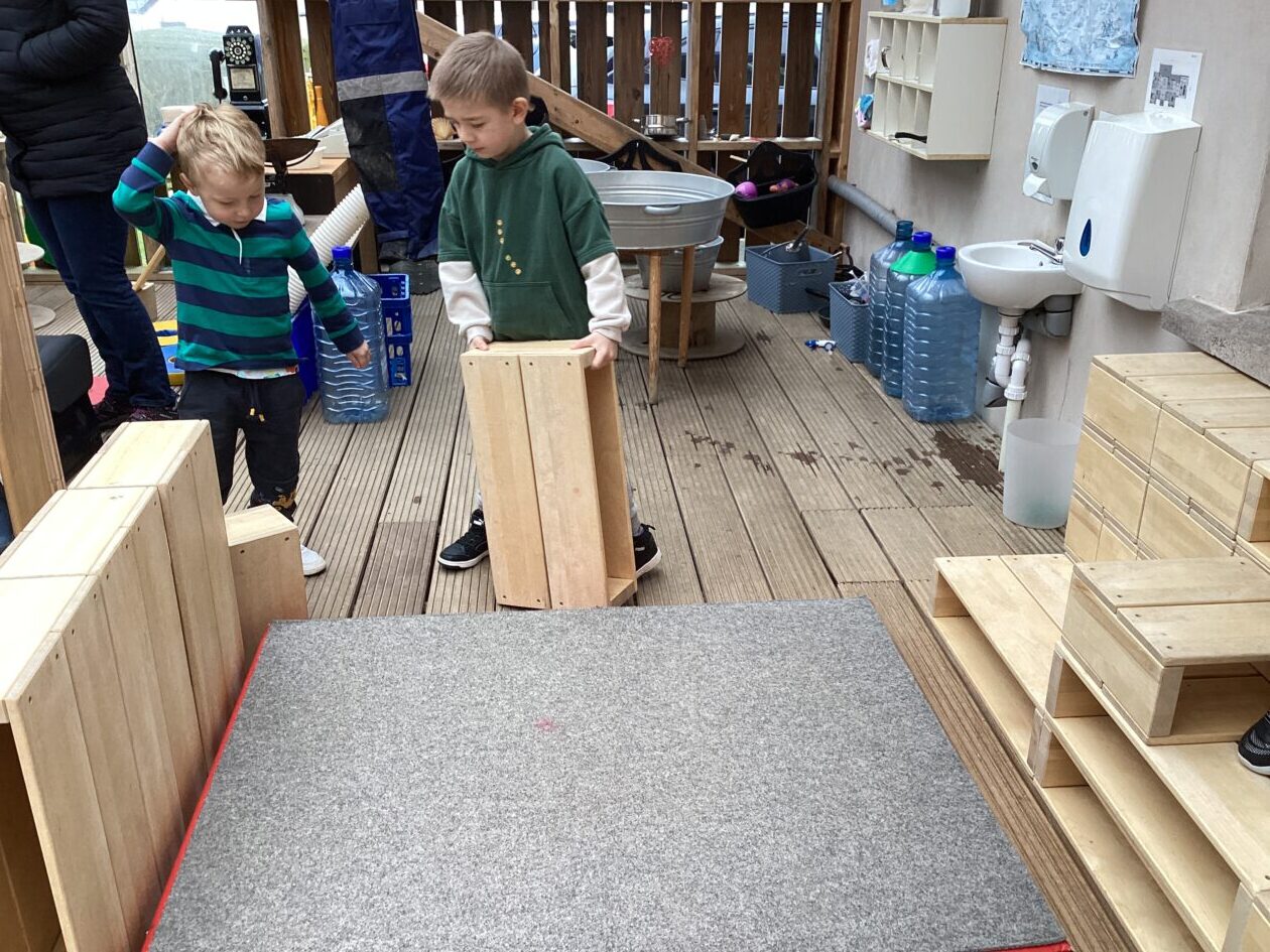 The outdoor room is always a popular choice and a great place to observe schemas (a repeated action used to explore and test theories in play). The bairns have used positioning, transporting, trajectory, enveloping, rotation and enclosure schemas in their play this week. They made paper aeroplanes and then built a platform to launch their planes from, watching how far they flew. They have also been engaged in imaginative play using the large hollow blocks and cable drums as fishing boats. “He is da een dat goes in da water. He is da fishing een and I’m da Captain.”