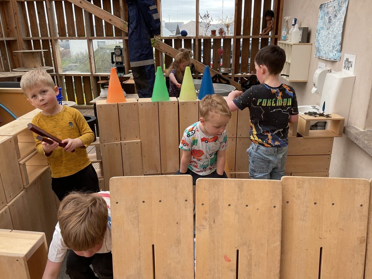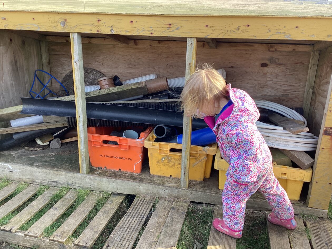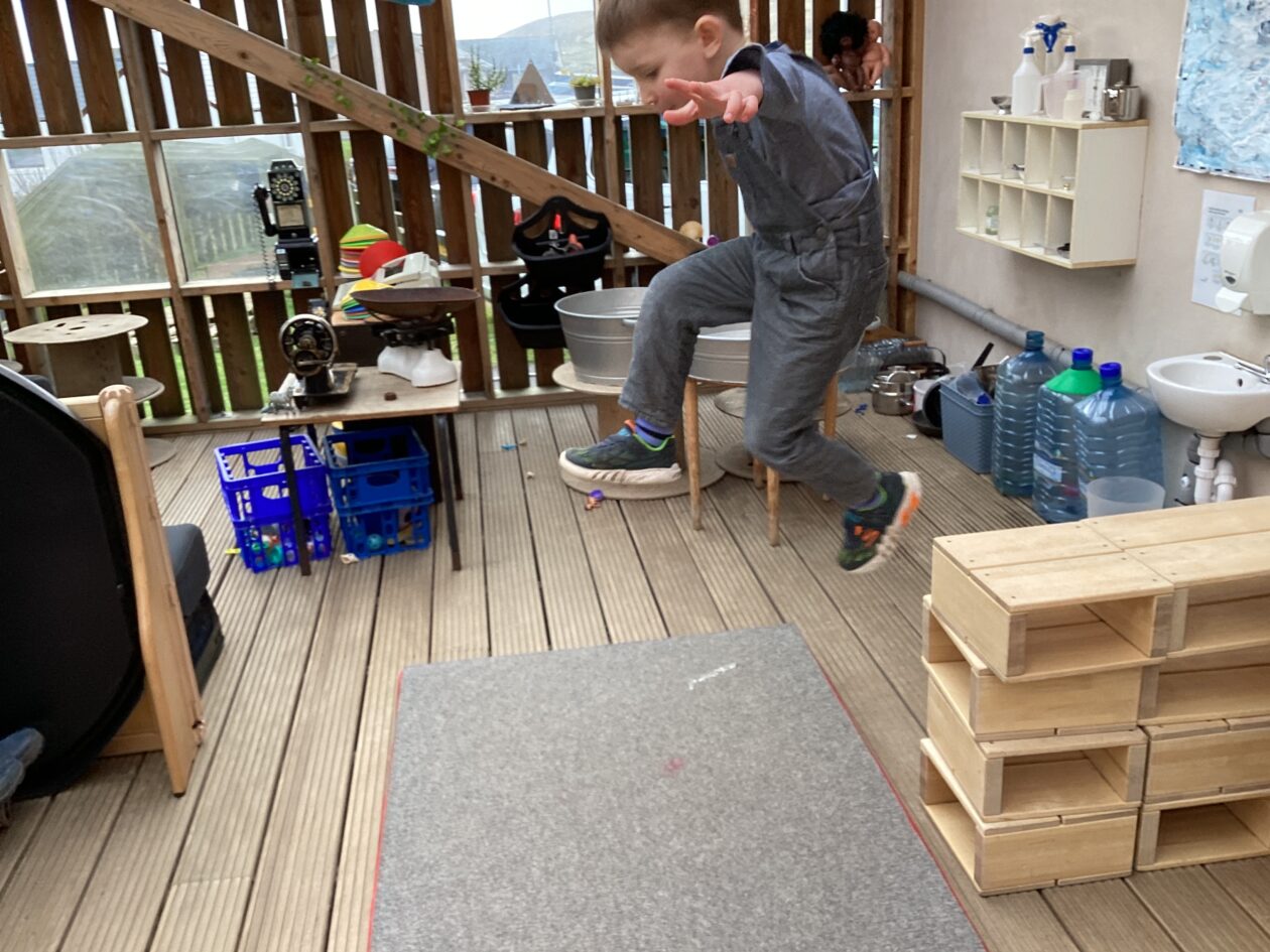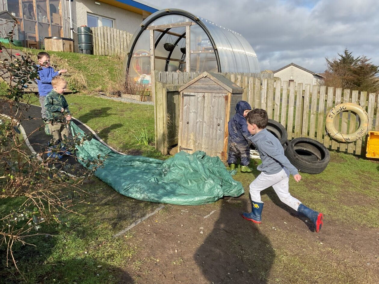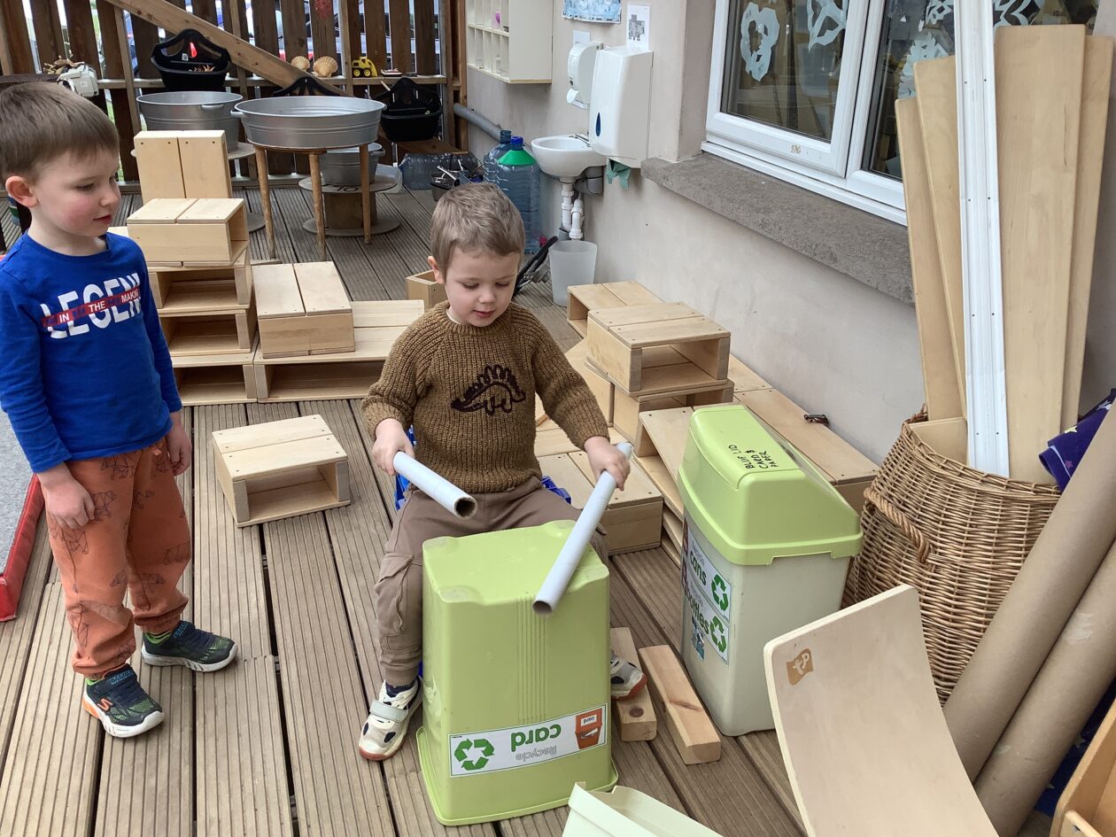 The outdoor room is always a popular choice and a great place to observe schemas (a repeated action used to explore and test theories in play). The bairns have used positioning, transporting, trajectory, enveloping, rotation and enclosure schemas in their play this week. They made paper aeroplanes and then built a platform to launch their planes from, watching how far they flew. They have also been engaged in imaginative play using the large hollow blocks and cable drums as fishing boats. “He is da een dat goes in da water. He is da fishing een and I’m da Captain.”