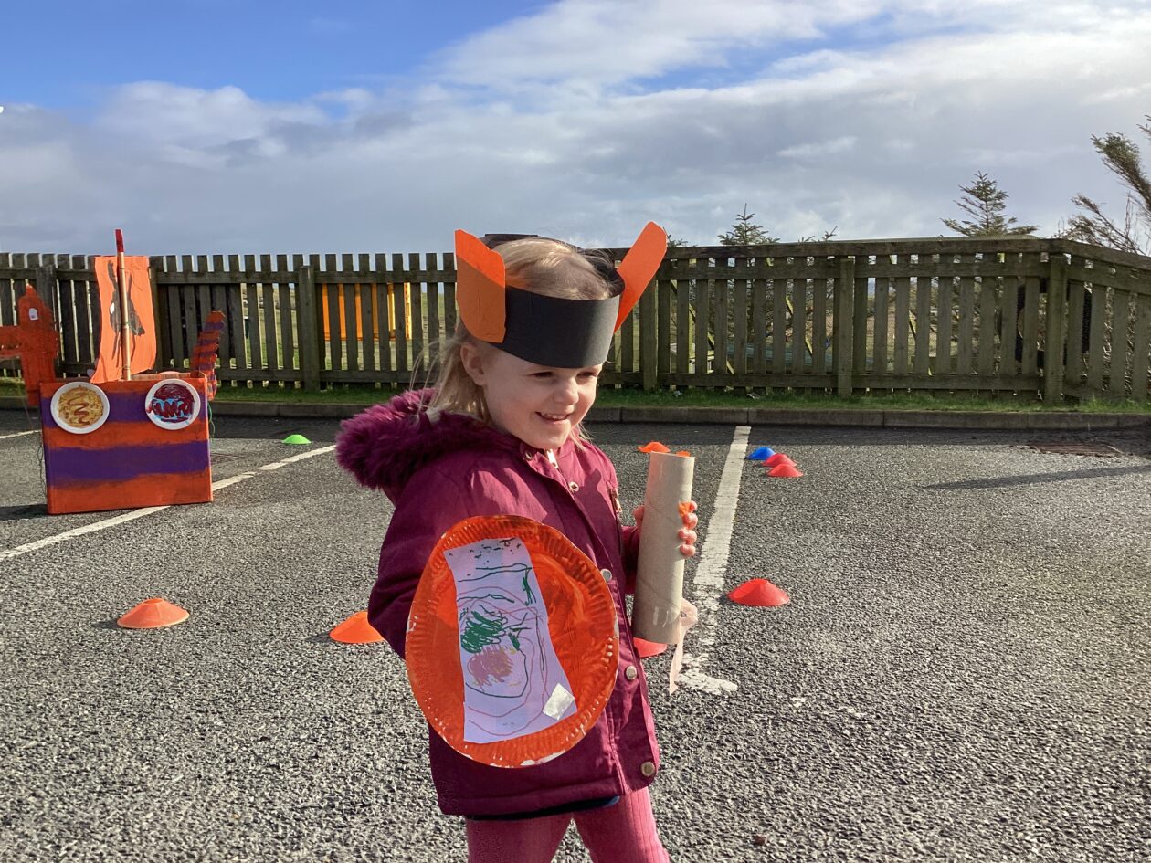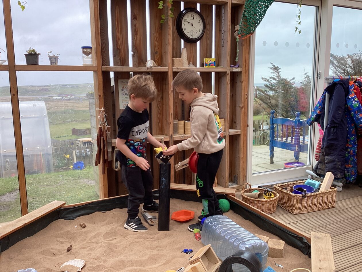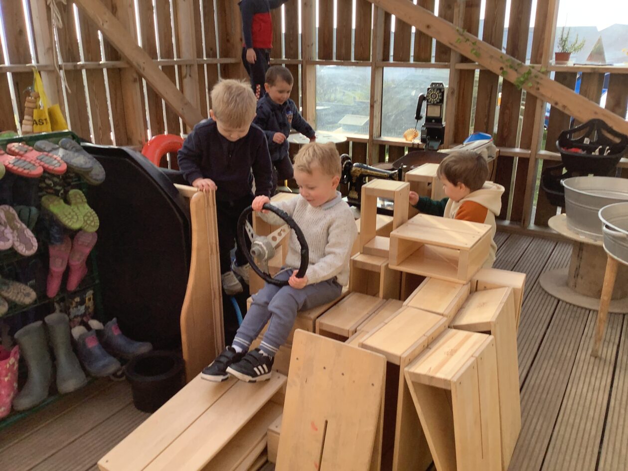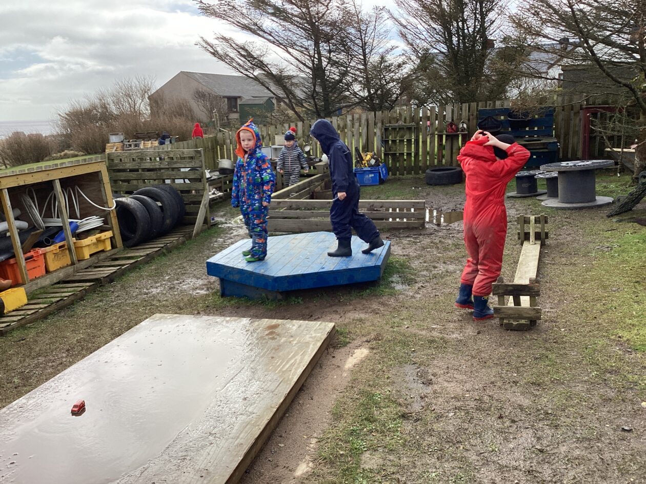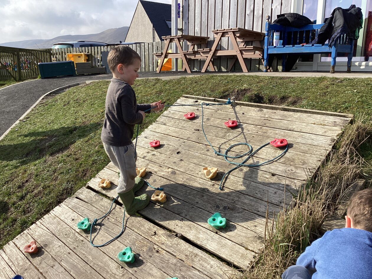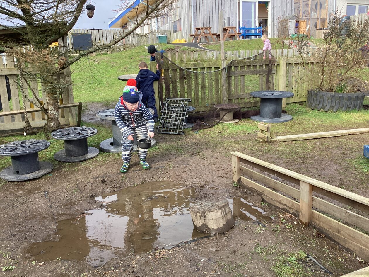 The outdoor room is always a popular choice and a great place to observe schemas (a repeated action used to explore and test theories in play). The bairns have used positioning, transporting, trajectory, enveloping, rotation and enclosure schemas in their play this week. They made paper aeroplanes and then built a platform to launch their planes from, watching how far they flew. They have also been engaged in imaginative play using the large hollow blocks and cable drums as fishing boats. “He is da een dat goes in da water. He is da fishing een and I’m da Captain.”