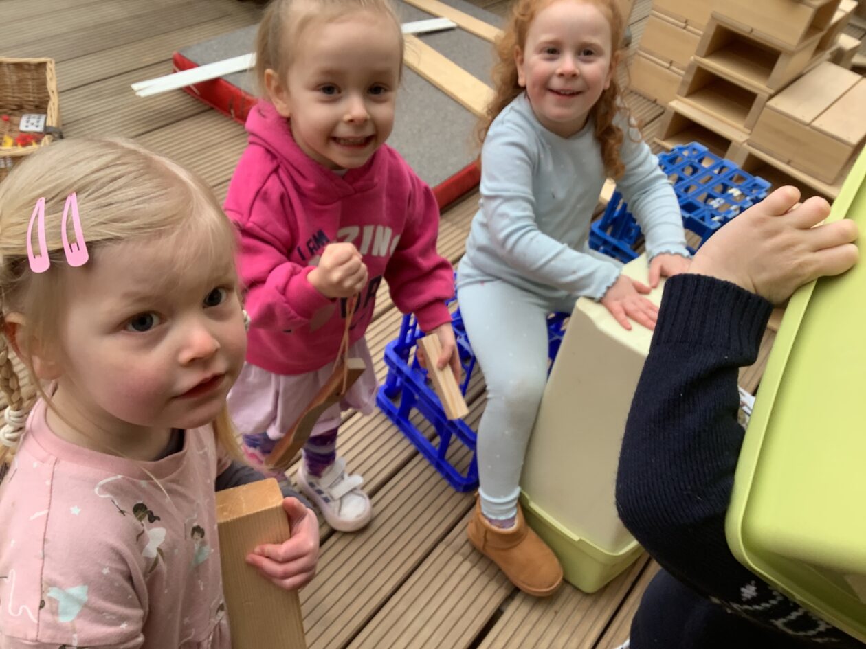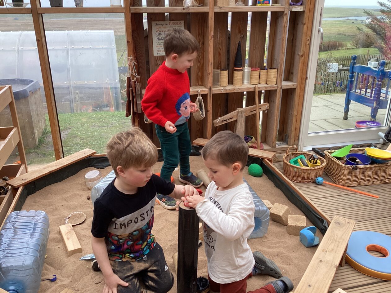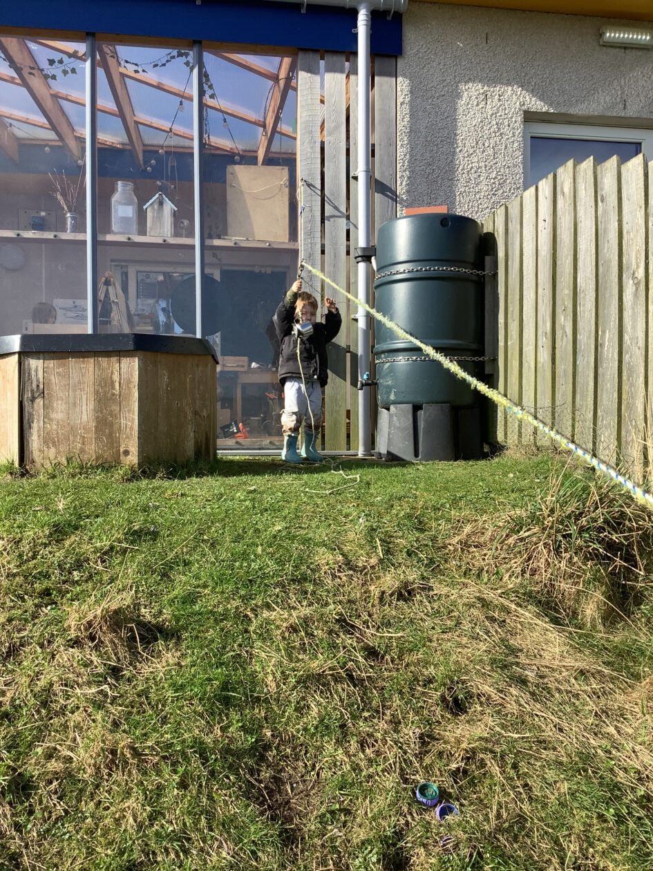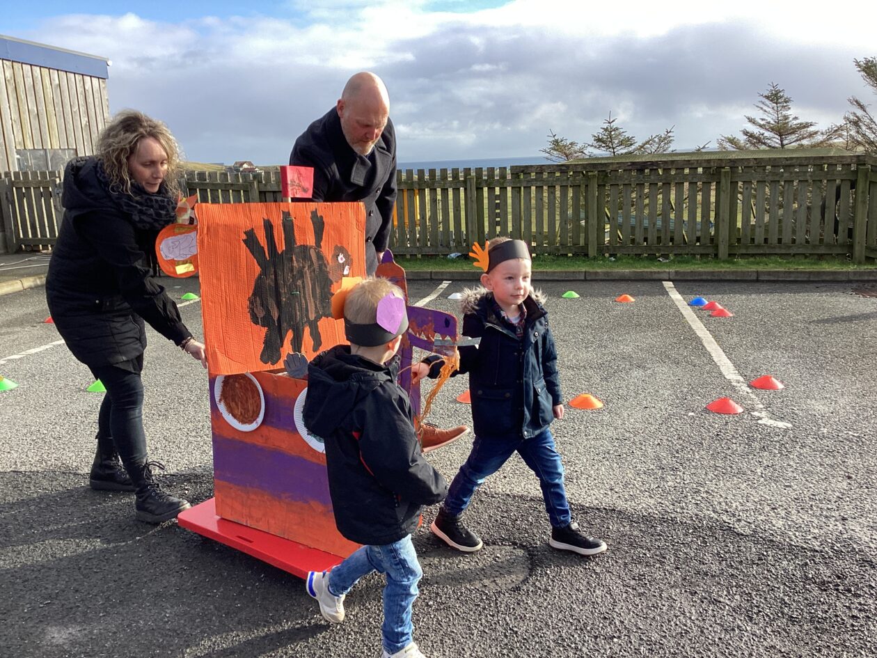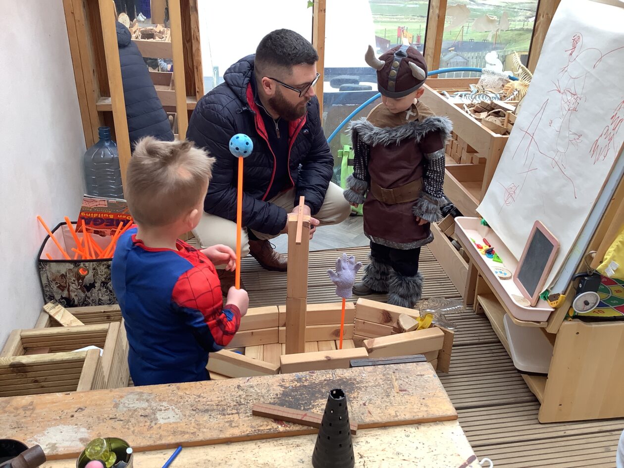 The outdoor room is always a popular choice and a great place to observe schemas (a repeated action used to explore and test theories in play). The bairns have used positioning, transporting, trajectory, enveloping, rotation and enclosure schemas in their play this week. They made paper aeroplanes and then built a platform to launch their planes from, watching how far they flew. They have also been engaged in imaginative play using the large hollow blocks and cable drums as fishing boats. “He is da een dat goes in da water. He is da fishing een and I’m da Captain.”