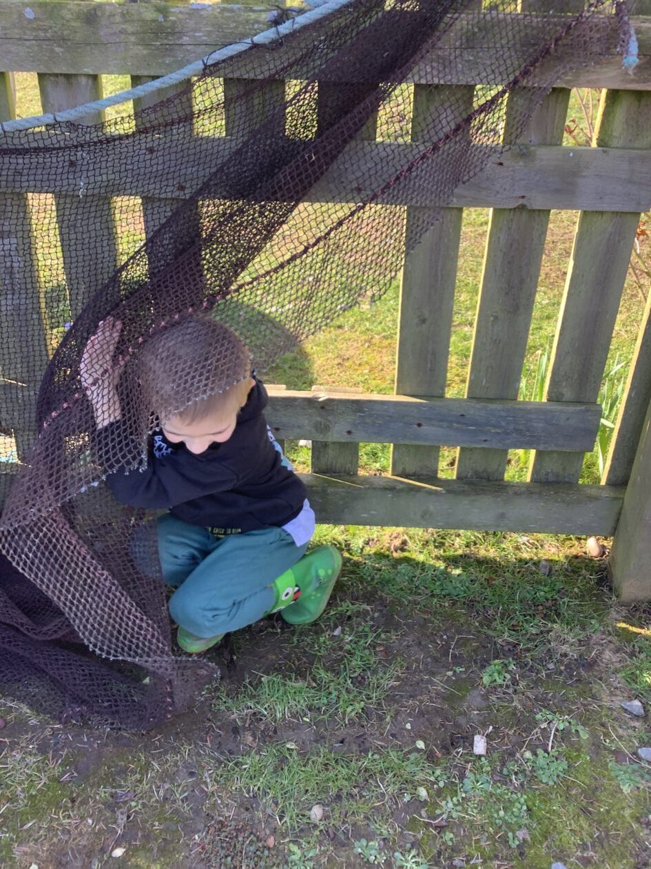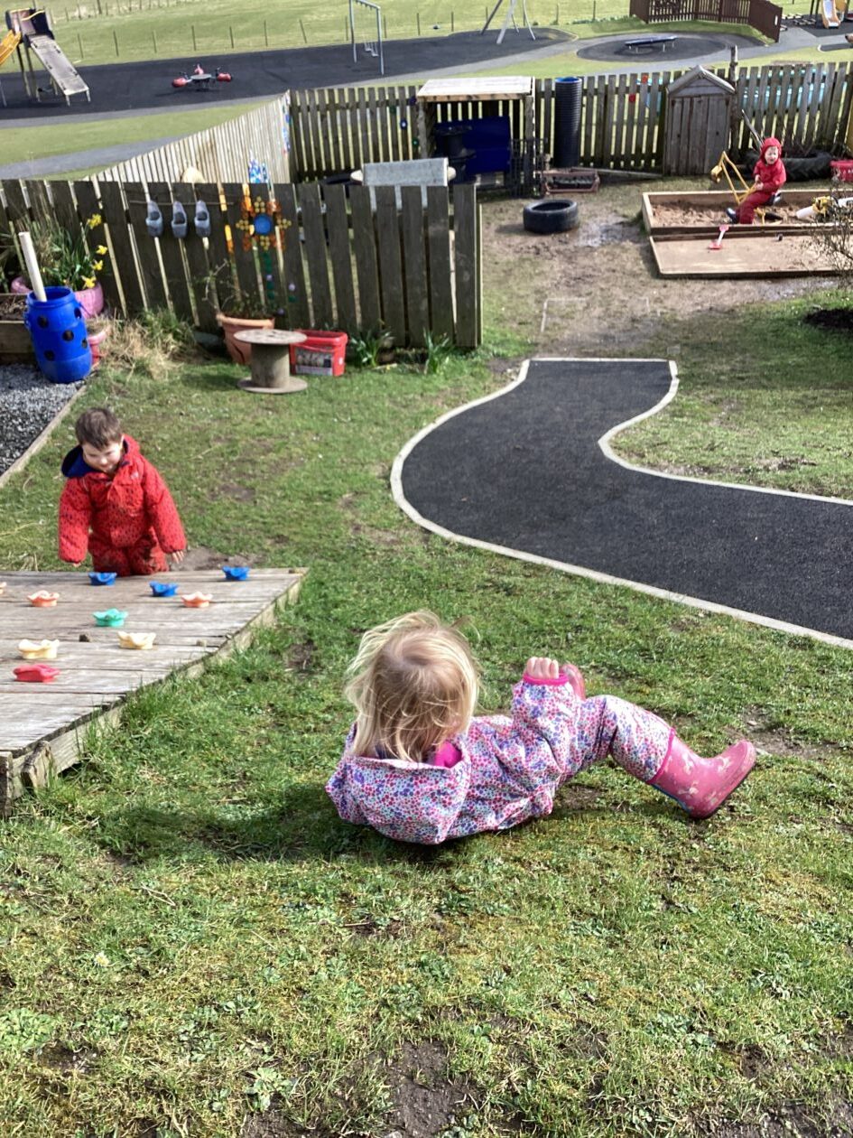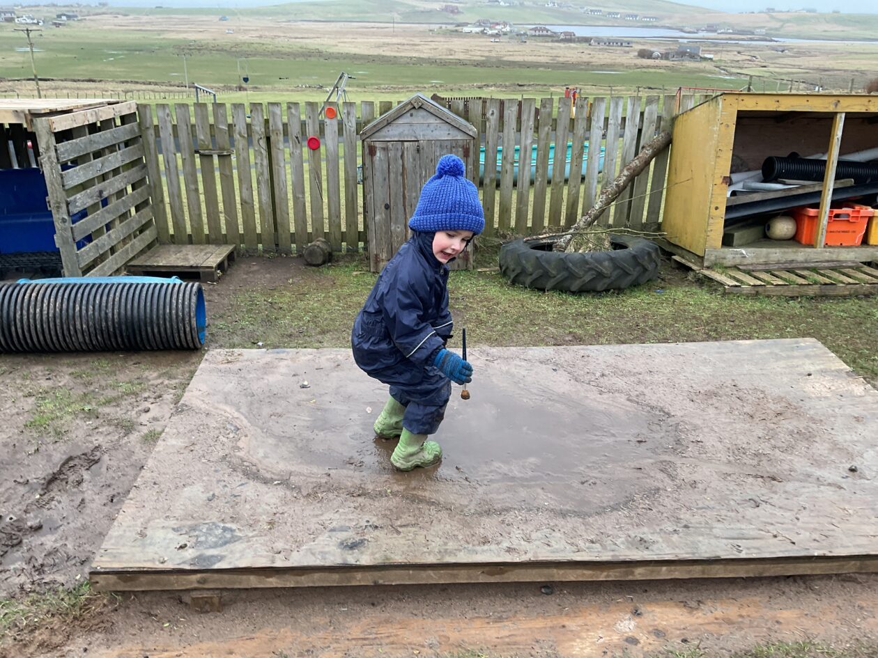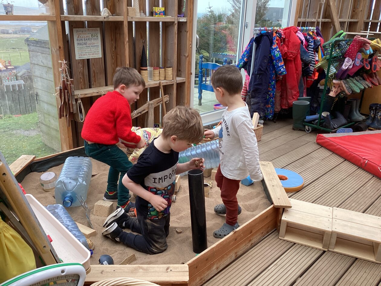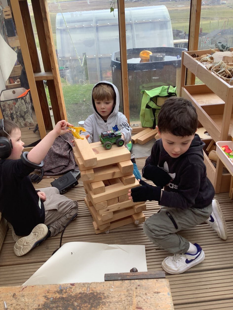 The outdoor room is always a popular choice and a great place to observe schemas (a repeated action used to explore and test theories in play). The bairns have used positioning, transporting, trajectory, enveloping, rotation and enclosure schemas in their play this week. They made paper aeroplanes and then built a platform to launch their planes from, watching how far they flew. They have also been engaged in imaginative play using the large hollow blocks and cable drums as fishing boats. “He is da een dat goes in da water. He is da fishing een and I’m da Captain.”