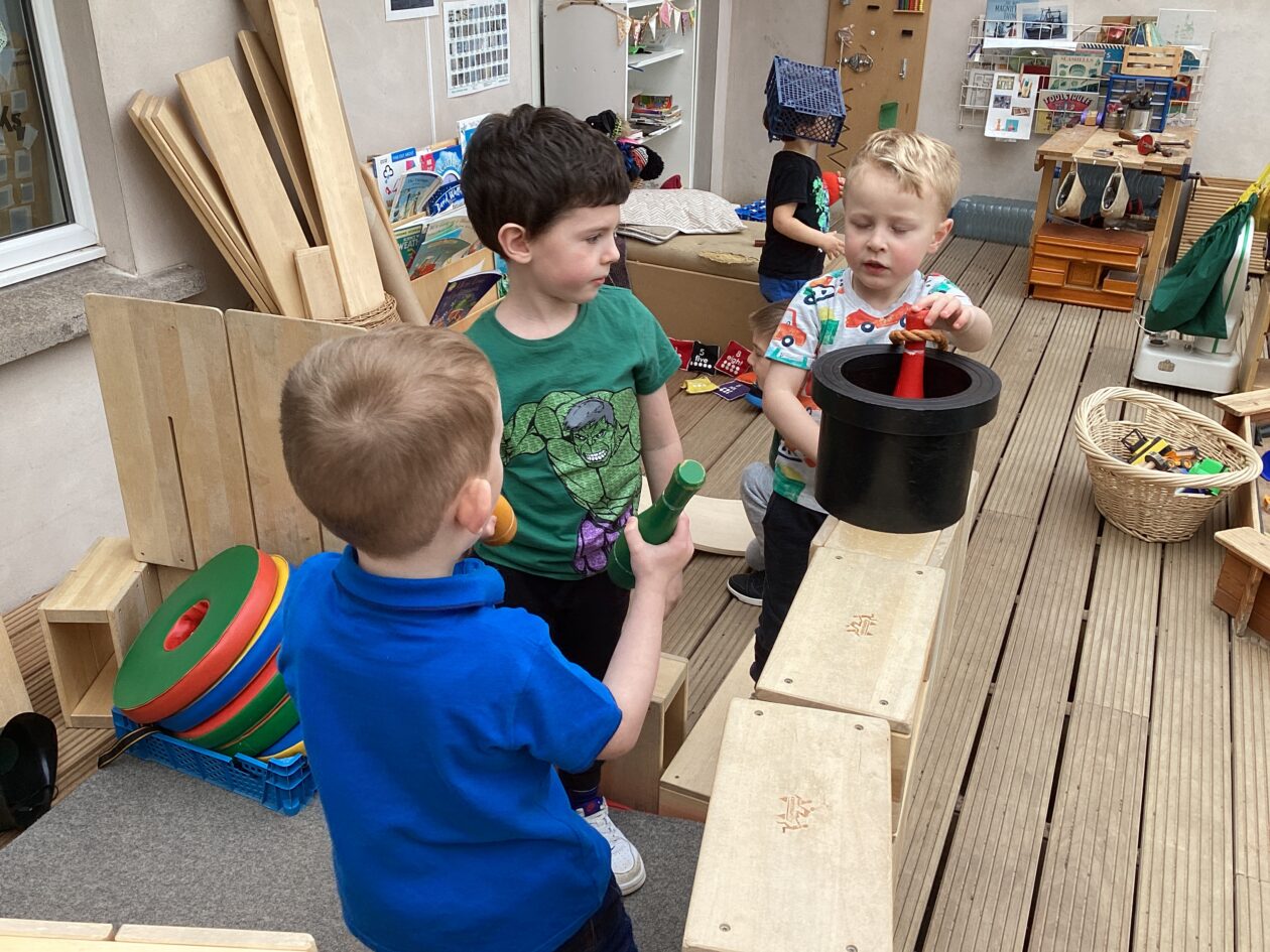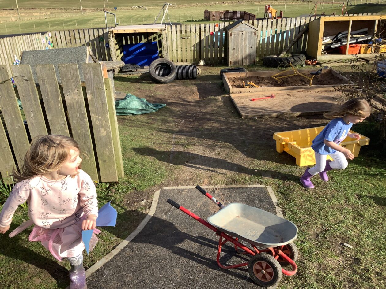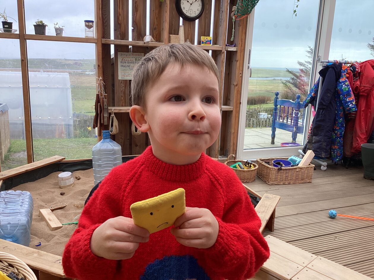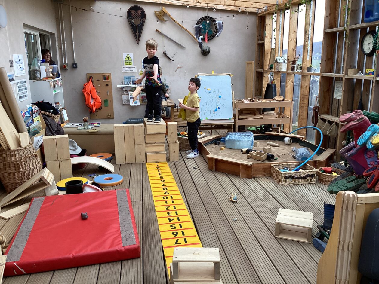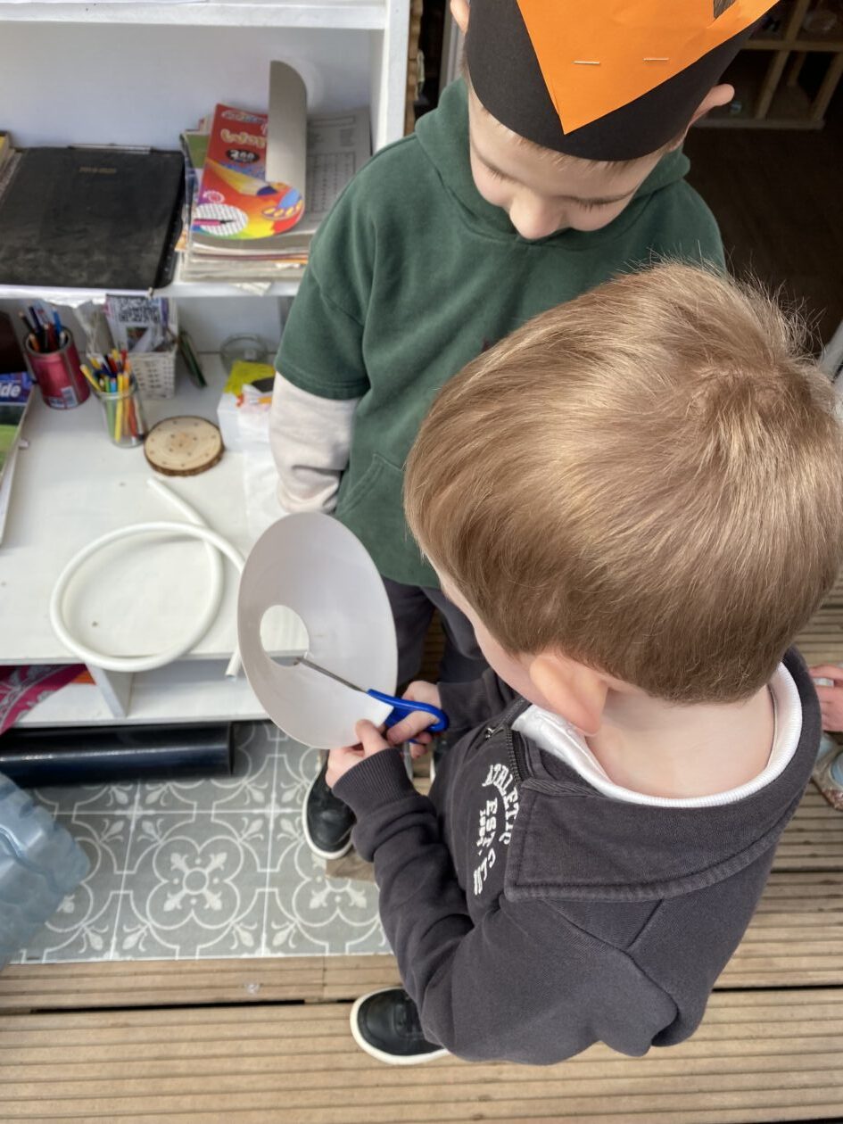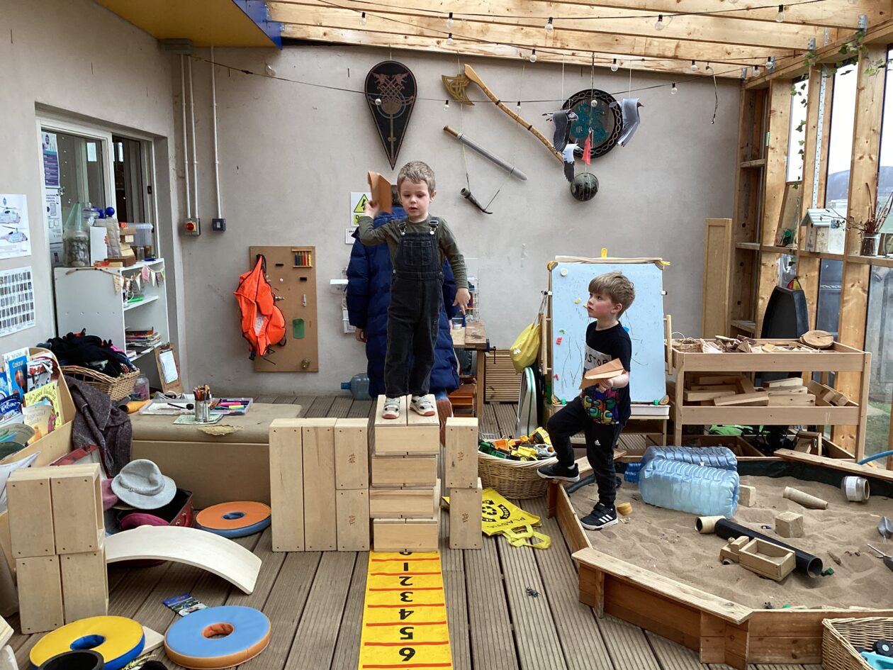 The outdoor room is always a popular choice and a great place to observe schemas (a repeated action used to explore and test theories in play). The bairns have used positioning, transporting, trajectory, enveloping, rotation and enclosure schemas in their play this week. They made paper aeroplanes and then built a platform to launch their planes from, watching how far they flew. They have also been engaged in imaginative play using the large hollow blocks and cable drums as fishing boats. “He is da een dat goes in da water. He is da fishing een and I’m da Captain.”