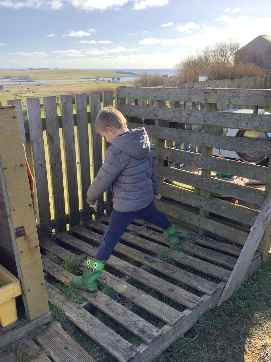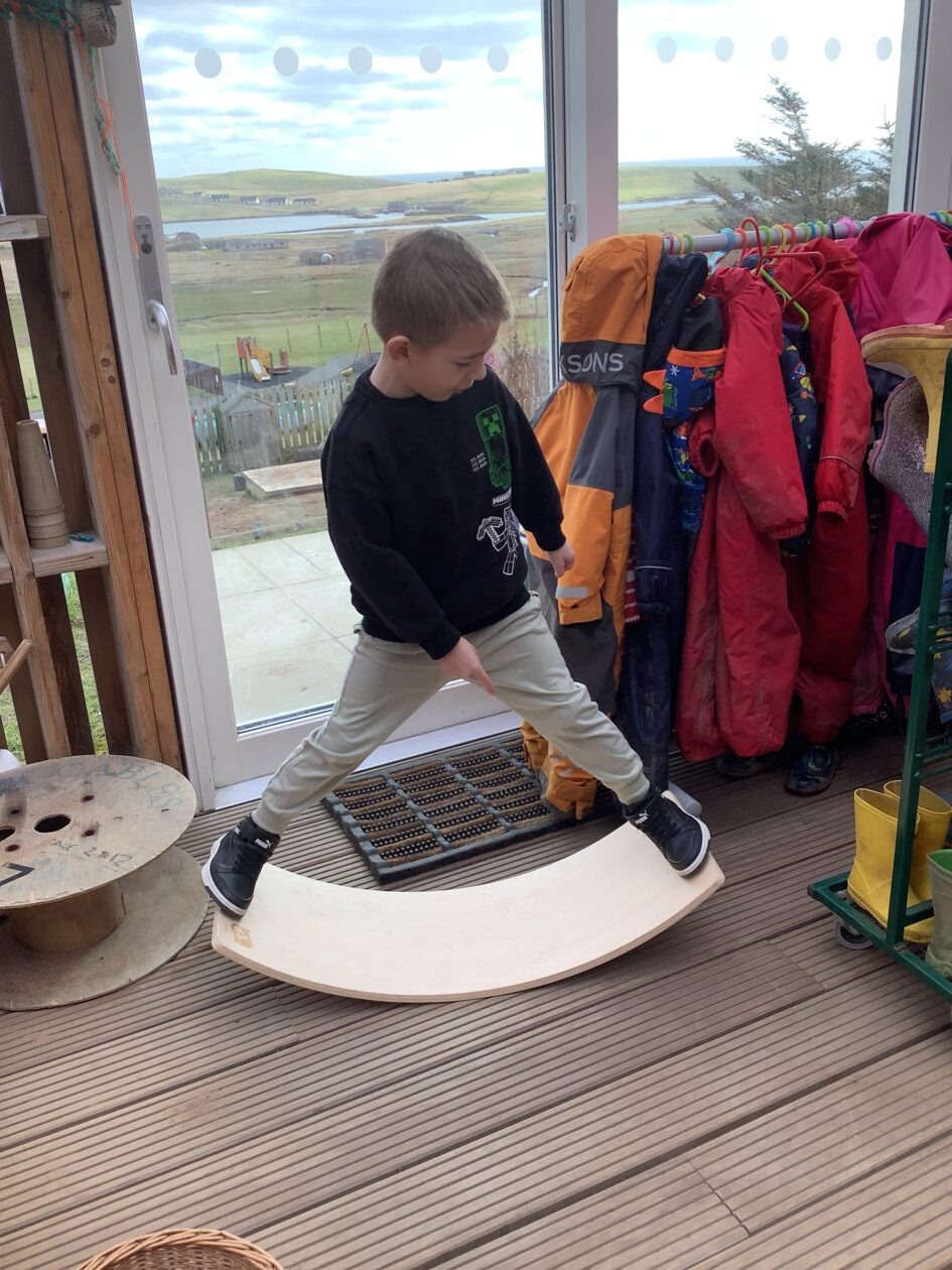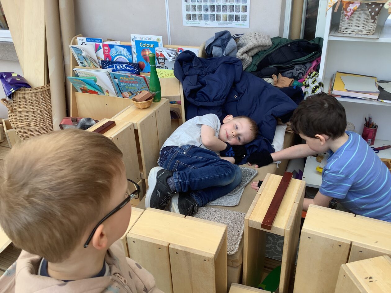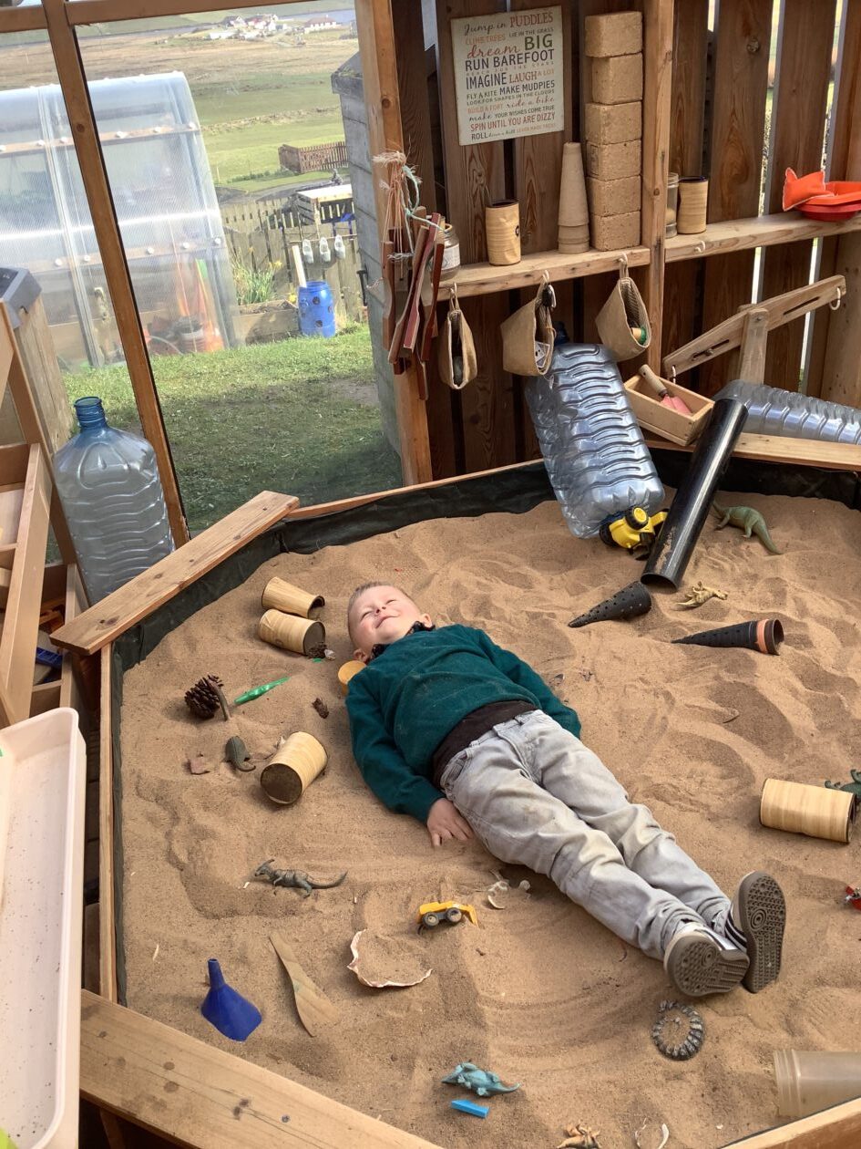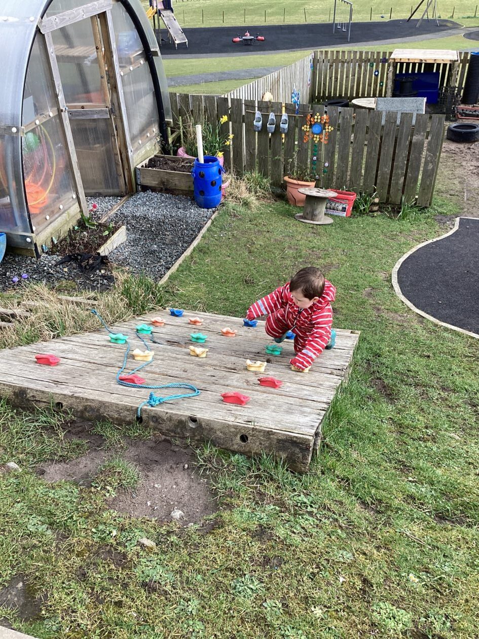 The outdoor room is always a popular choice and a great place to observe schemas (a repeated action used to explore and test theories in play). The bairns have used positioning, transporting, trajectory, enveloping, rotation and enclosure schemas in their play this week. They made paper aeroplanes and then built a platform to launch their planes from, watching how far they flew. They have also been engaged in imaginative play using the large hollow blocks and cable drums as fishing boats. “He is da een dat goes in da water. He is da fishing een and I’m da Captain.”