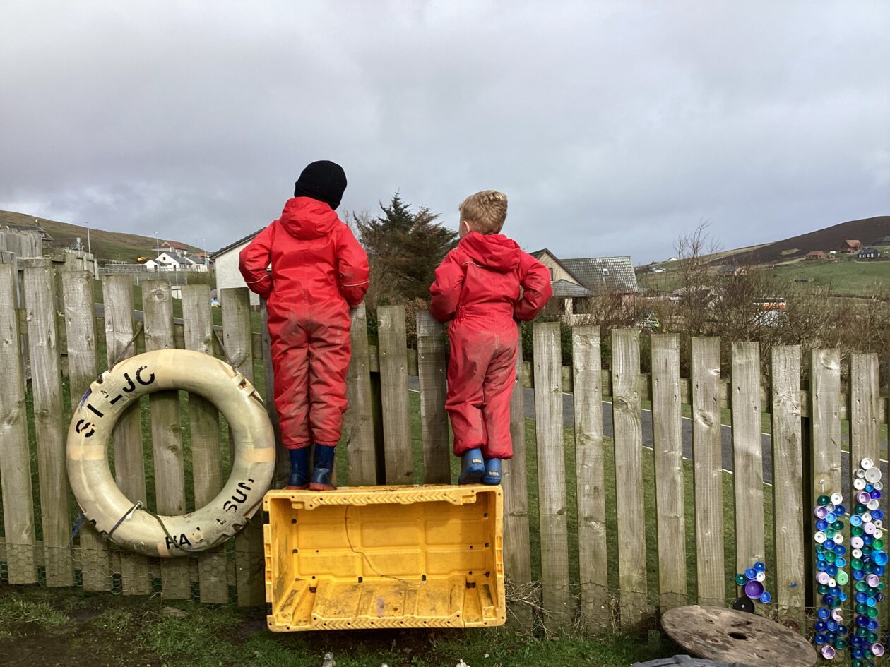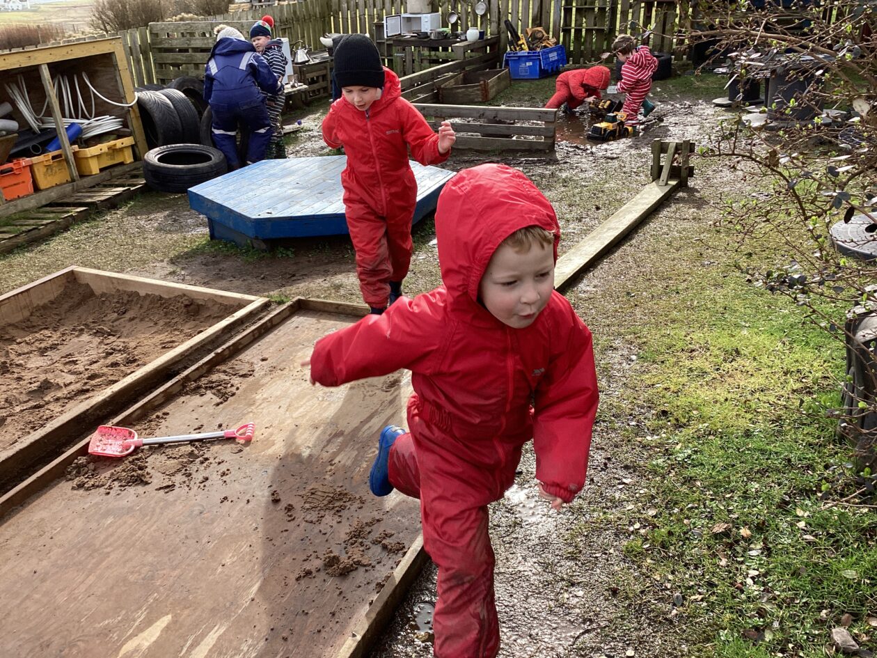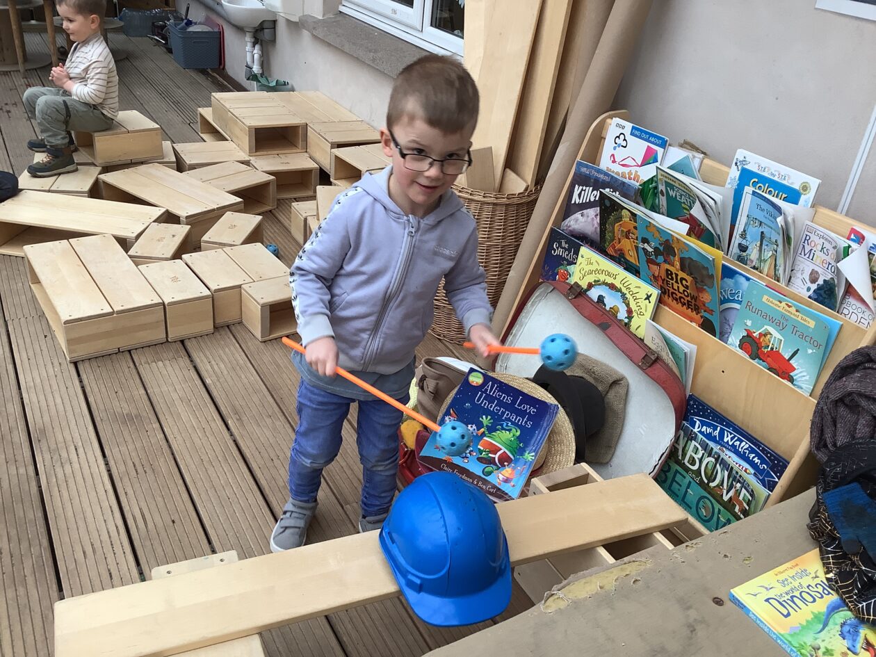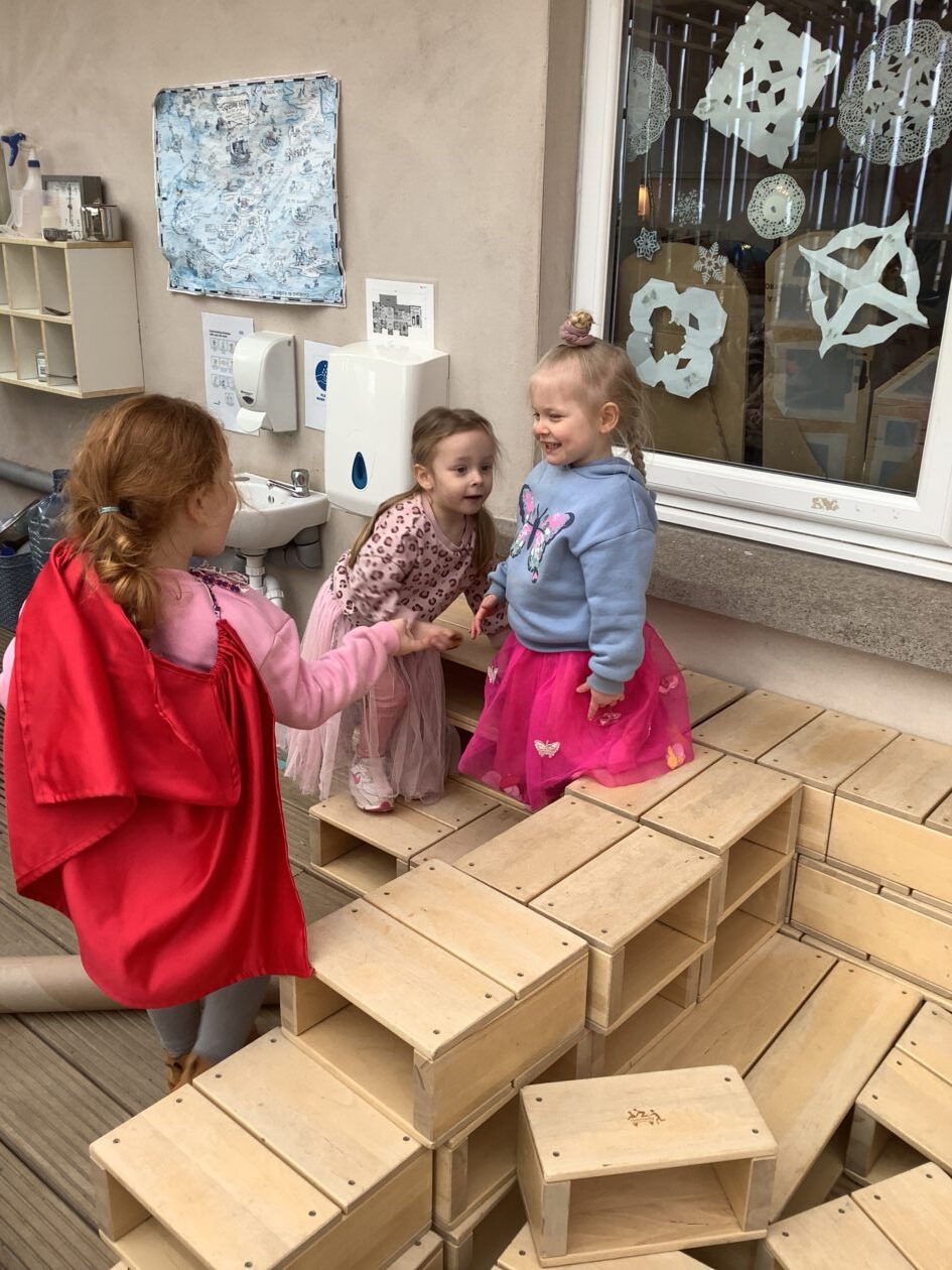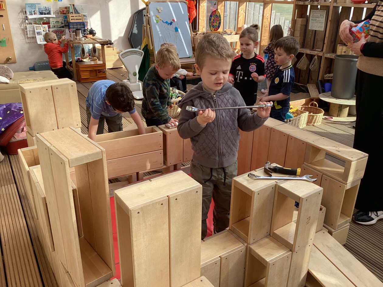 The outdoor room is always a popular choice and a great place to observe schemas (a repeated action used to explore and test theories in play). The bairns have used positioning, transporting, trajectory, enveloping, rotation and enclosure schemas in their play this week. They made paper aeroplanes and then built a platform to launch their planes from, watching how far they flew. They have also been engaged in imaginative play using the large hollow blocks and cable drums as fishing boats. “He is da een dat goes in da water. He is da fishing een and I’m da Captain.”