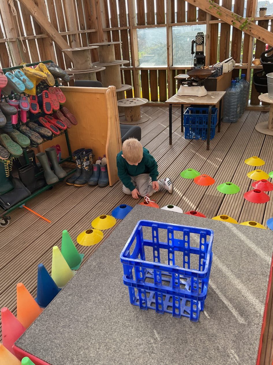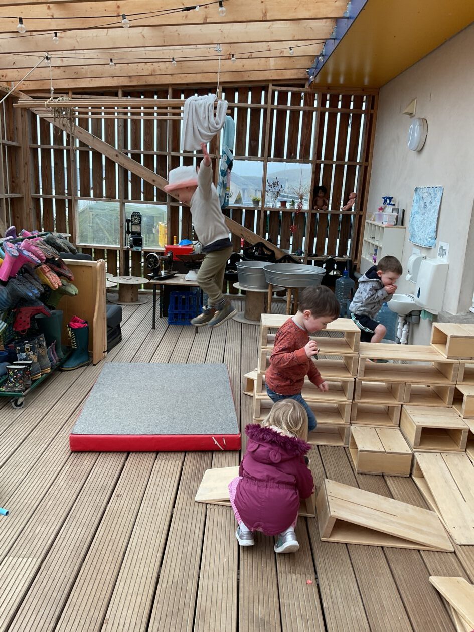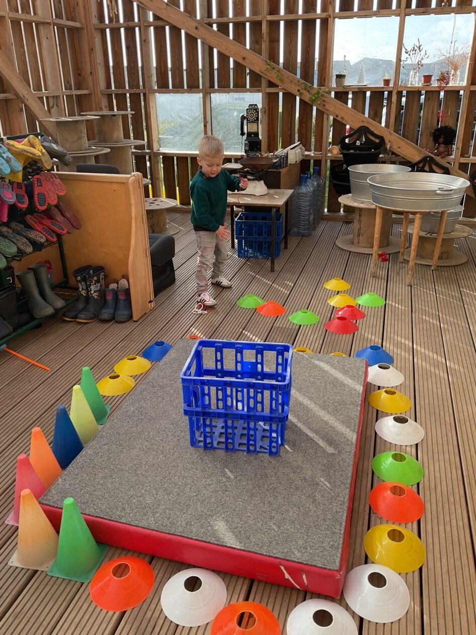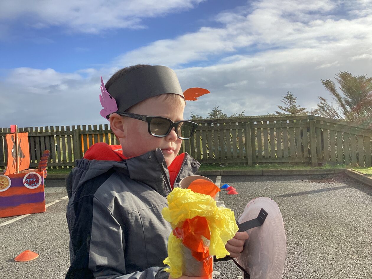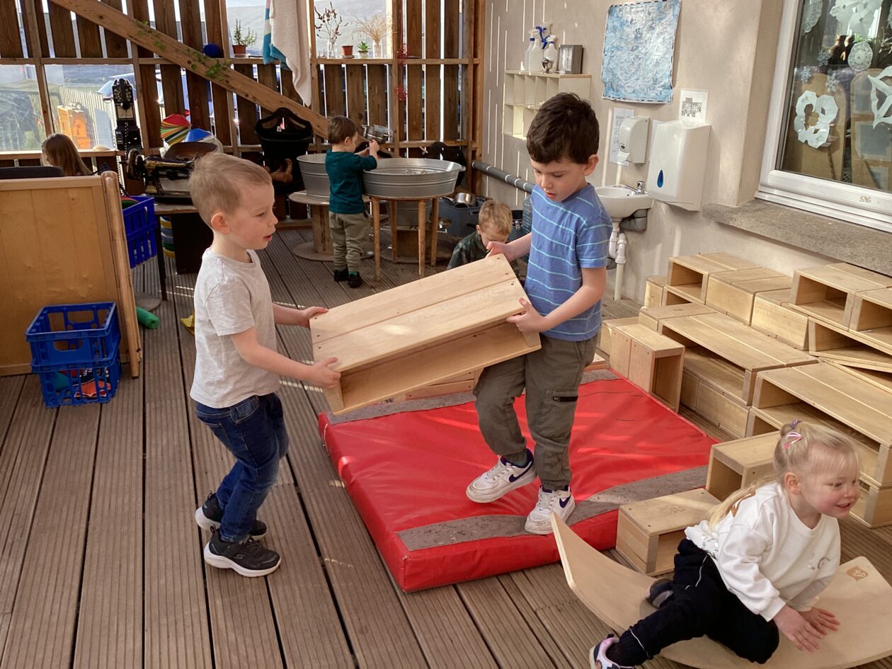 The outdoor room is always a popular choice and a great place to observe schemas (a repeated action used to explore and test theories in play). The bairns have used positioning, transporting, trajectory, enveloping, rotation and enclosure schemas in their play this week. They made paper aeroplanes and then built a platform to launch their planes from, watching how far they flew. They have also been engaged in imaginative play using the large hollow blocks and cable drums as fishing boats. “He is da een dat goes in da water. He is da fishing een and I’m da Captain.”