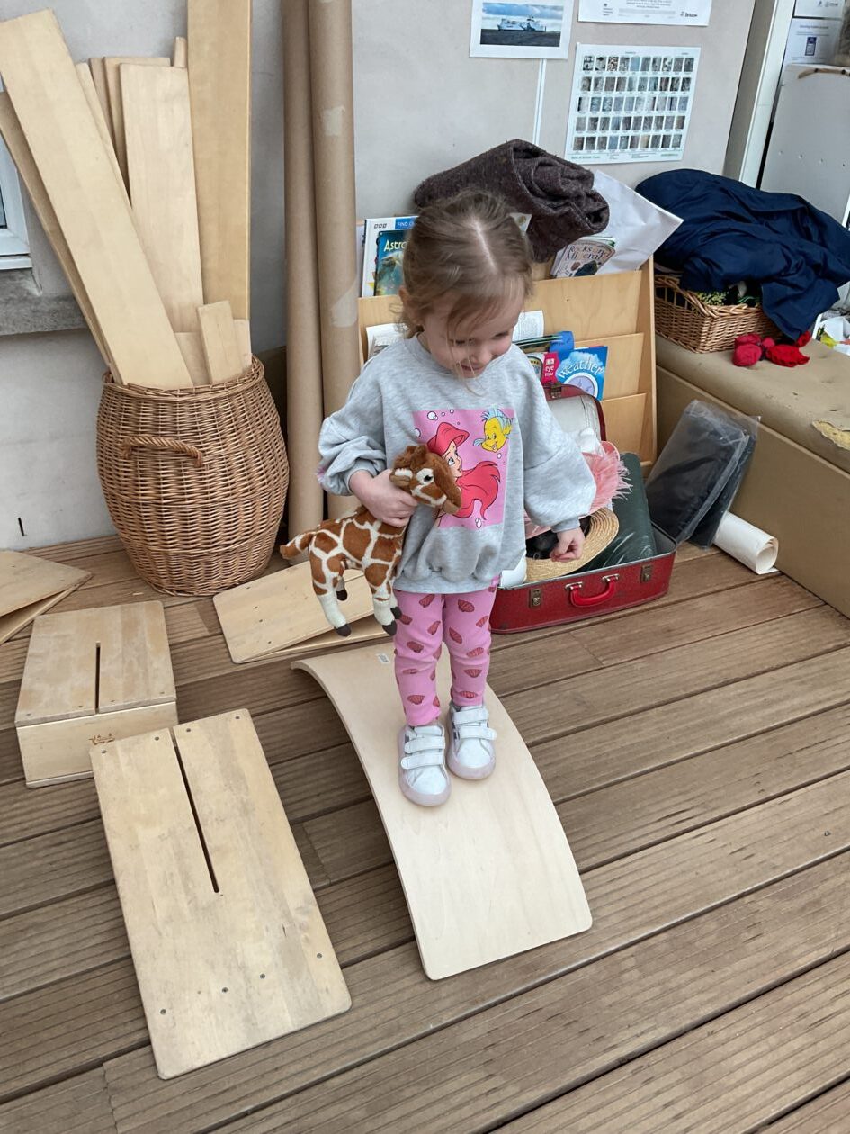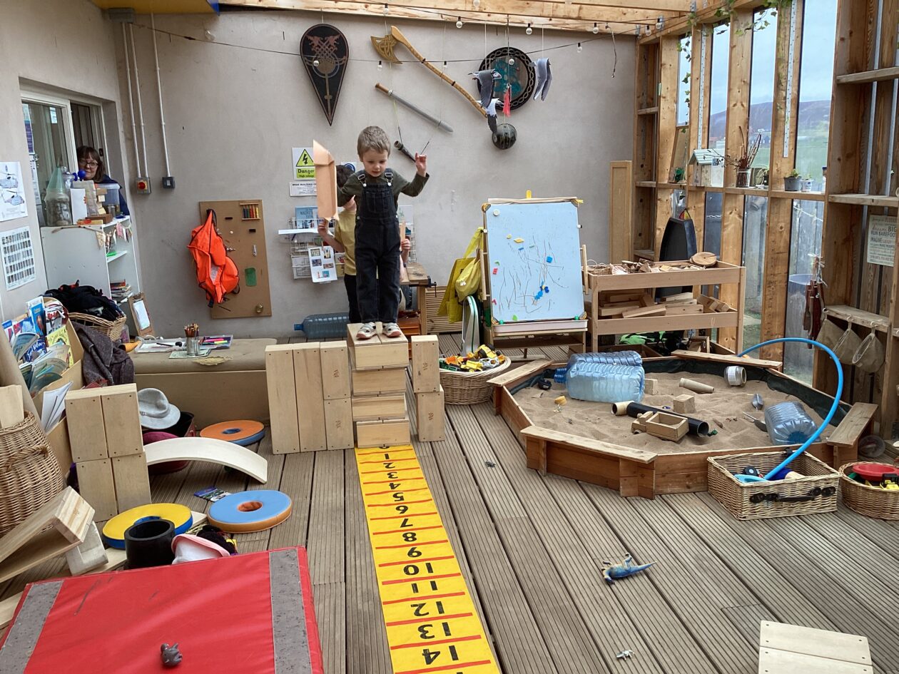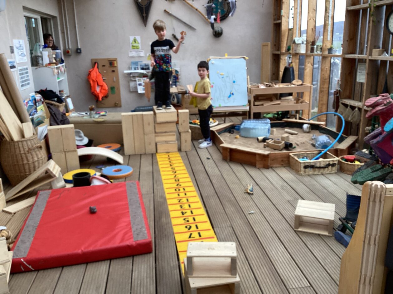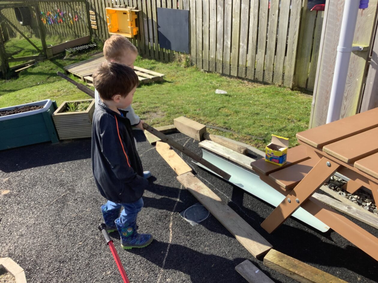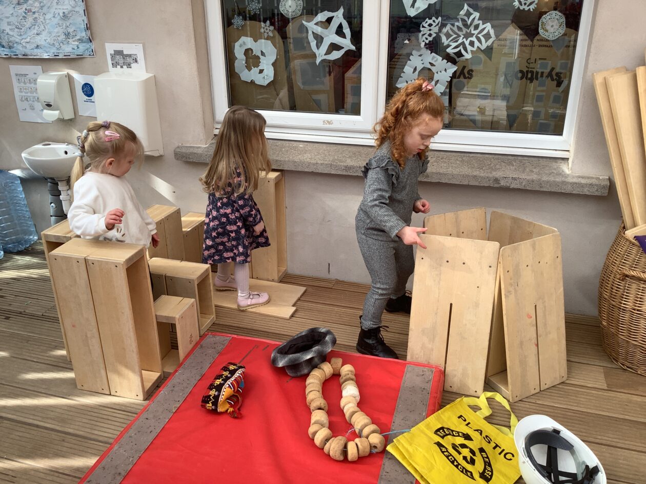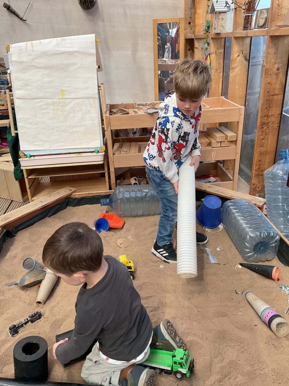 The outdoor room is always a popular choice and a great place to observe schemas (a repeated action used to explore and test theories in play). The bairns have used positioning, transporting, trajectory, enveloping, rotation and enclosure schemas in their play this week. They made paper aeroplanes and then built a platform to launch their planes from, watching how far they flew. They have also been engaged in imaginative play using the large hollow blocks and cable drums as fishing boats. “He is da een dat goes in da water. He is da fishing een and I’m da Captain.”