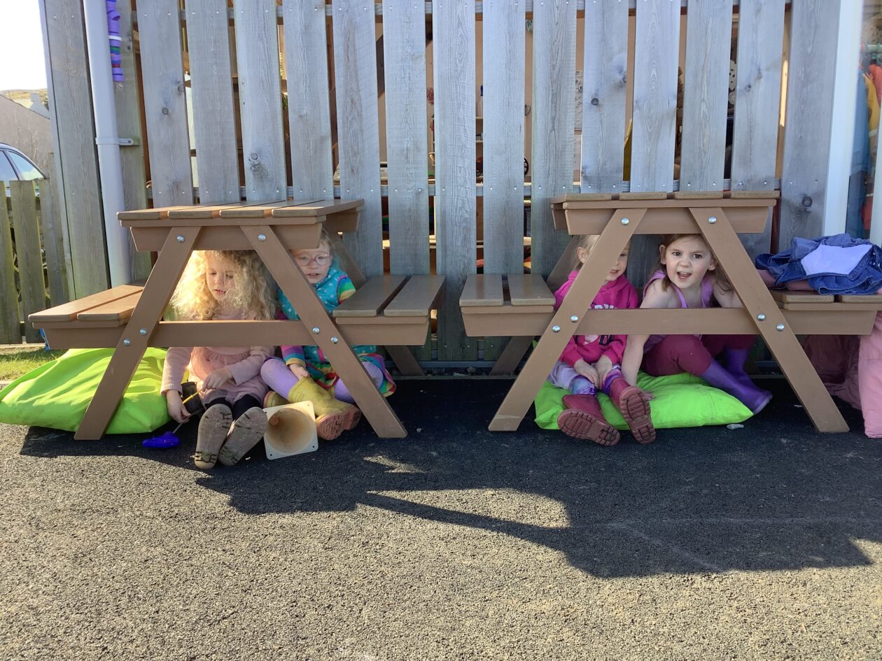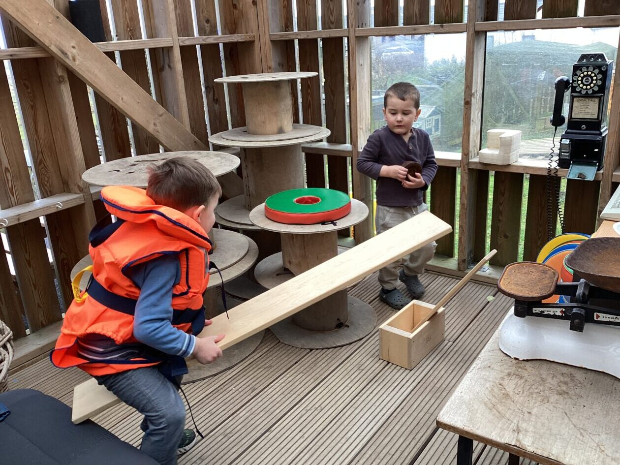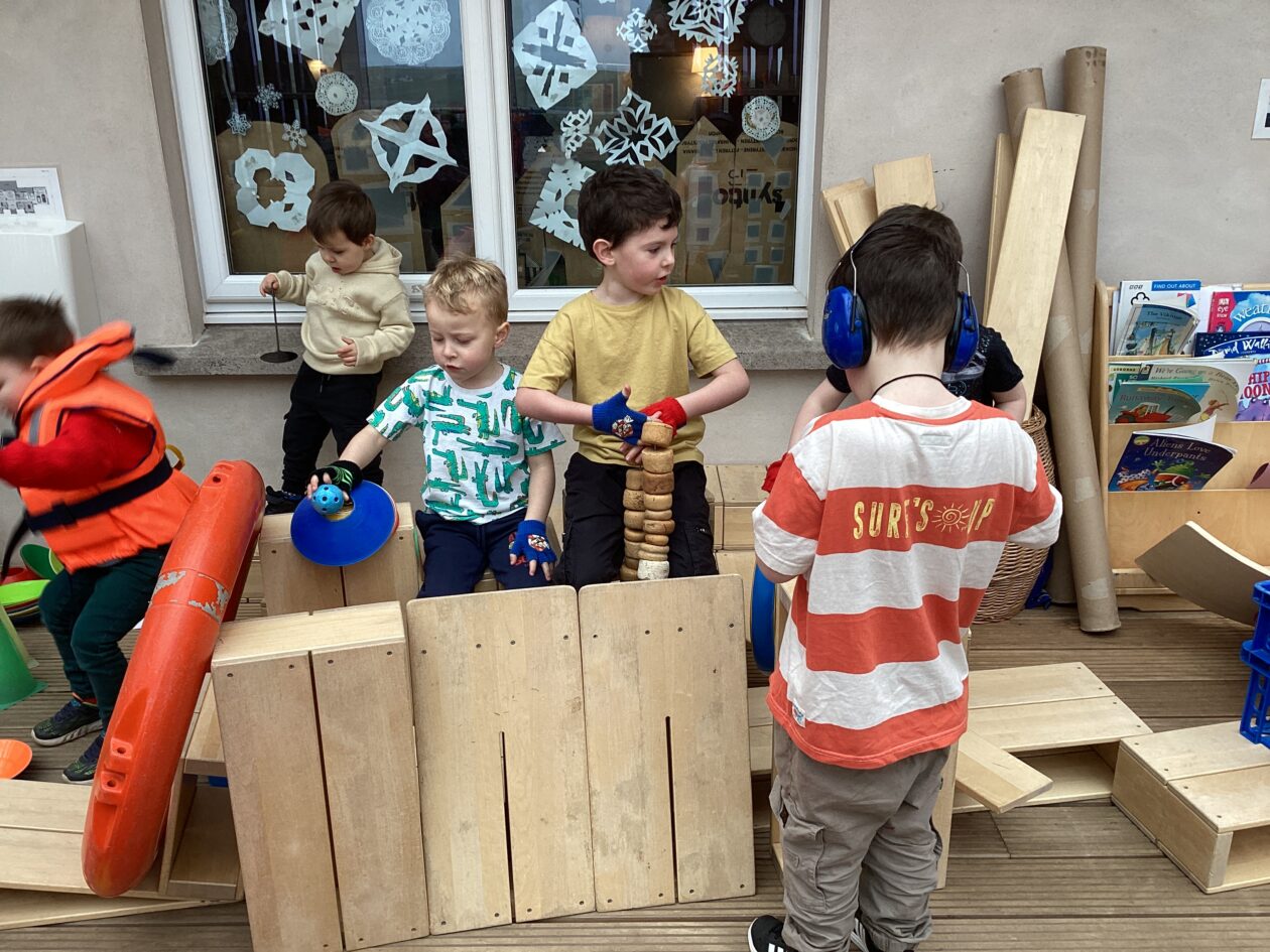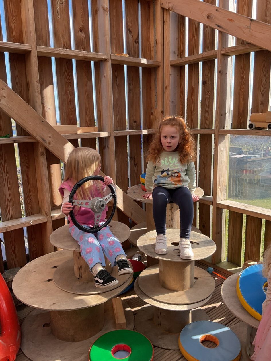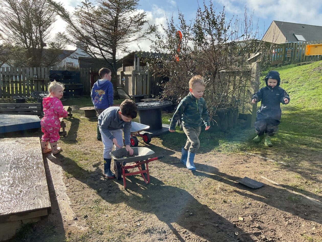 The outdoor room is always a popular choice and a great place to observe schemas (a repeated action used to explore and test theories in play). The bairns have used positioning, transporting, trajectory, enveloping, rotation and enclosure schemas in their play this week. They made paper aeroplanes and then built a platform to launch their planes from, watching how far they flew. They have also been engaged in imaginative play using the large hollow blocks and cable drums as fishing boats. “He is da een dat goes in da water. He is da fishing een and I’m da Captain.”