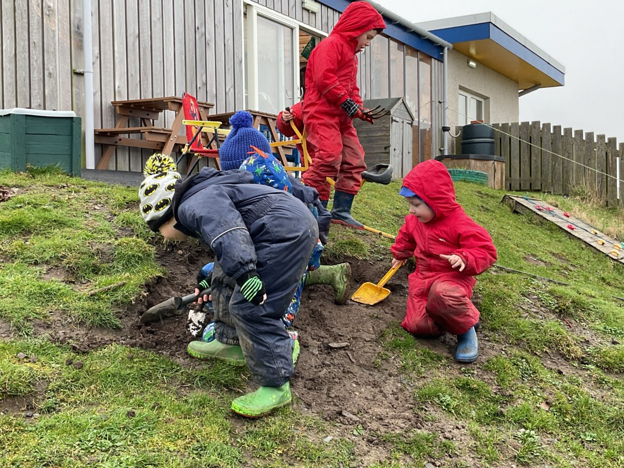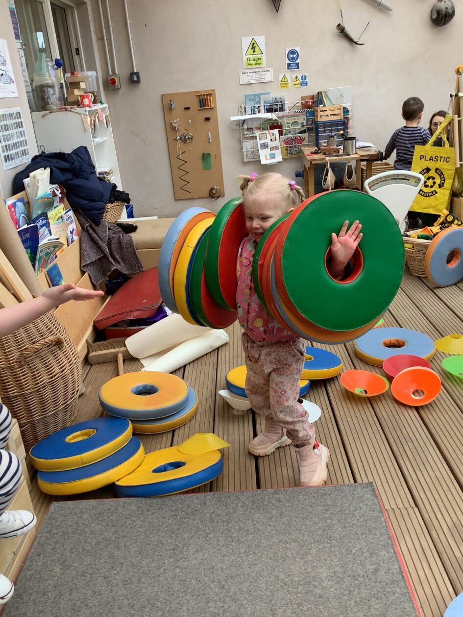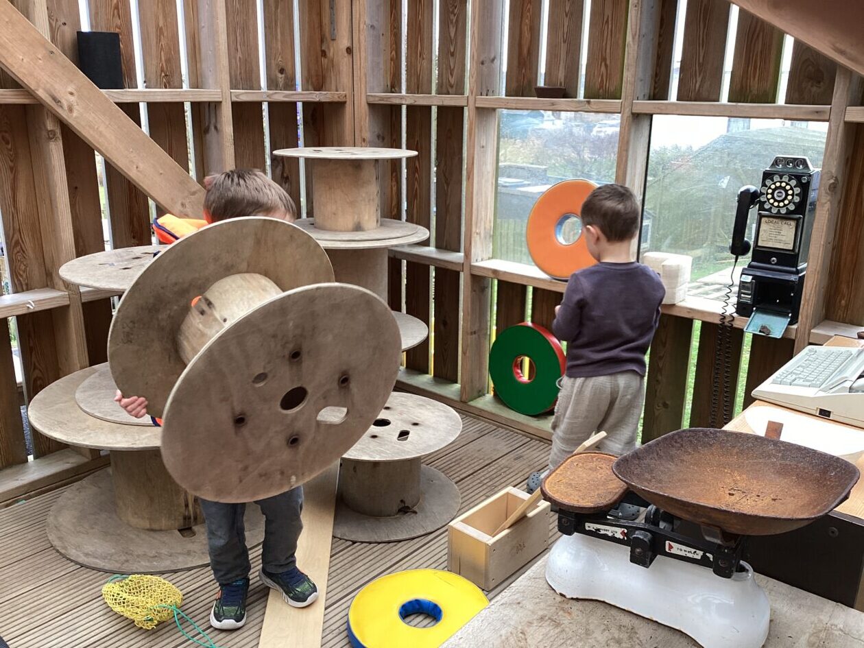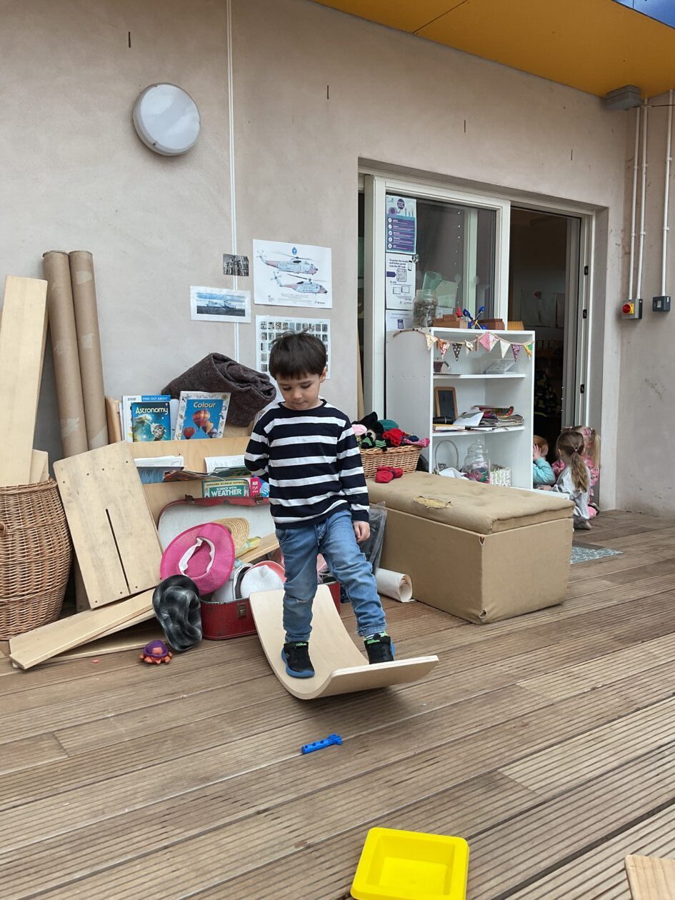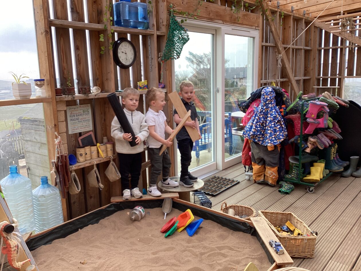 The outdoor room is always a popular choice and a great place to observe schemas (a repeated action used to explore and test theories in play). The bairns have used positioning, transporting, trajectory, enveloping, rotation and enclosure schemas in their play this week. They made paper aeroplanes and then built a platform to launch their planes from, watching how far they flew. They have also been engaged in imaginative play using the large hollow blocks and cable drums as fishing boats. “He is da een dat goes in da water. He is da fishing een and I’m da Captain.”