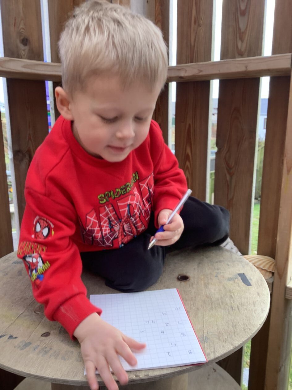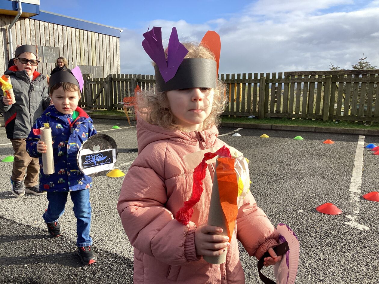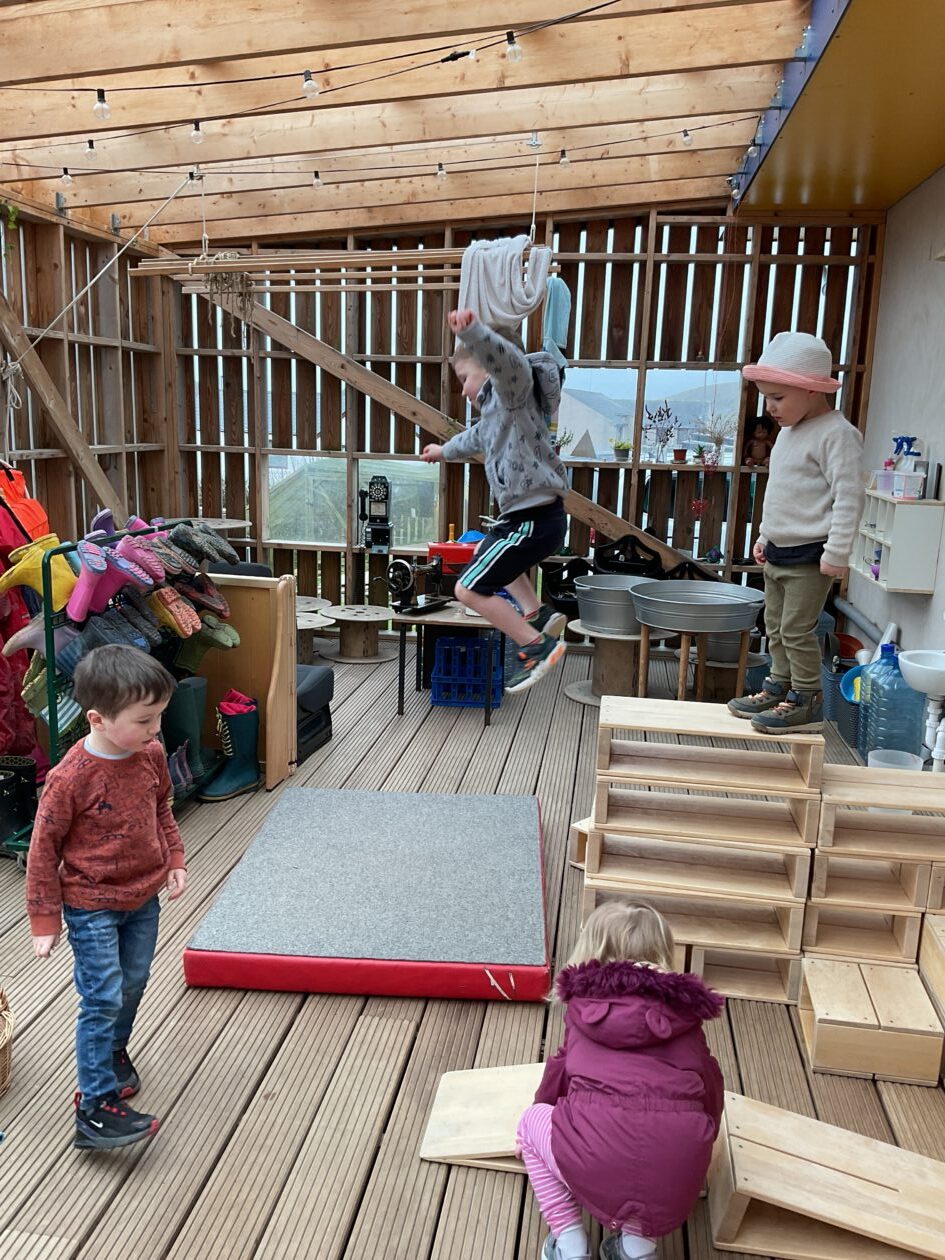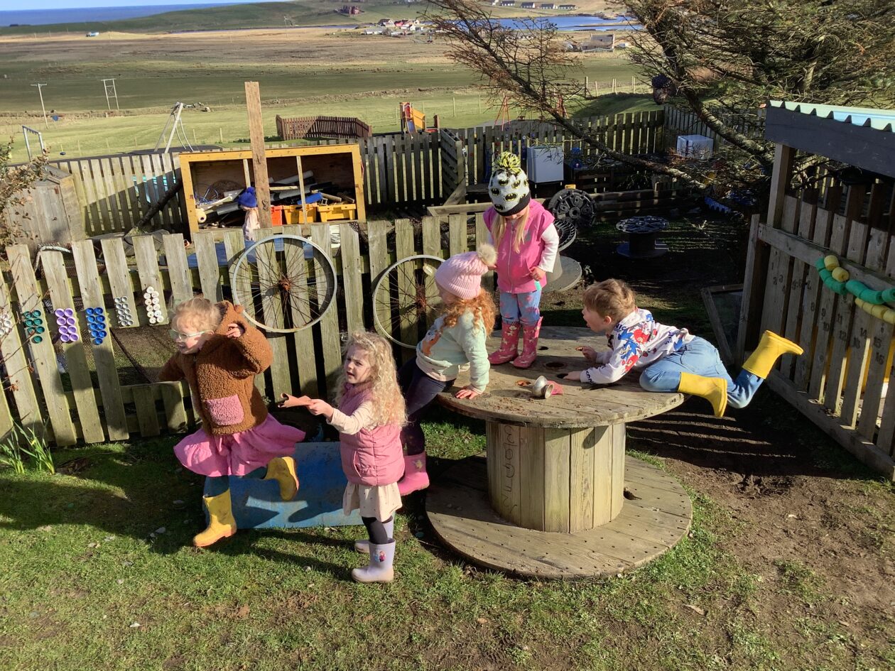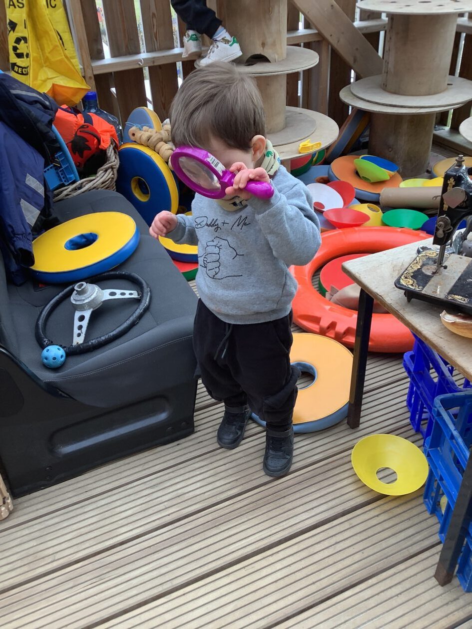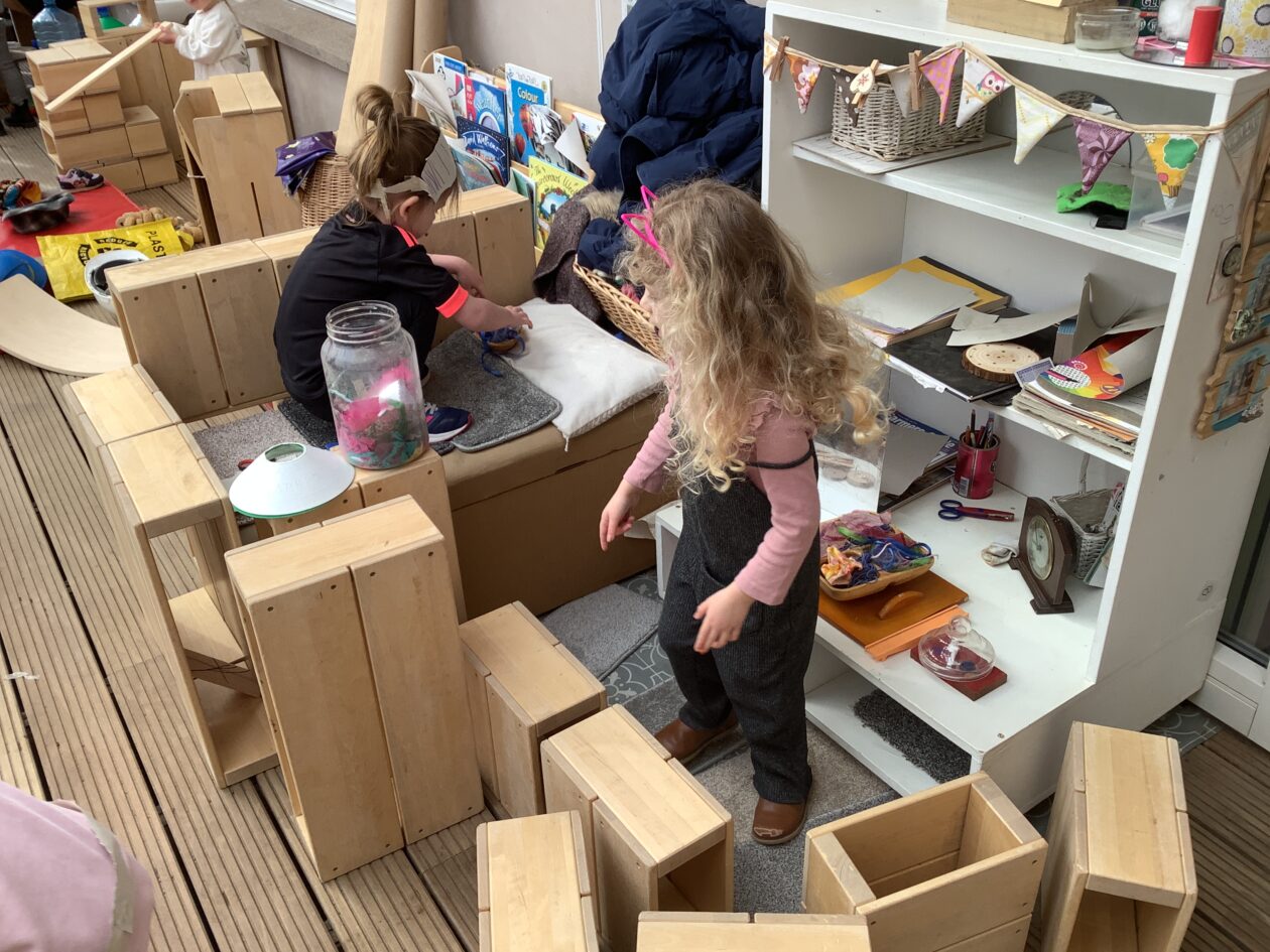 The outdoor room is always a popular choice and a great place to observe schemas (a repeated action used to explore and test theories in play). The bairns have used positioning, transporting, trajectory, enveloping, rotation and enclosure schemas in their play this week. They made paper aeroplanes and then built a platform to launch their planes from, watching how far they flew. They have also been engaged in imaginative play using the large hollow blocks and cable drums as fishing boats. “He is da een dat goes in da water. He is da fishing een and I’m da Captain.”