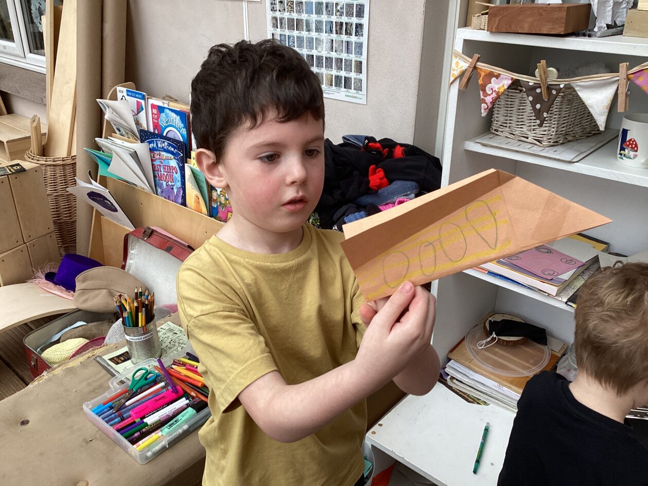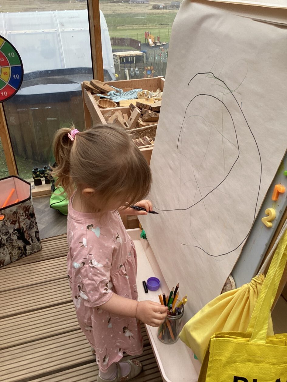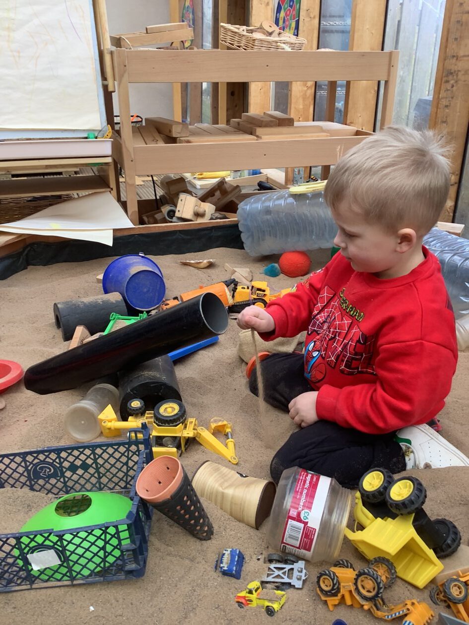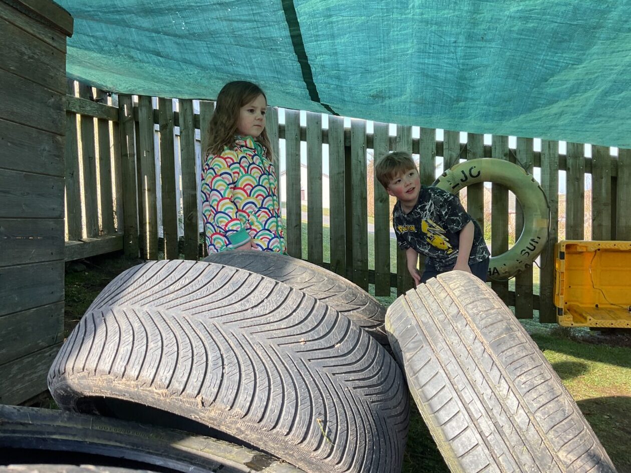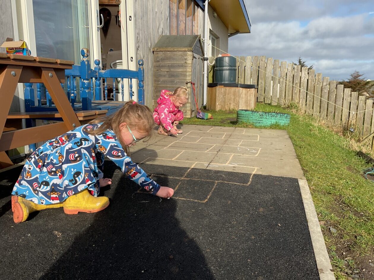The outdoor room is always a popular choice and a great place to observe schemas (a repeated action used to explore and test theories in play). The bairns have used positioning, transporting, trajectory, enveloping, rotation and enclosure schemas in their play this week. They made paper aeroplanes and then built a platform to launch their planes from, watching how far they flew. They have also been engaged in imaginative play using the large hollow blocks and cable drums as fishing boats. “He is da een dat goes in da water. He is da fishing een and I’m da Captain.”