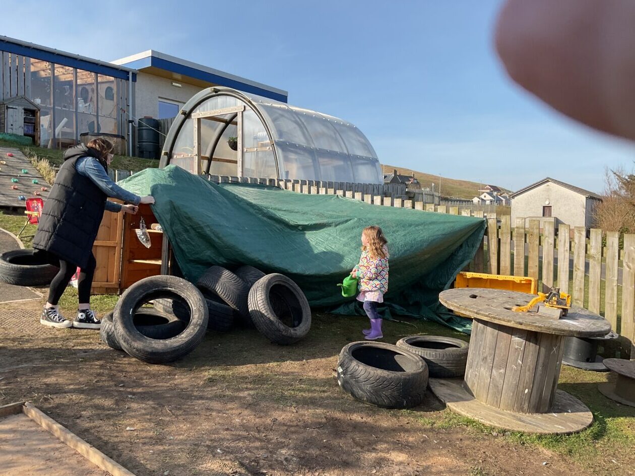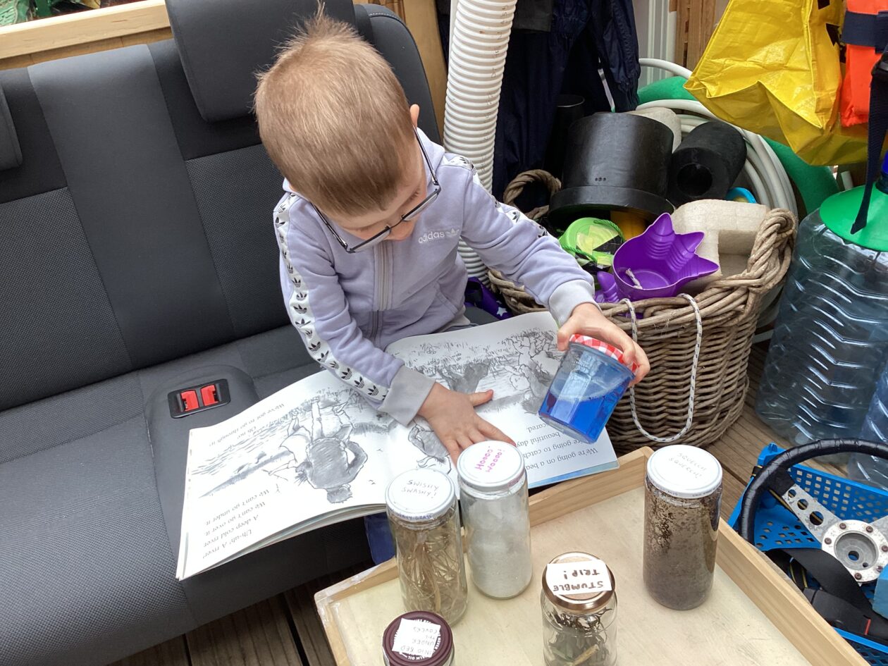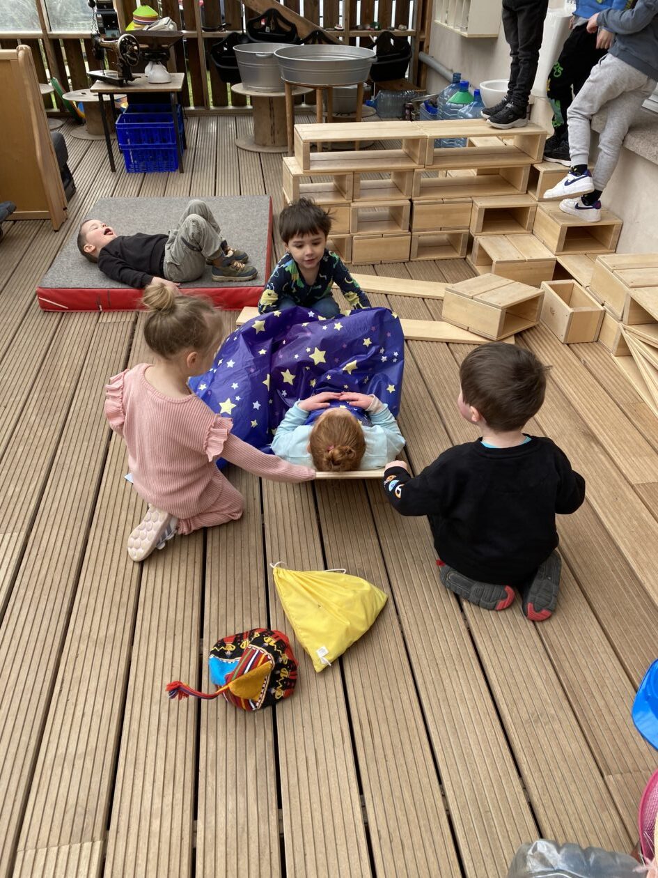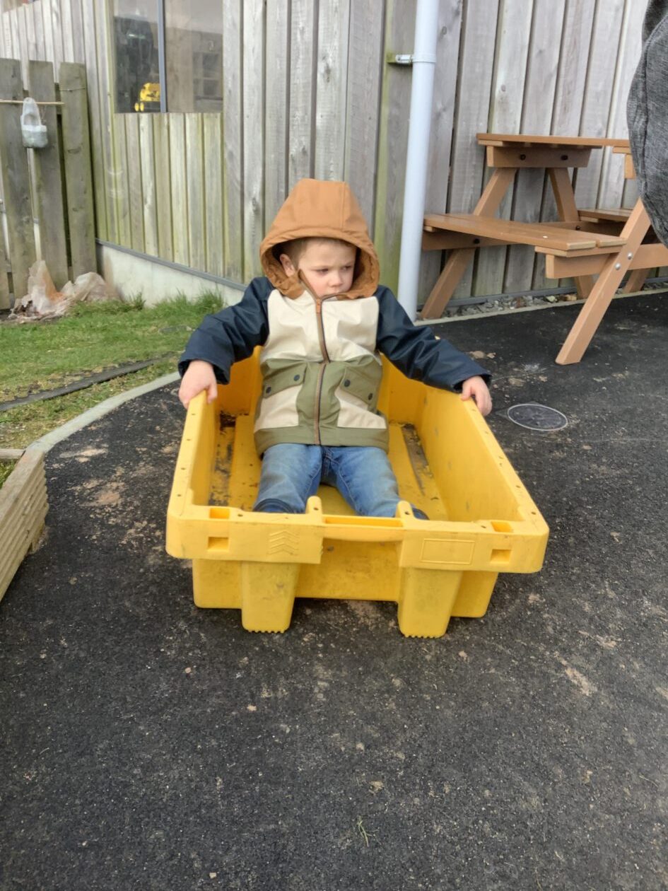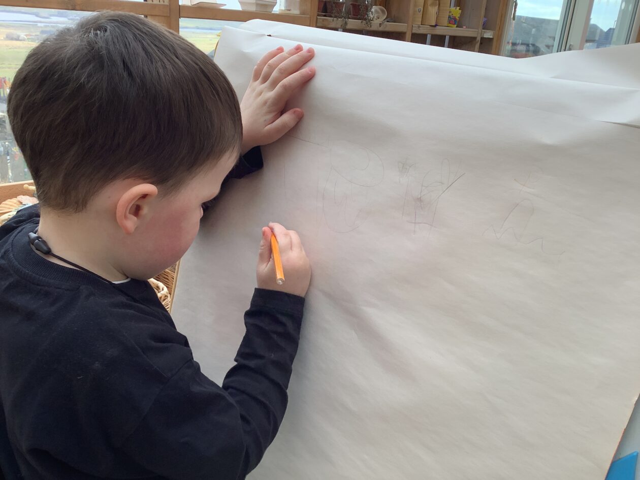 The outdoor room is always a popular choice and a great place to observe schemas (a repeated action used to explore and test theories in play). The bairns have used positioning, transporting, trajectory, enveloping, rotation and enclosure schemas in their play this week. They made paper aeroplanes and then built a platform to launch their planes from, watching how far they flew. They have also been engaged in imaginative play using the large hollow blocks and cable drums as fishing boats. “He is da een dat goes in da water. He is da fishing een and I’m da Captain.”