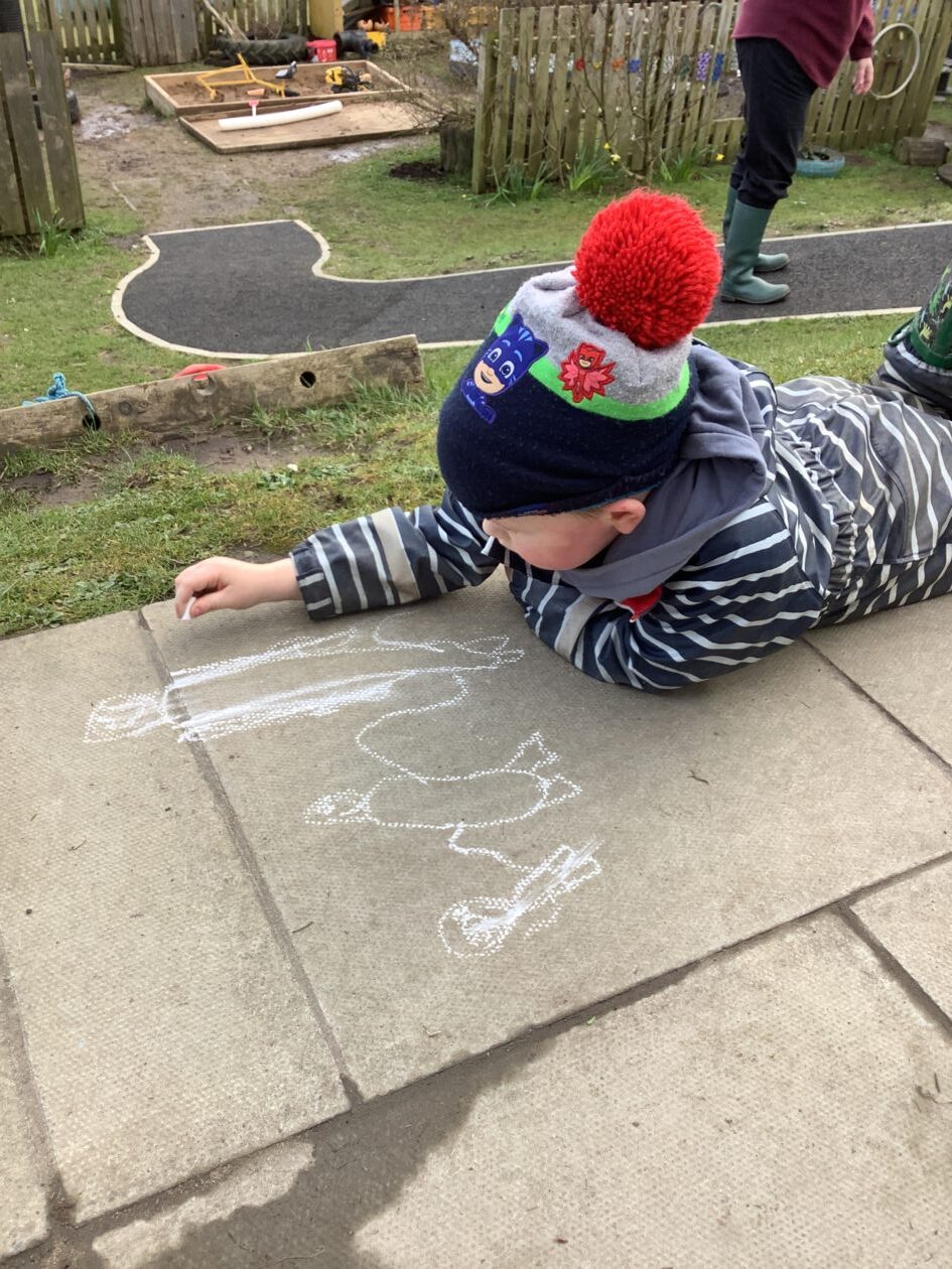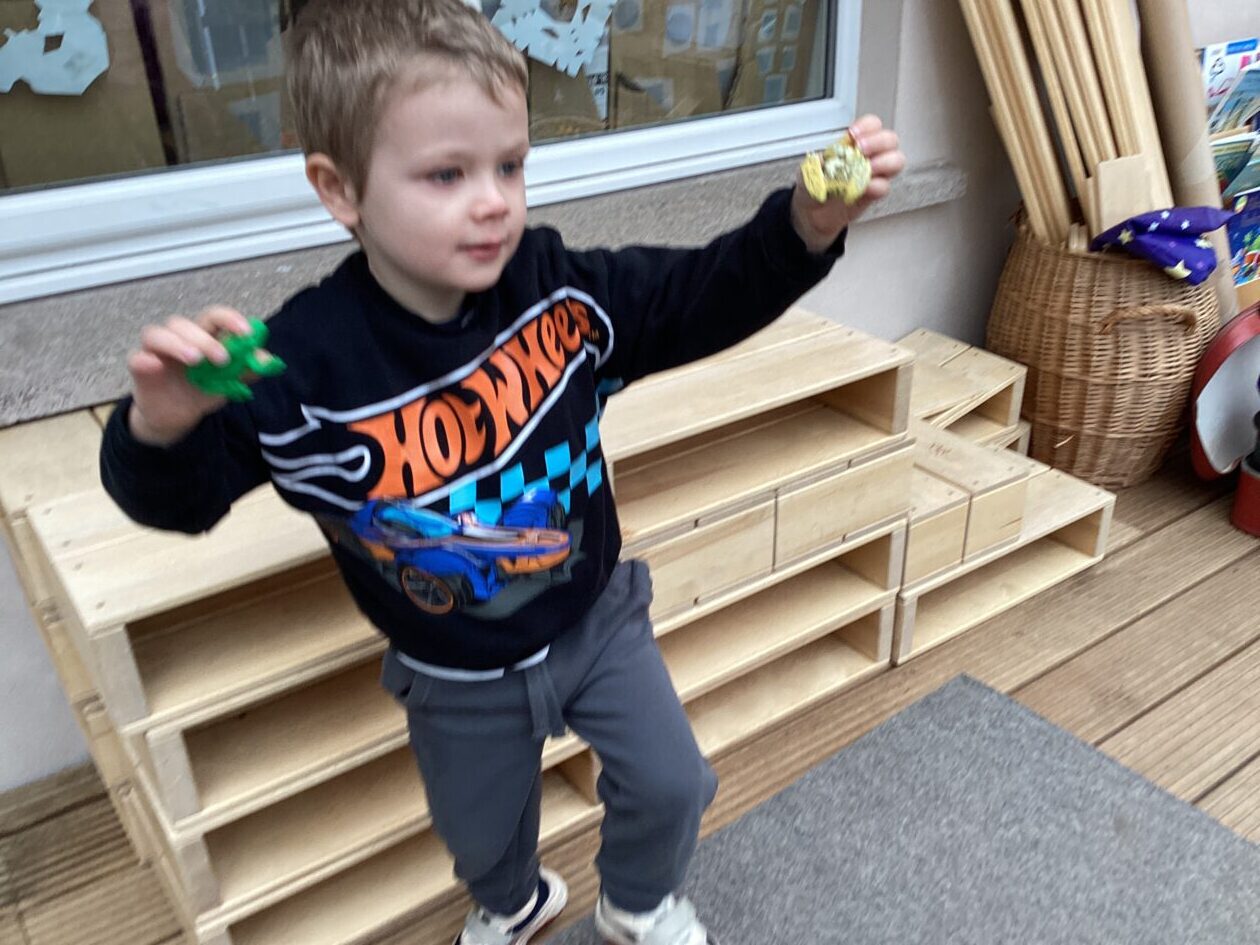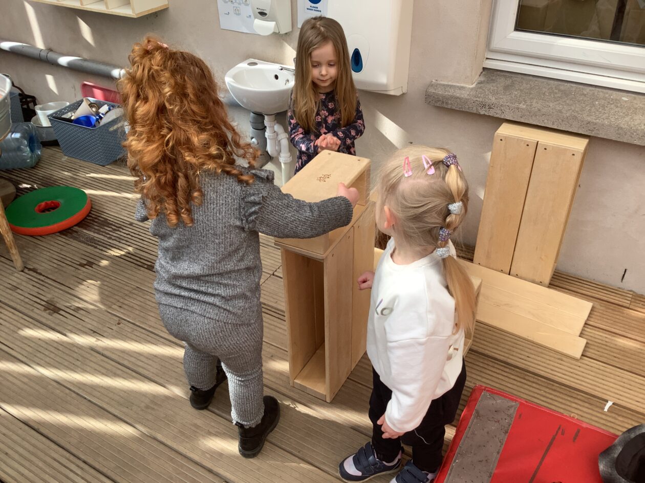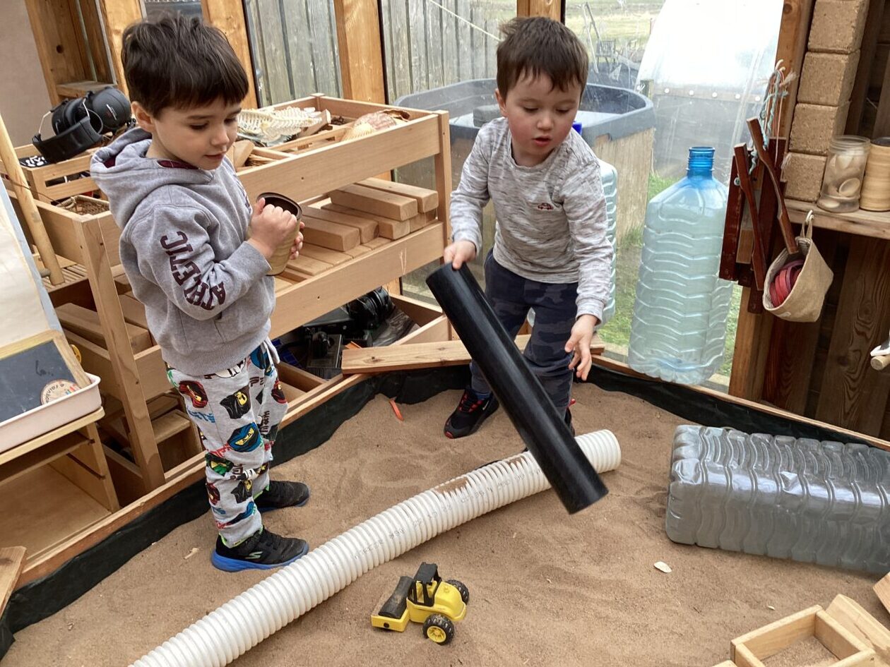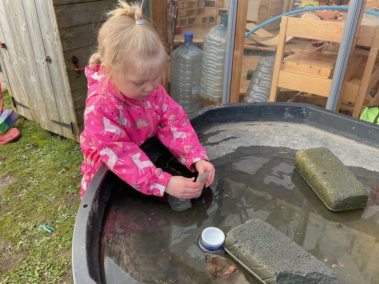 The outdoor room is always a popular choice and a great place to observe schemas (a repeated action used to explore and test theories in play). The bairns have used positioning, transporting, trajectory, enveloping, rotation and enclosure schemas in their play this week. They made paper aeroplanes and then built a platform to launch their planes from, watching how far they flew. They have also been engaged in imaginative play using the large hollow blocks and cable drums as fishing boats. “He is da een dat goes in da water. He is da fishing een and I’m da Captain.”