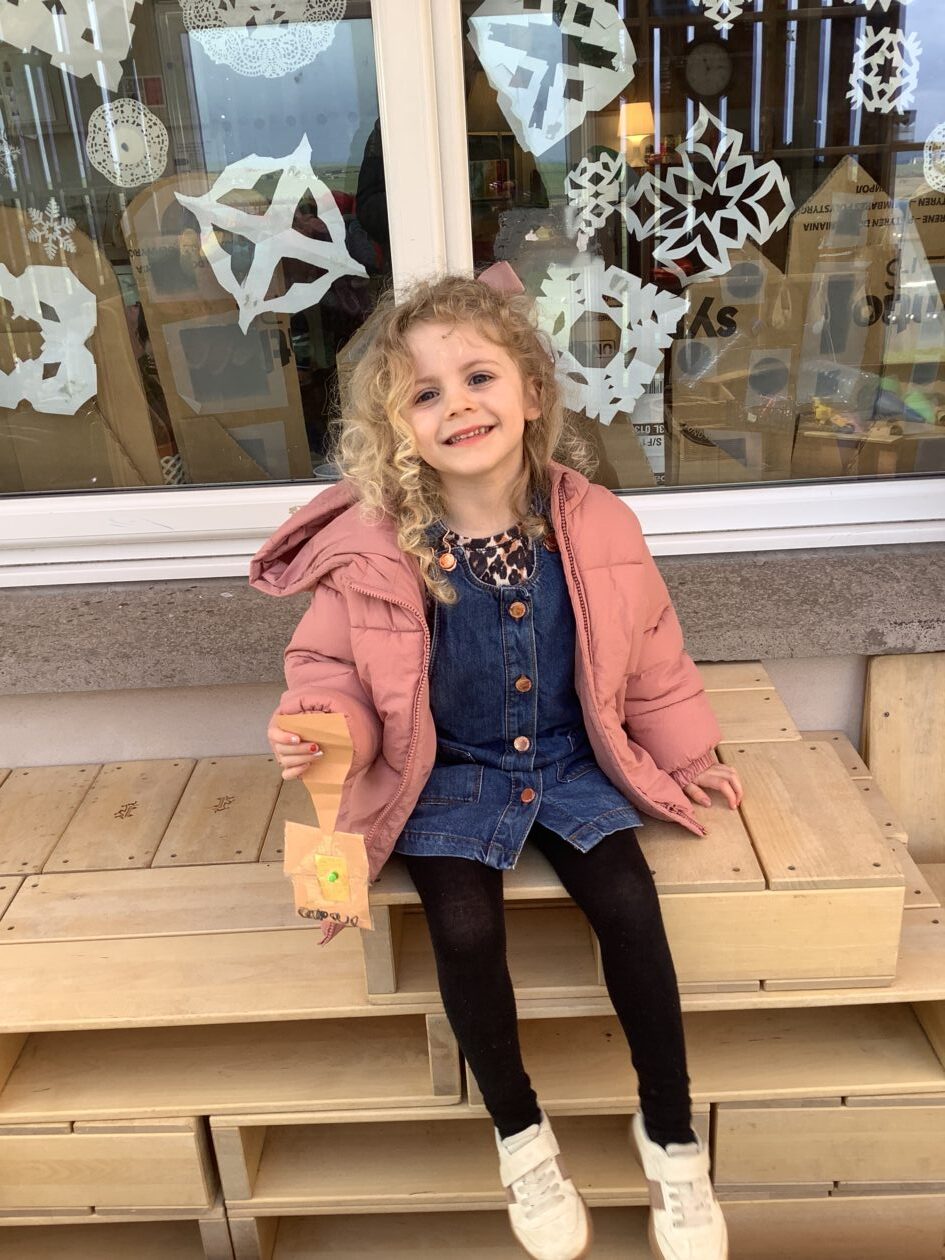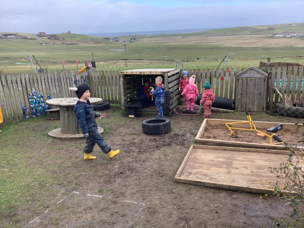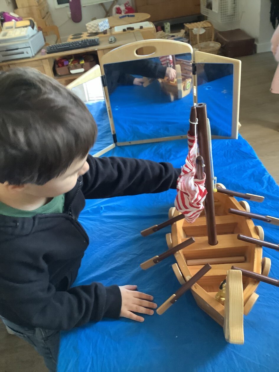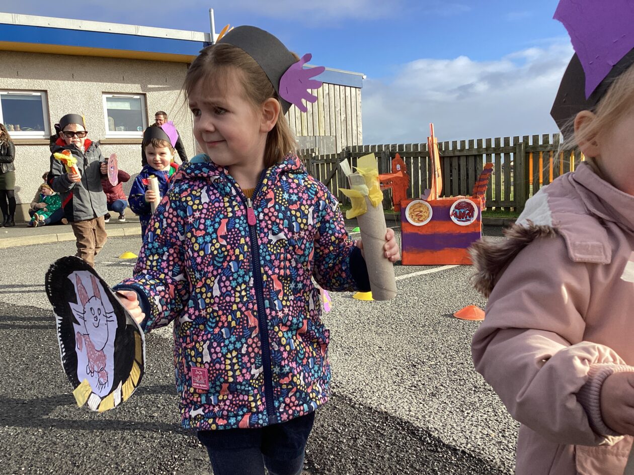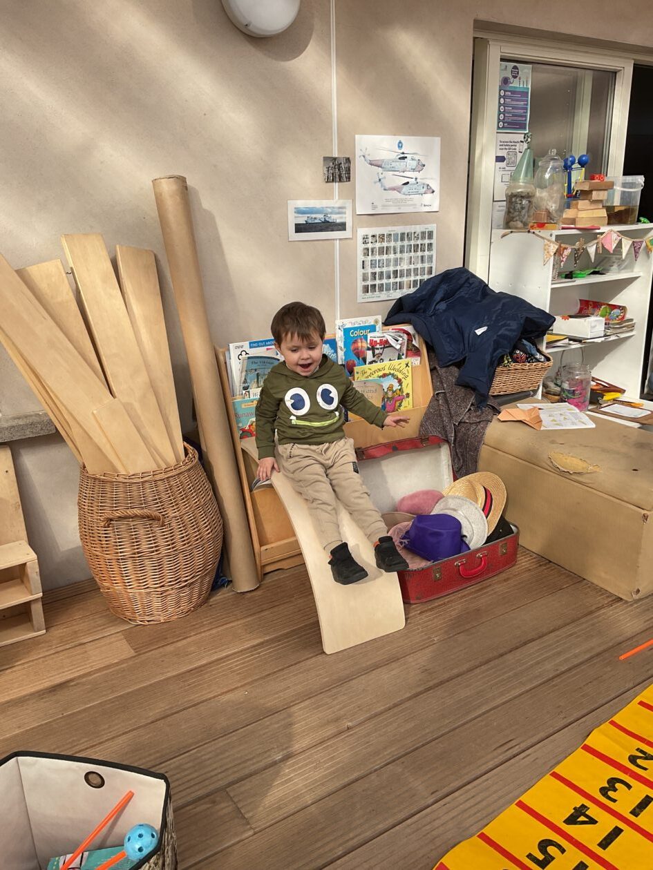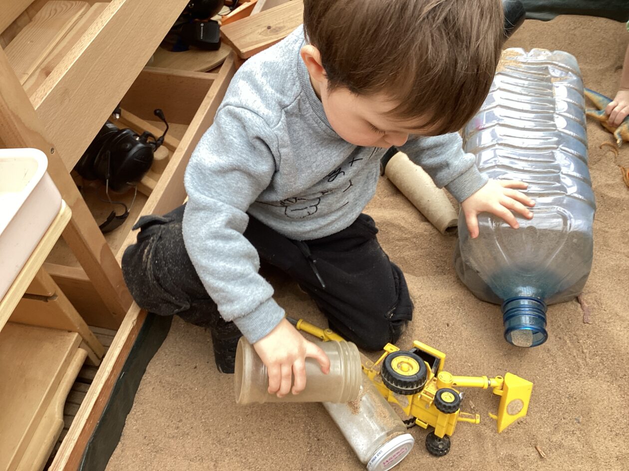 The outdoor room is always a popular choice and a great place to observe schemas (a repeated action used to explore and test theories in play). The bairns have used positioning, transporting, trajectory, enveloping, rotation and enclosure schemas in their play this week. They made paper aeroplanes and then built a platform to launch their planes from, watching how far they flew. They have also been engaged in imaginative play using the large hollow blocks and cable drums as fishing boats. “He is da een dat goes in da water. He is da fishing een and I’m da Captain.”