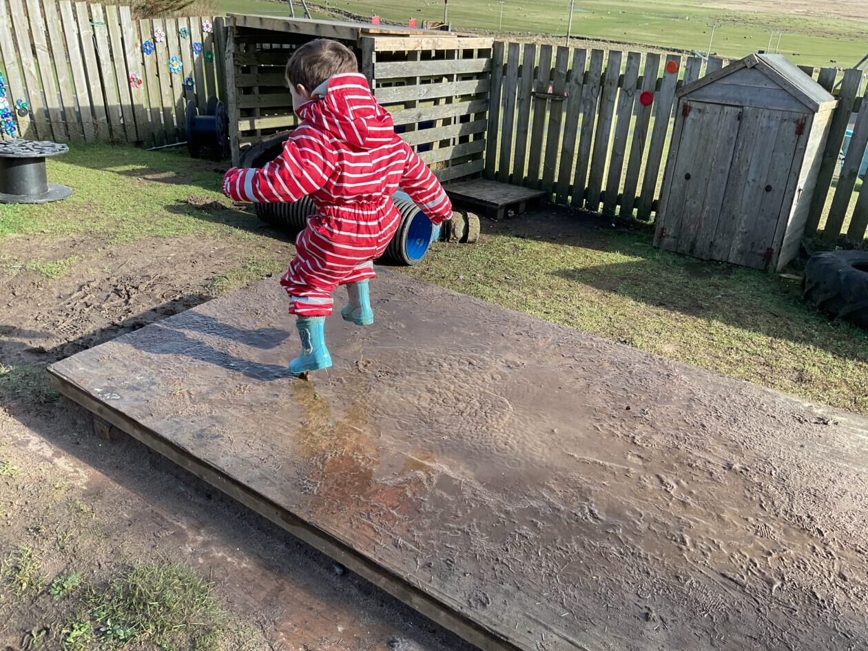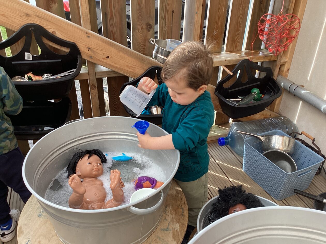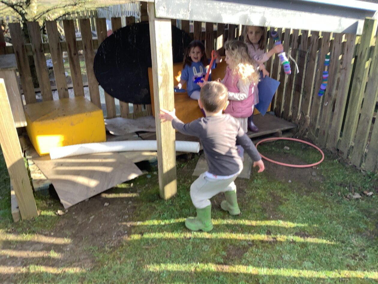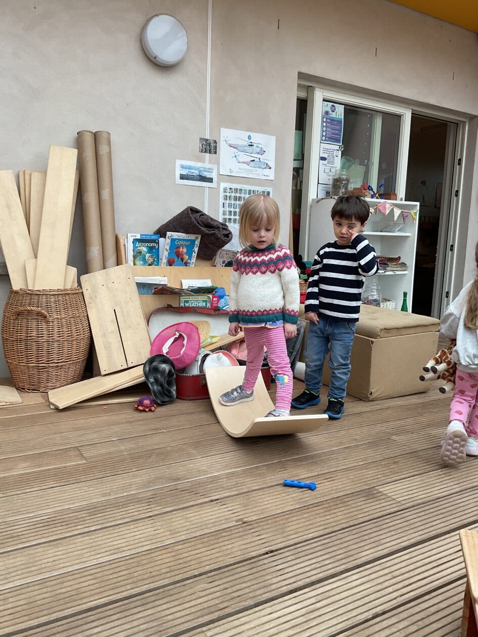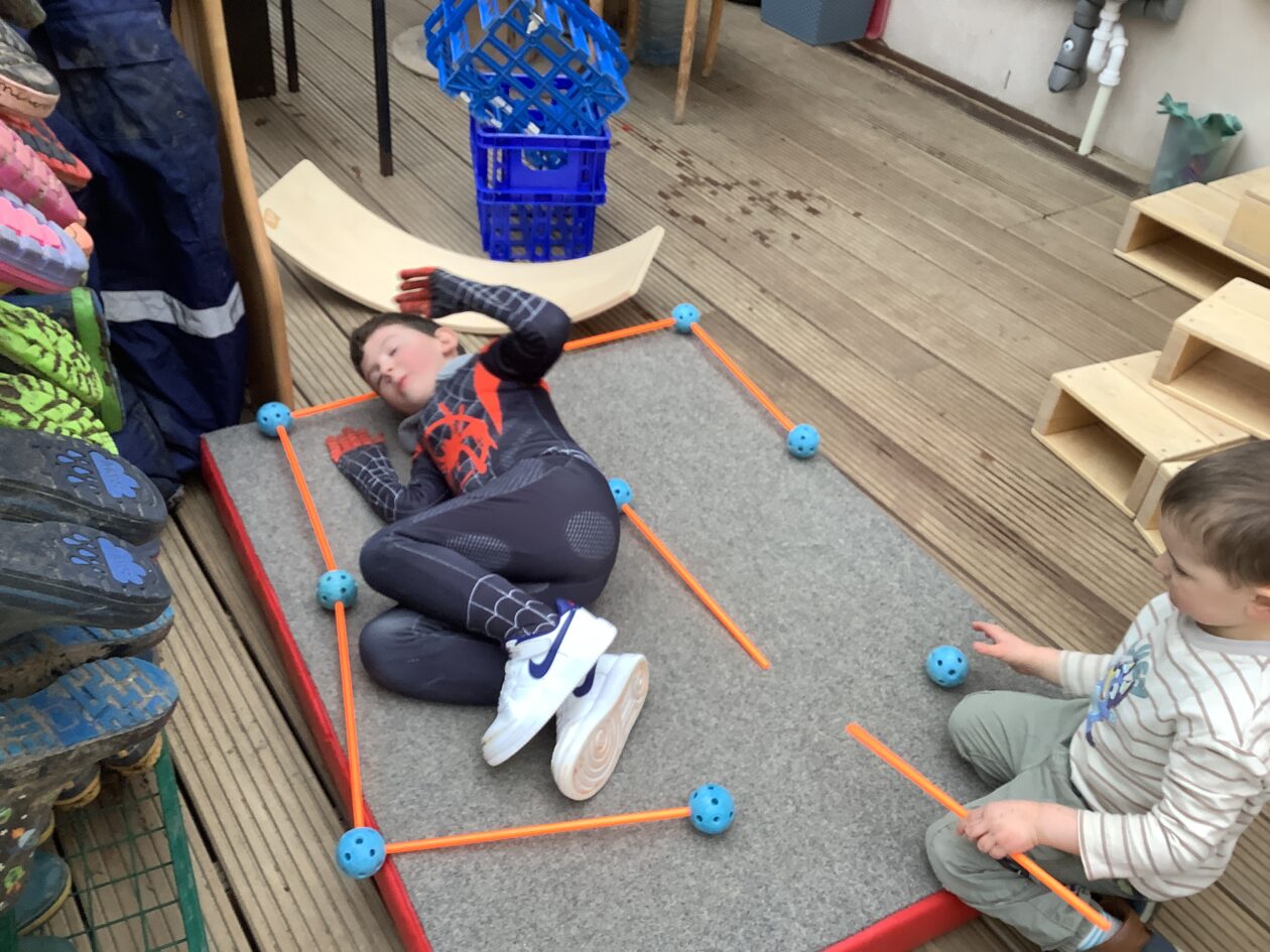 The outdoor room is always a popular choice and a great place to observe schemas (a repeated action used to explore and test theories in play). The bairns have used positioning, transporting, trajectory, enveloping, rotation and enclosure schemas in their play this week. They made paper aeroplanes and then built a platform to launch their planes from, watching how far they flew. They have also been engaged in imaginative play using the large hollow blocks and cable drums as fishing boats. “He is da een dat goes in da water. He is da fishing een and I’m da Captain.”