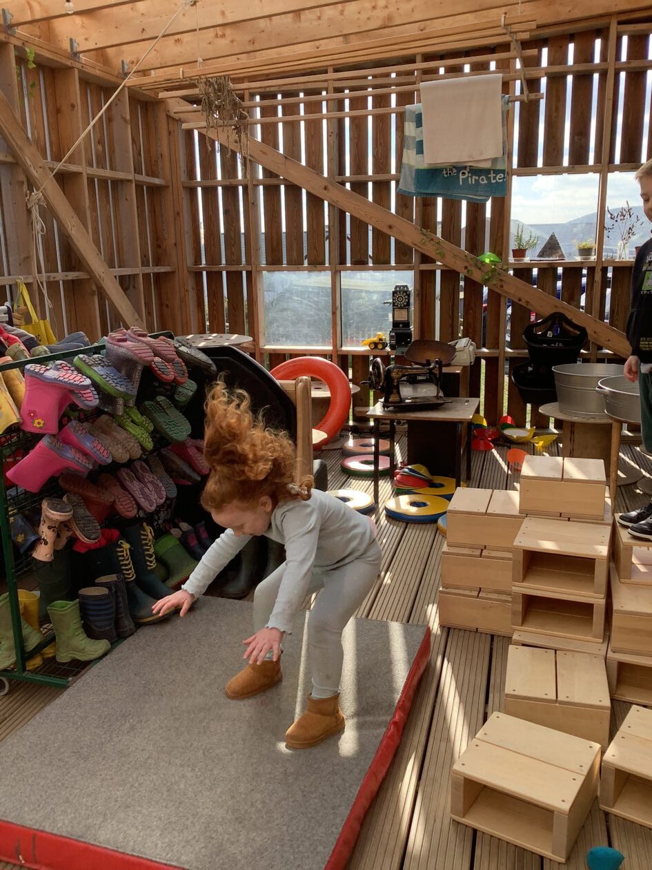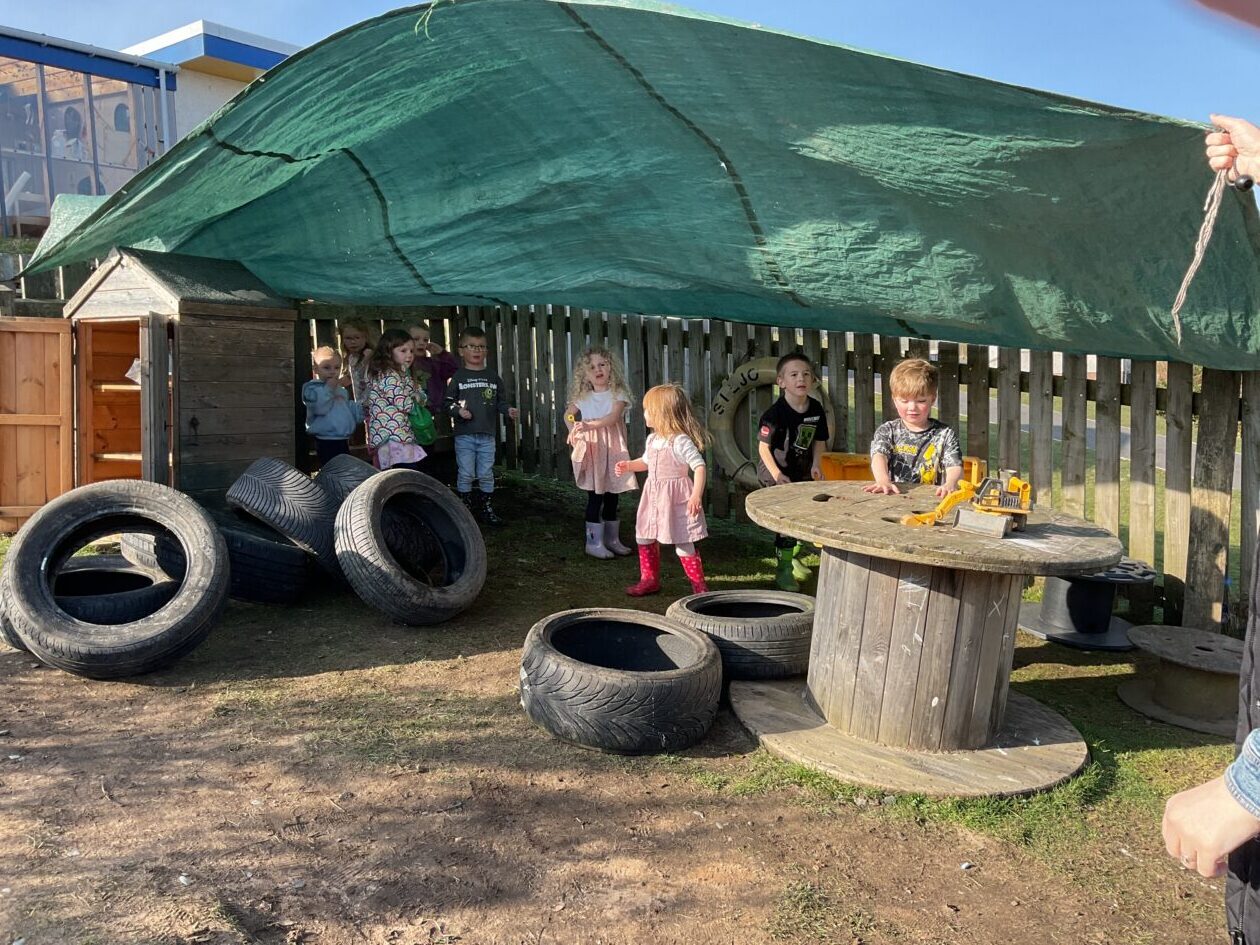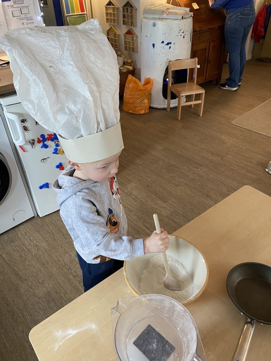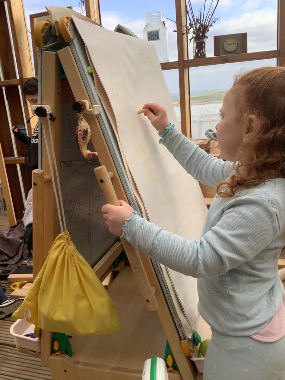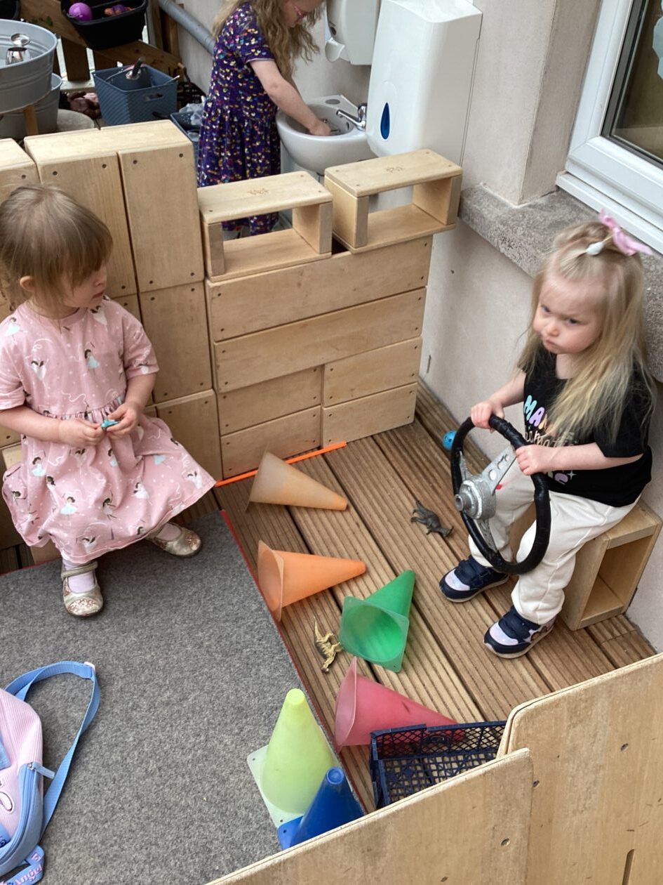 The outdoor room is always a popular choice and a great place to observe schemas (a repeated action used to explore and test theories in play). The bairns have used positioning, transporting, trajectory, enveloping, rotation and enclosure schemas in their play this week. They made paper aeroplanes and then built a platform to launch their planes from, watching how far they flew. They have also been engaged in imaginative play using the large hollow blocks and cable drums as fishing boats. “He is da een dat goes in da water. He is da fishing een and I’m da Captain.”