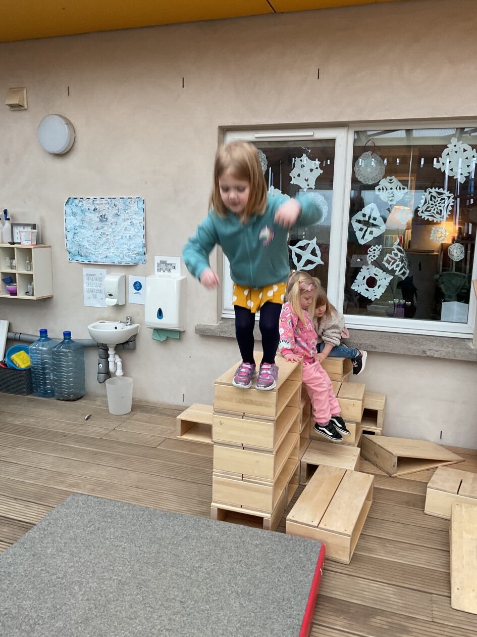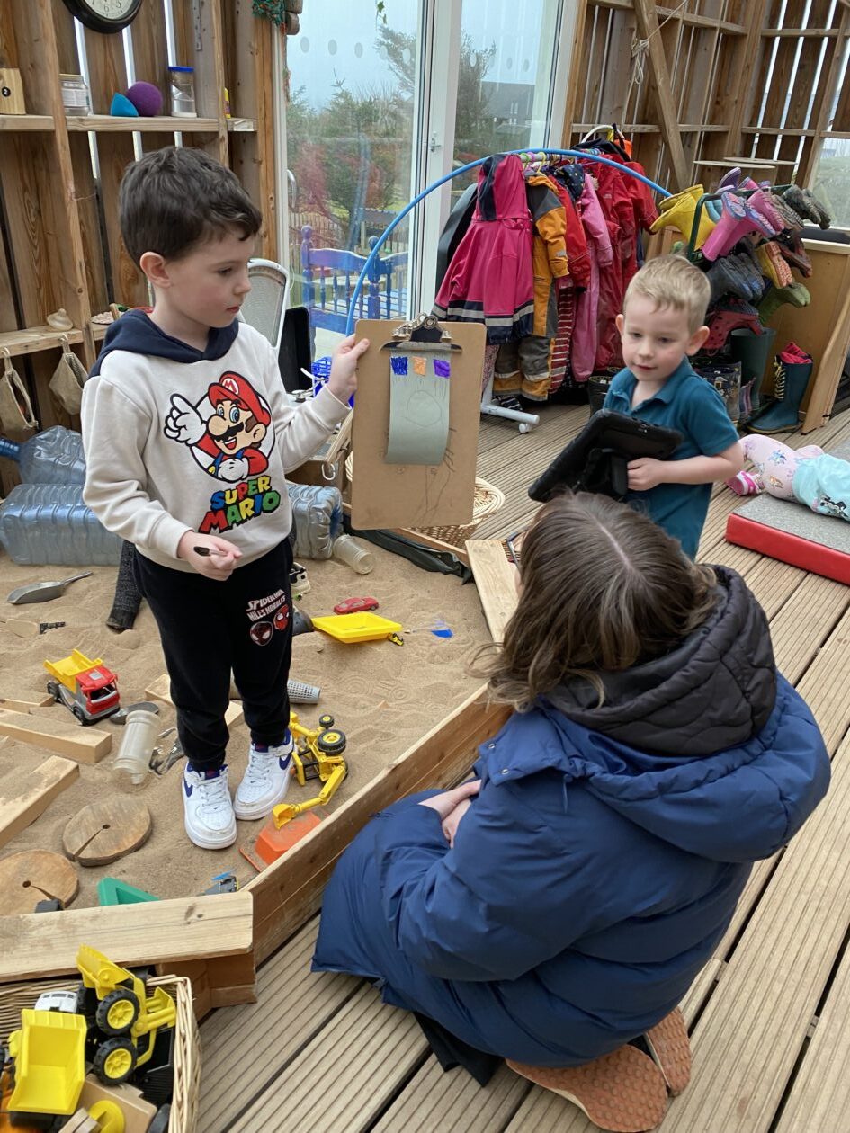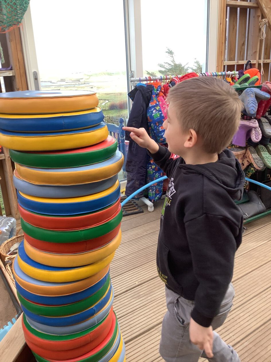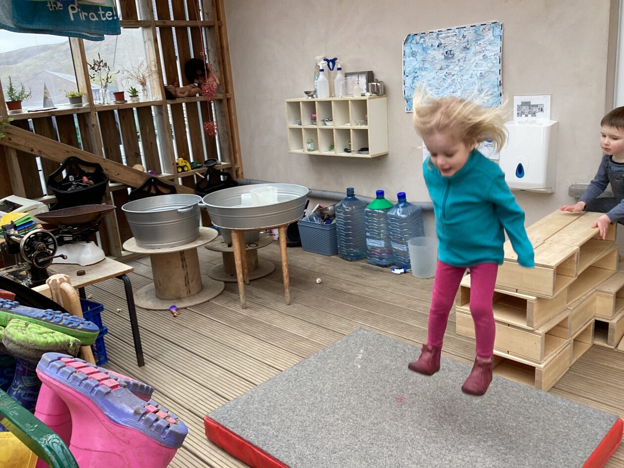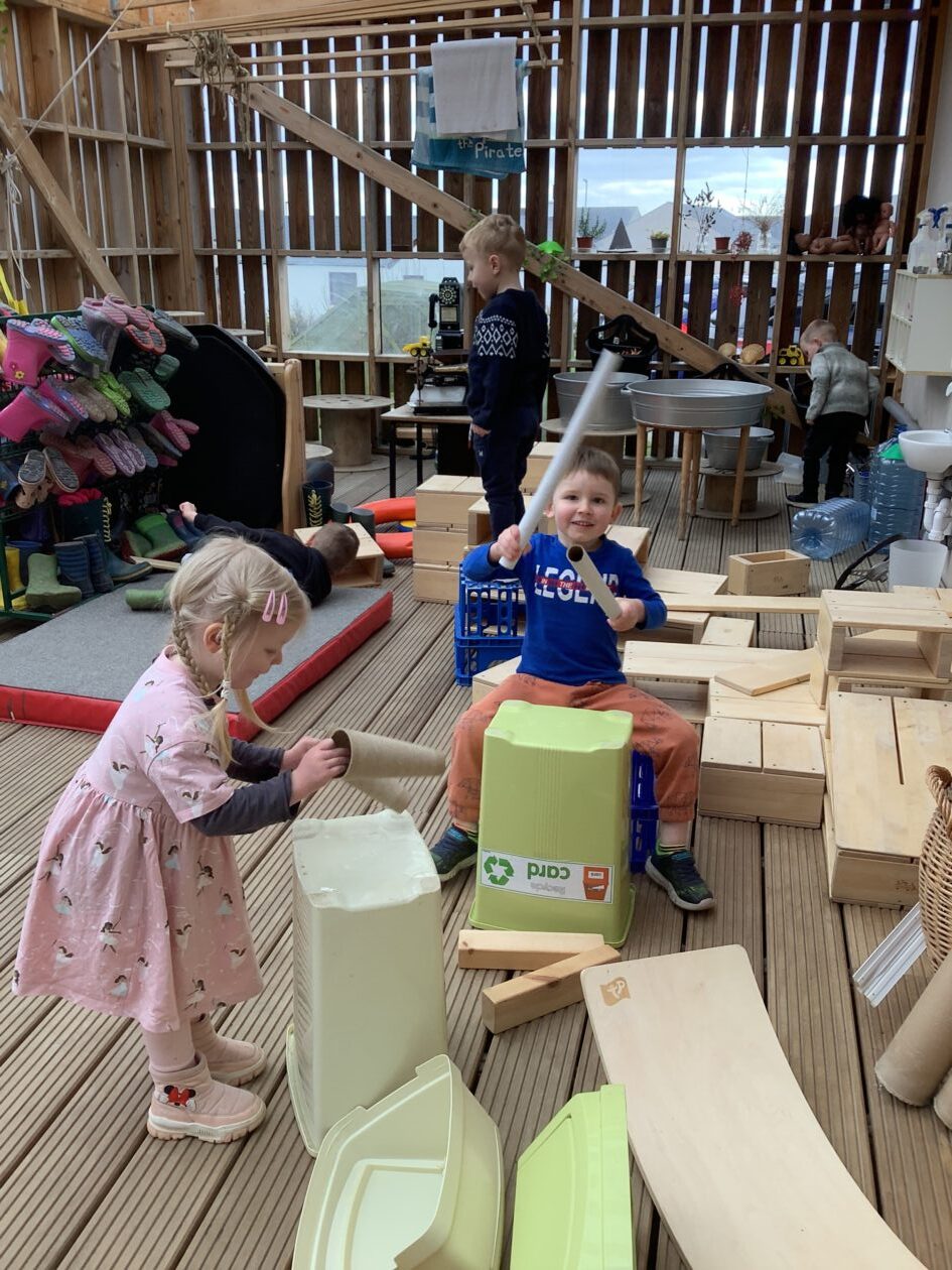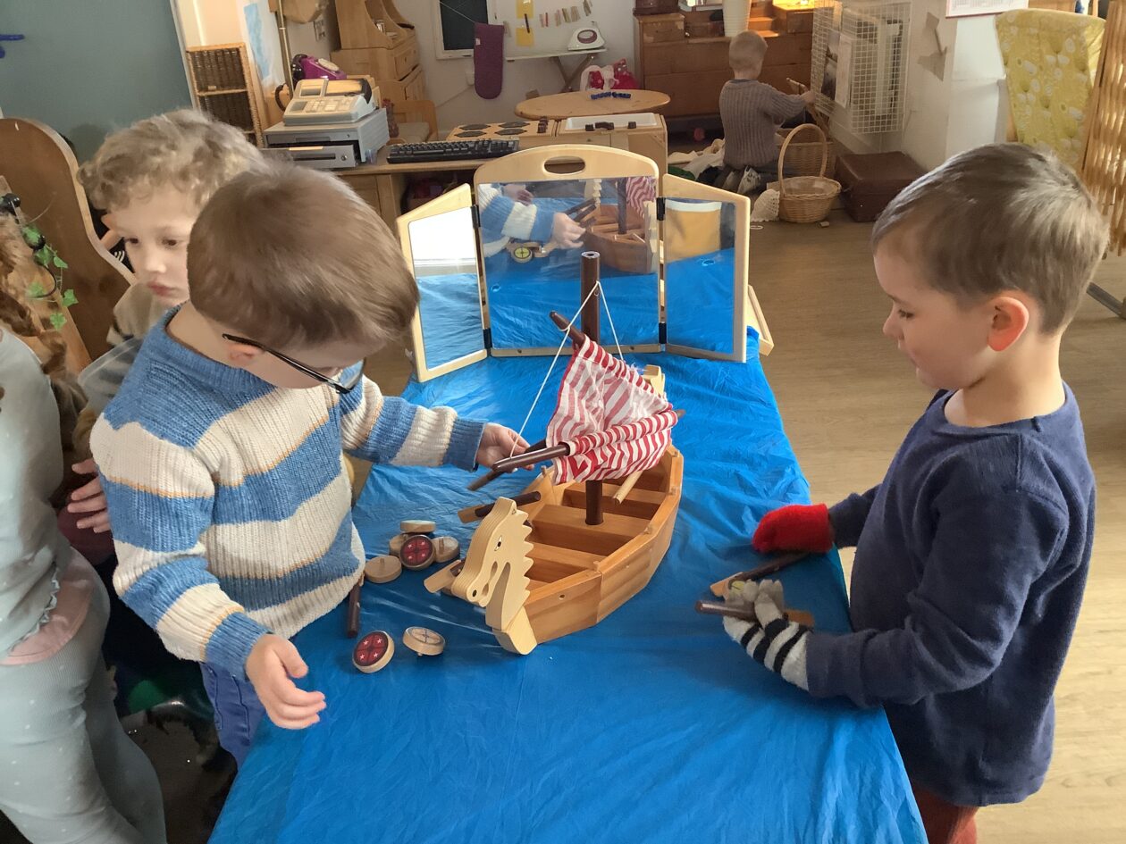 The outdoor room is always a popular choice and a great place to observe schemas (a repeated action used to explore and test theories in play). The bairns have used positioning, transporting, trajectory, enveloping, rotation and enclosure schemas in their play this week. They made paper aeroplanes and then built a platform to launch their planes from, watching how far they flew. They have also been engaged in imaginative play using the large hollow blocks and cable drums as fishing boats. “He is da een dat goes in da water. He is da fishing een and I’m da Captain.”