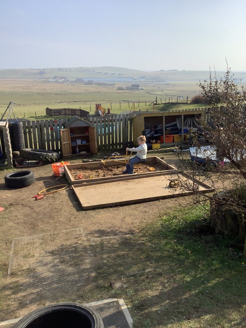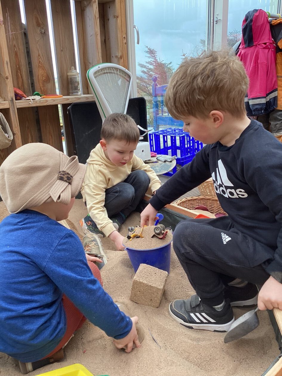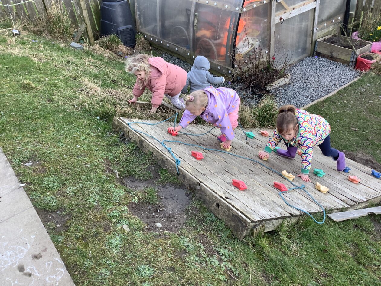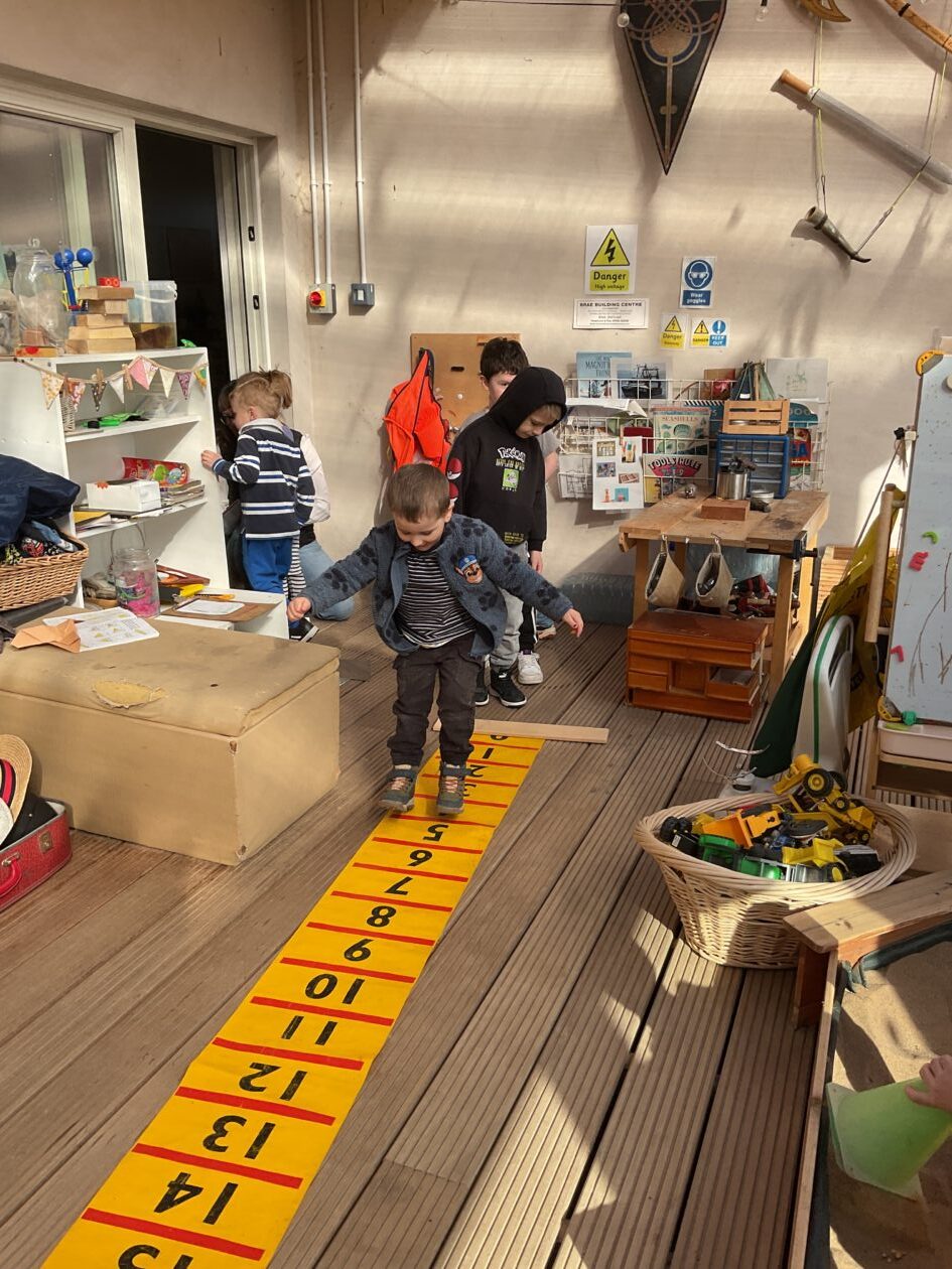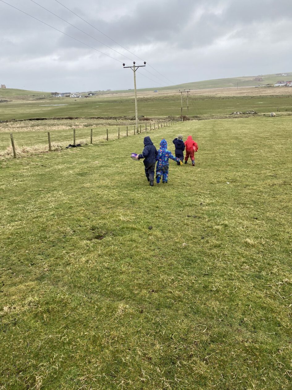 The outdoor room is always a popular choice and a great place to observe schemas (a repeated action used to explore and test theories in play). The bairns have used positioning, transporting, trajectory, enveloping, rotation and enclosure schemas in their play this week. They made paper aeroplanes and then built a platform to launch their planes from, watching how far they flew. They have also been engaged in imaginative play using the large hollow blocks and cable drums as fishing boats. “He is da een dat goes in da water. He is da fishing een and I’m da Captain.”