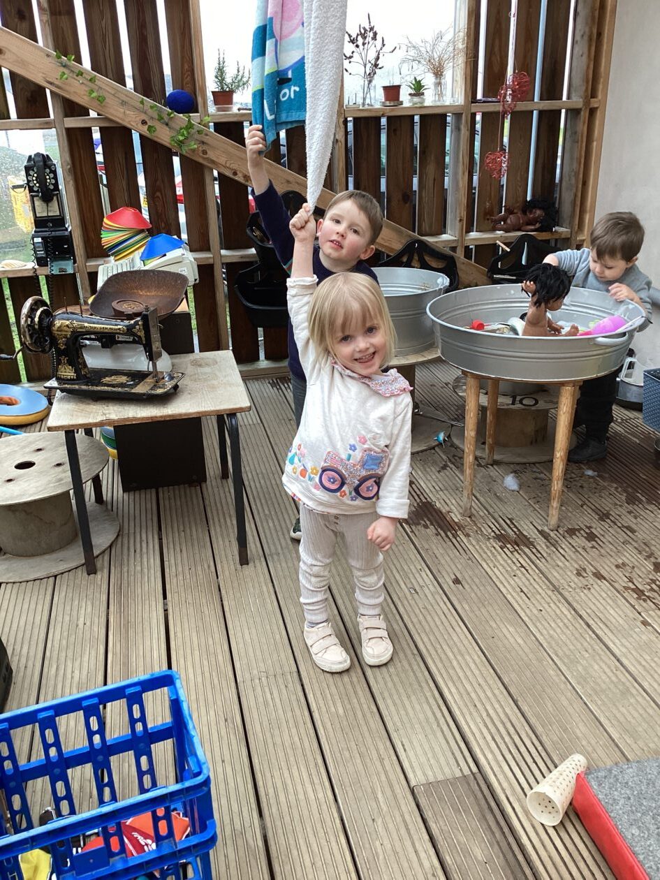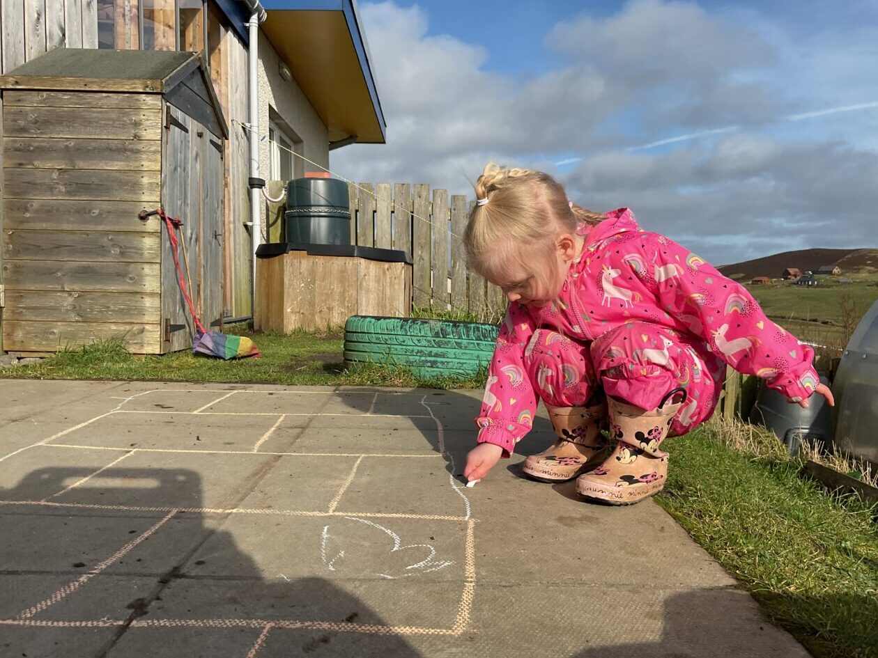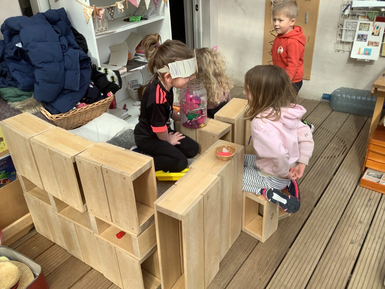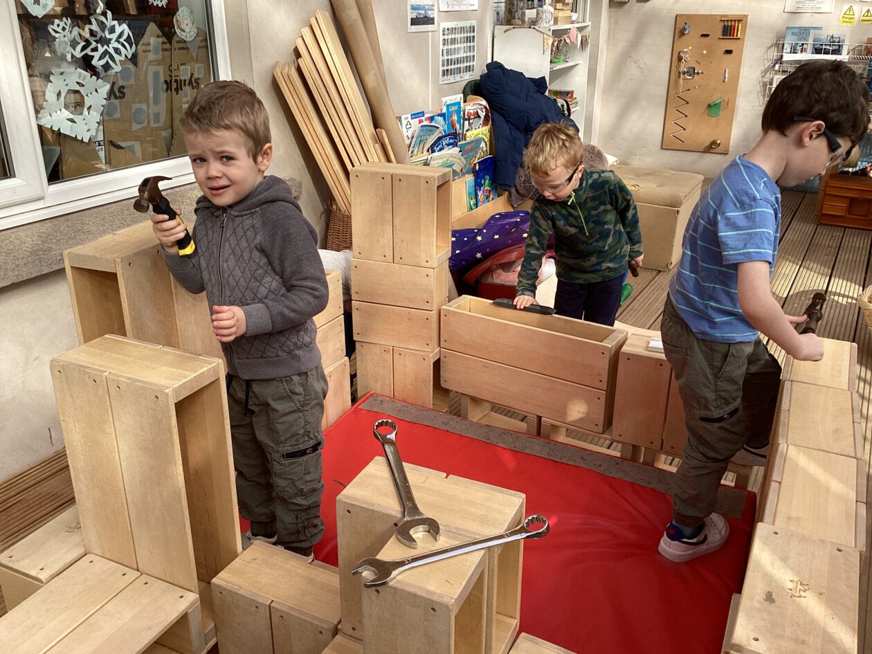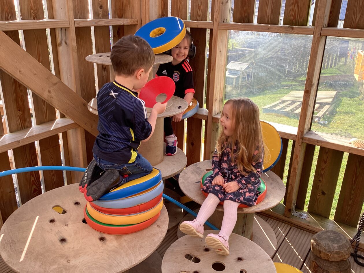 The outdoor room is always a popular choice and a great place to observe schemas (a repeated action used to explore and test theories in play). The bairns have used positioning, transporting, trajectory, enveloping, rotation and enclosure schemas in their play this week. They made paper aeroplanes and then built a platform to launch their planes from, watching how far they flew. They have also been engaged in imaginative play using the large hollow blocks and cable drums as fishing boats. “He is da een dat goes in da water. He is da fishing een and I’m da Captain.”