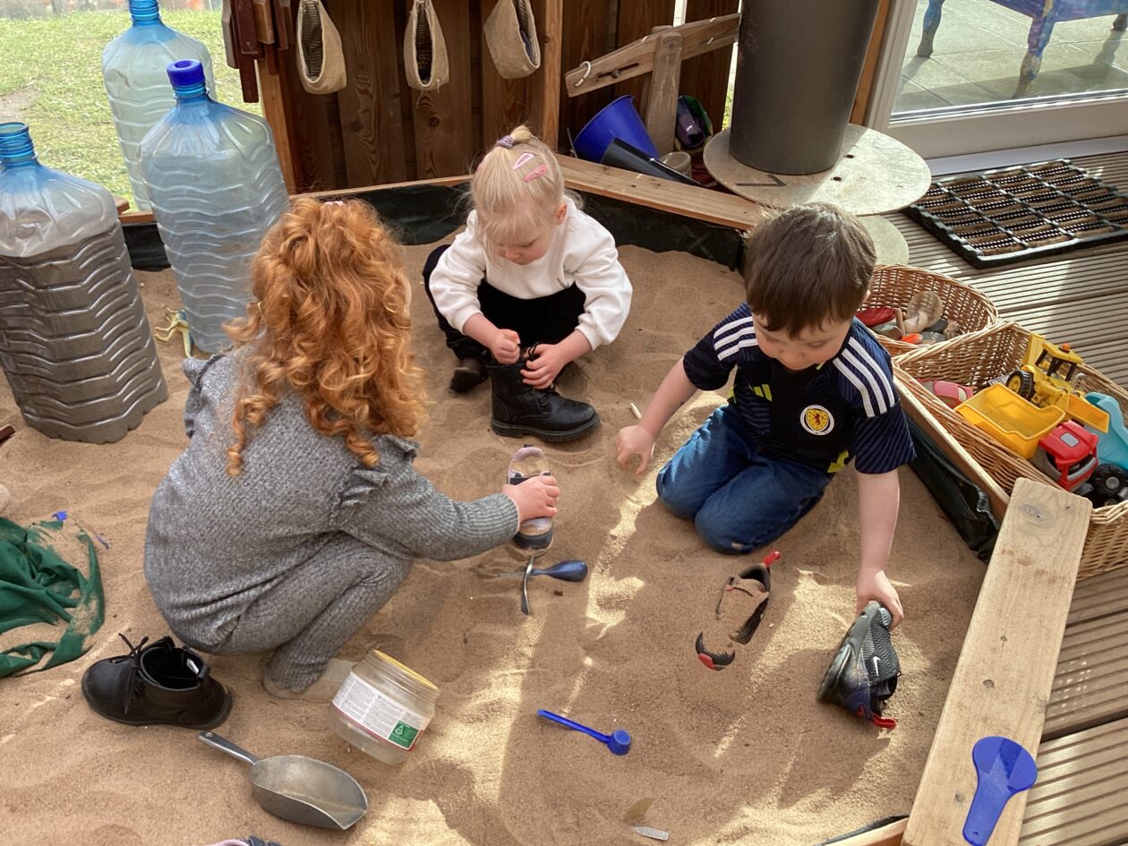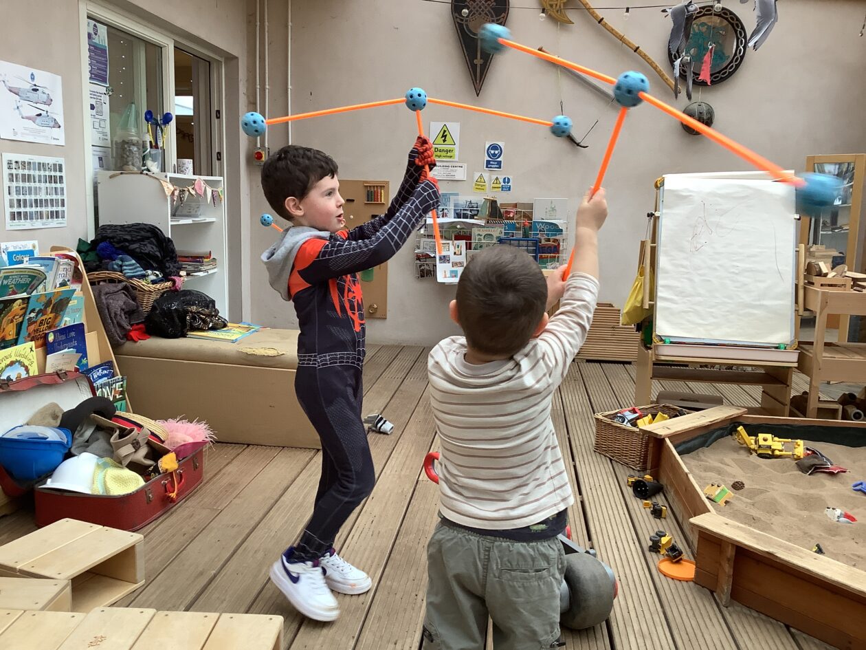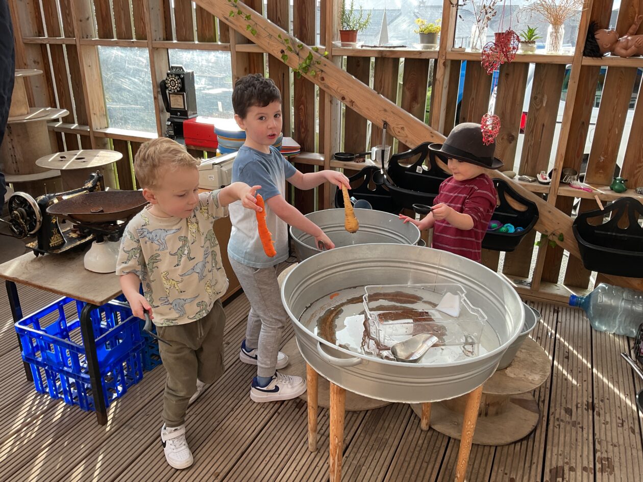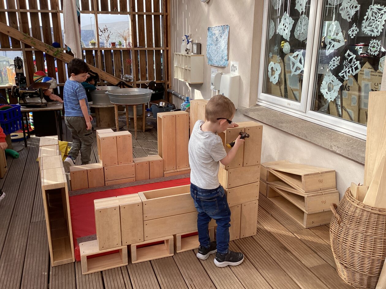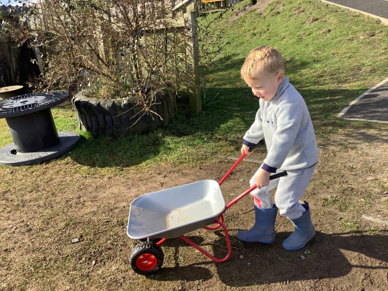 The outdoor room is always a popular choice and a great place to observe schemas (a repeated action used to explore and test theories in play). The bairns have used positioning, transporting, trajectory, enveloping, rotation and enclosure schemas in their play this week. They made paper aeroplanes and then built a platform to launch their planes from, watching how far they flew. They have also been engaged in imaginative play using the large hollow blocks and cable drums as fishing boats. “He is da een dat goes in da water. He is da fishing een and I’m da Captain.”