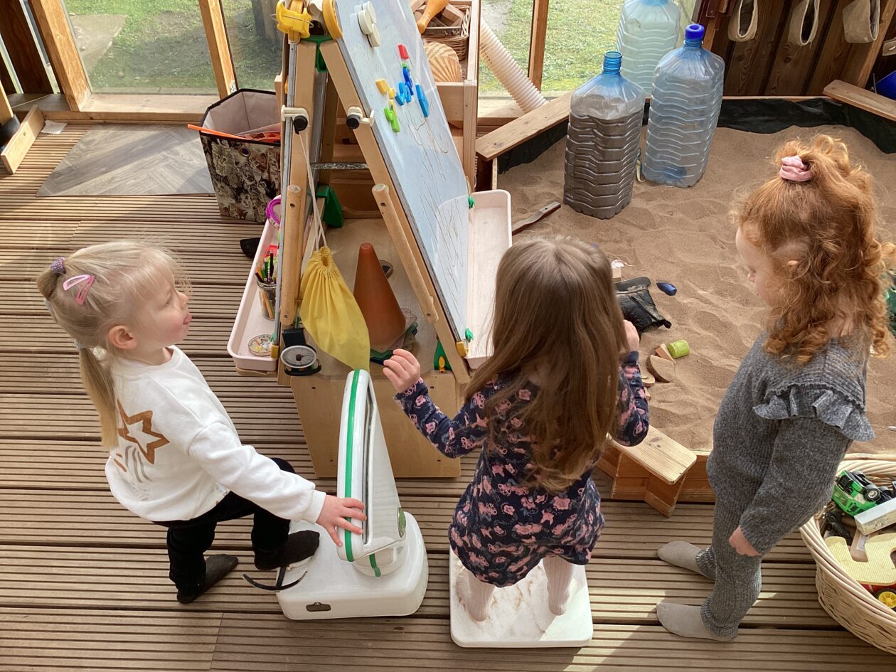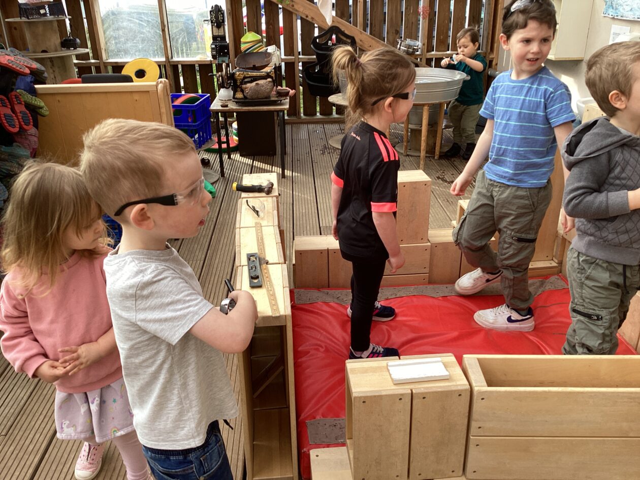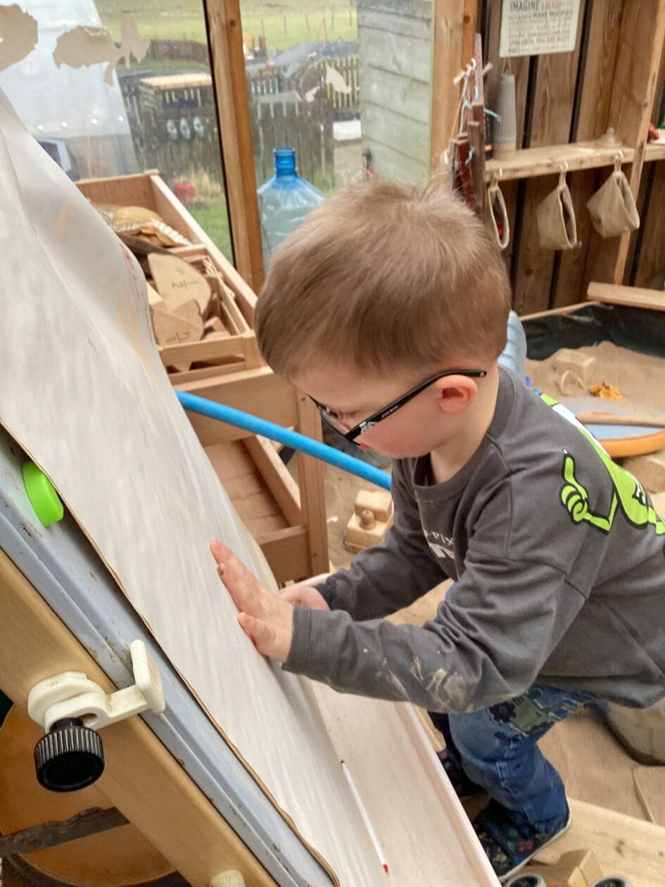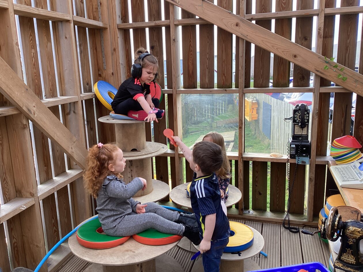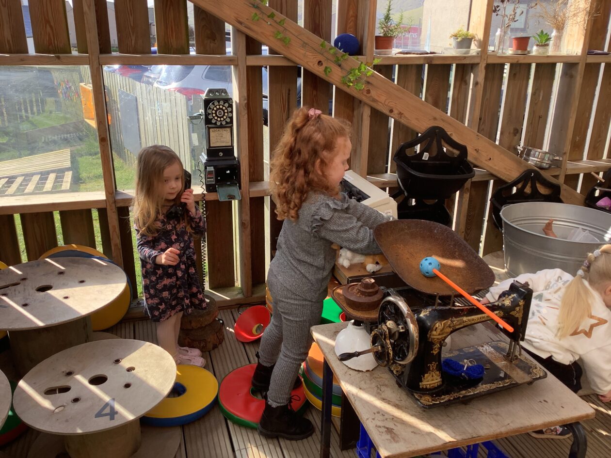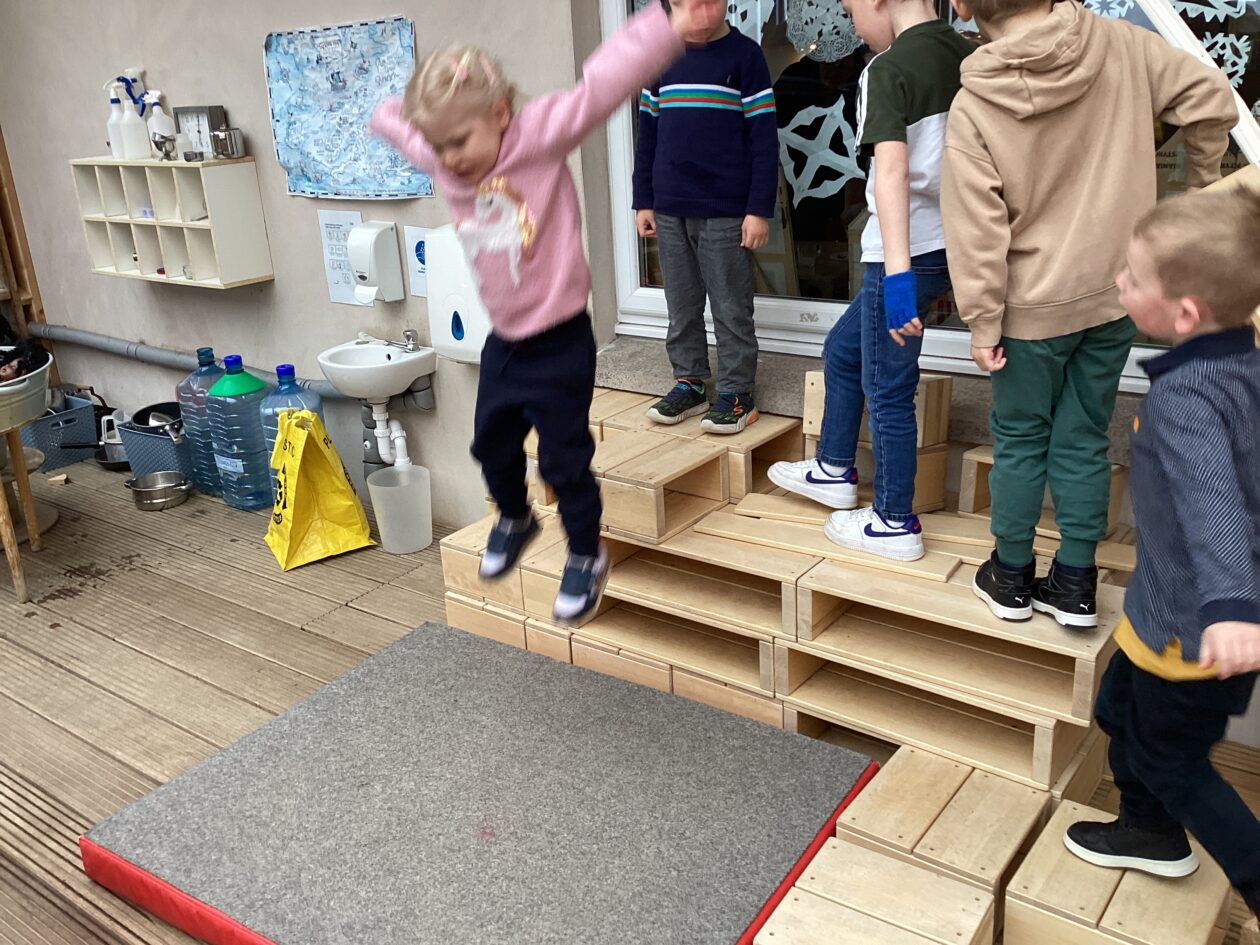 The outdoor room is always a popular choice and a great place to observe schemas (a repeated action used to explore and test theories in play). The bairns have used positioning, transporting, trajectory, enveloping, rotation and enclosure schemas in their play this week. They made paper aeroplanes and then built a platform to launch their planes from, watching how far they flew. They have also been engaged in imaginative play using the large hollow blocks and cable drums as fishing boats. “He is da een dat goes in da water. He is da fishing een and I’m da Captain.”