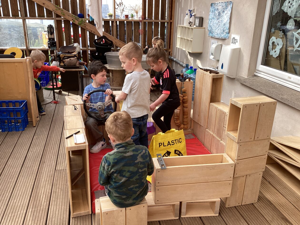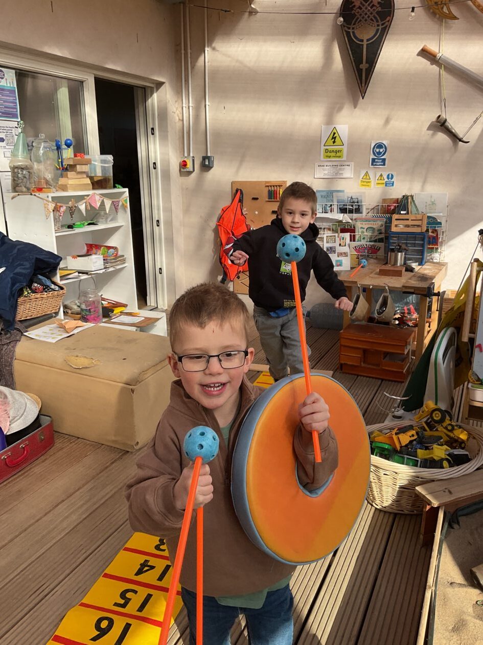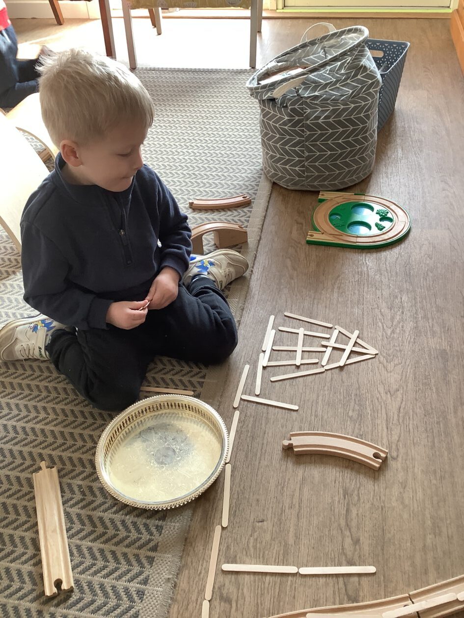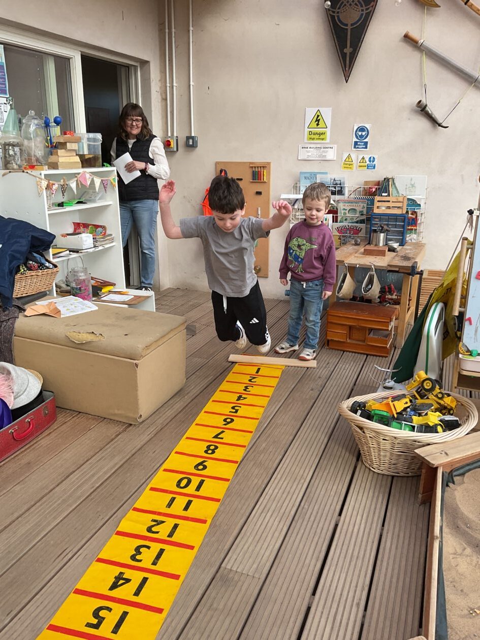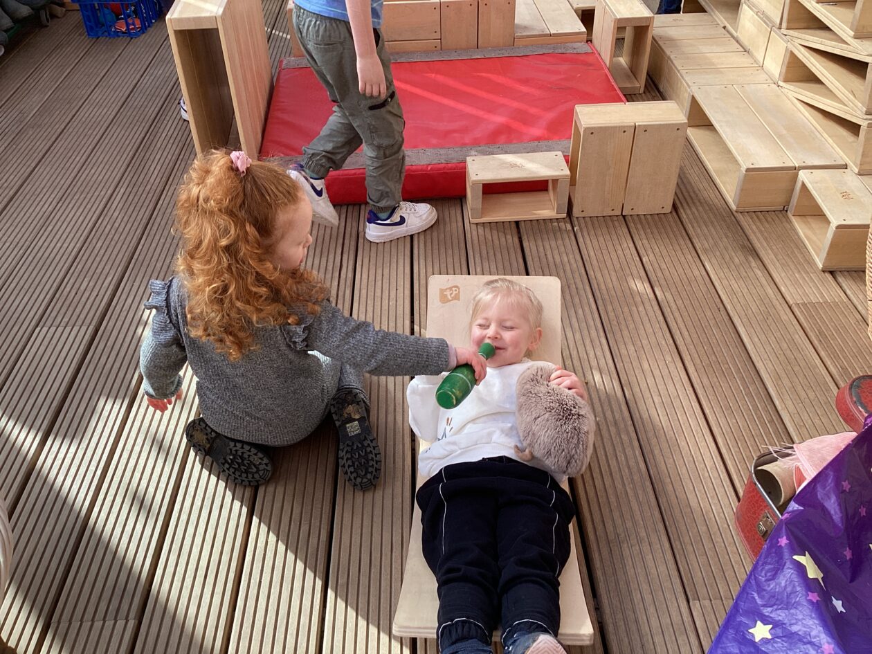 The outdoor room is always a popular choice and a great place to observe schemas (a repeated action used to explore and test theories in play). The bairns have used positioning, transporting, trajectory, enveloping, rotation and enclosure schemas in their play this week. They made paper aeroplanes and then built a platform to launch their planes from, watching how far they flew. They have also been engaged in imaginative play using the large hollow blocks and cable drums as fishing boats. “He is da een dat goes in da water. He is da fishing een and I’m da Captain.”