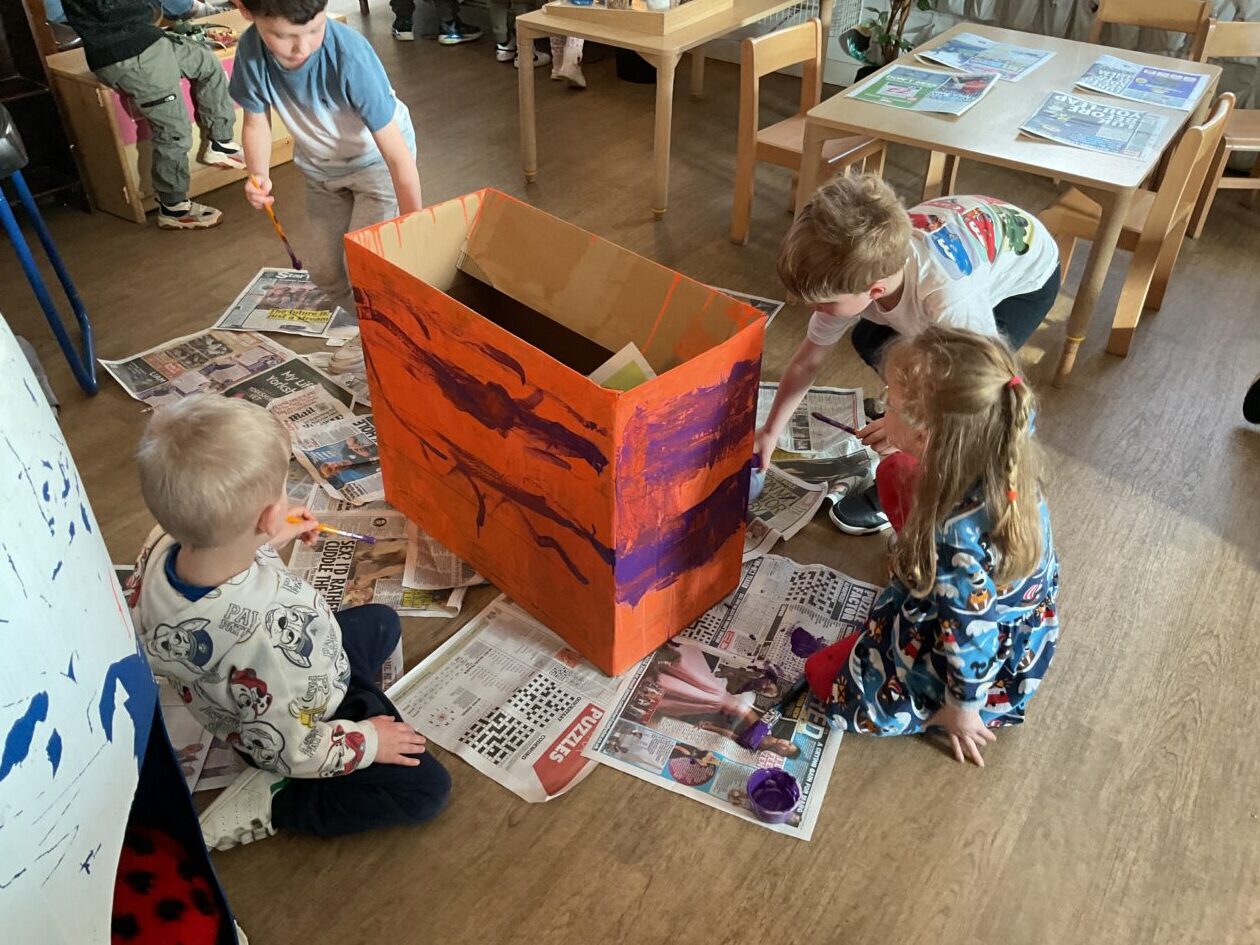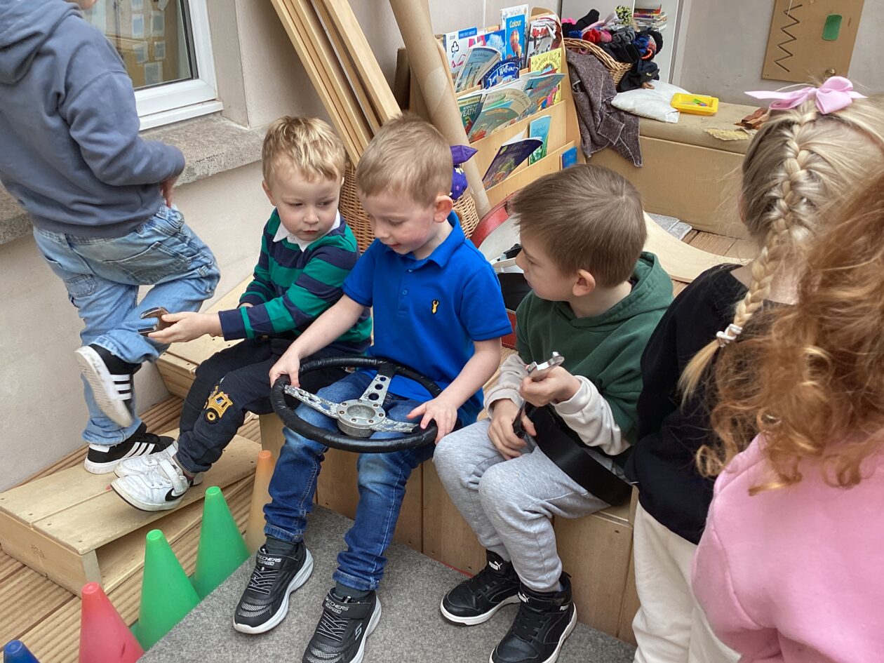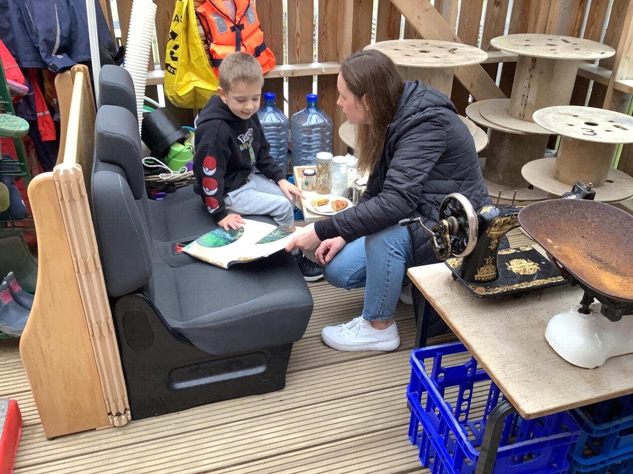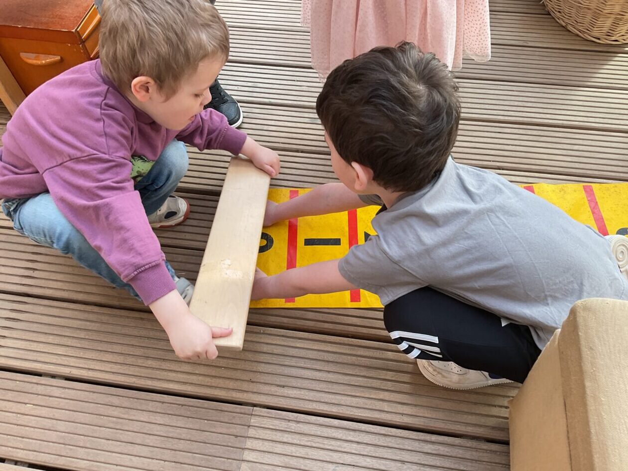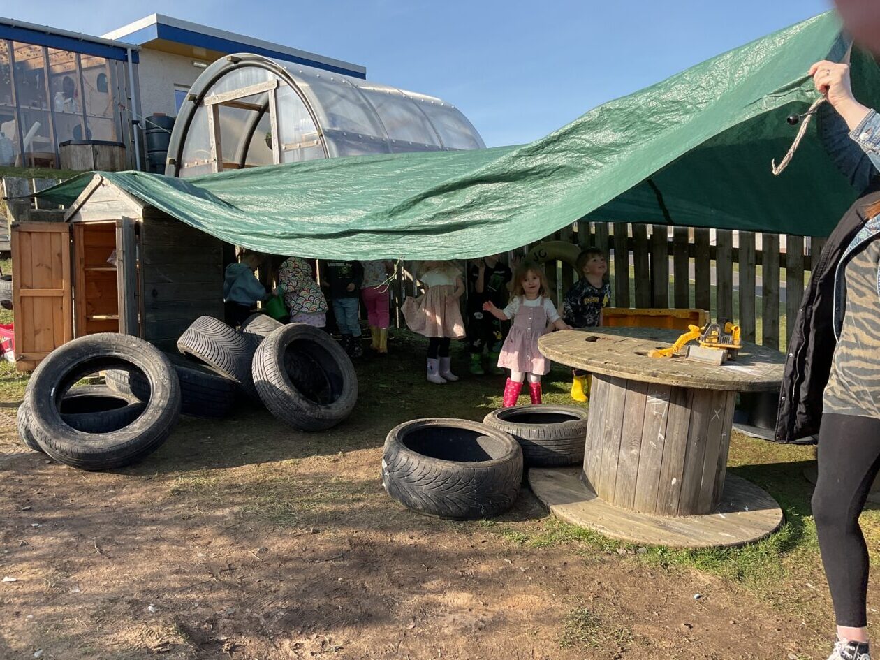 The outdoor room is always a popular choice and a great place to observe schemas (a repeated action used to explore and test theories in play). The bairns have used positioning, transporting, trajectory, enveloping, rotation and enclosure schemas in their play this week. They made paper aeroplanes and then built a platform to launch their planes from, watching how far they flew. They have also been engaged in imaginative play using the large hollow blocks and cable drums as fishing boats. “He is da een dat goes in da water. He is da fishing een and I’m da Captain.”