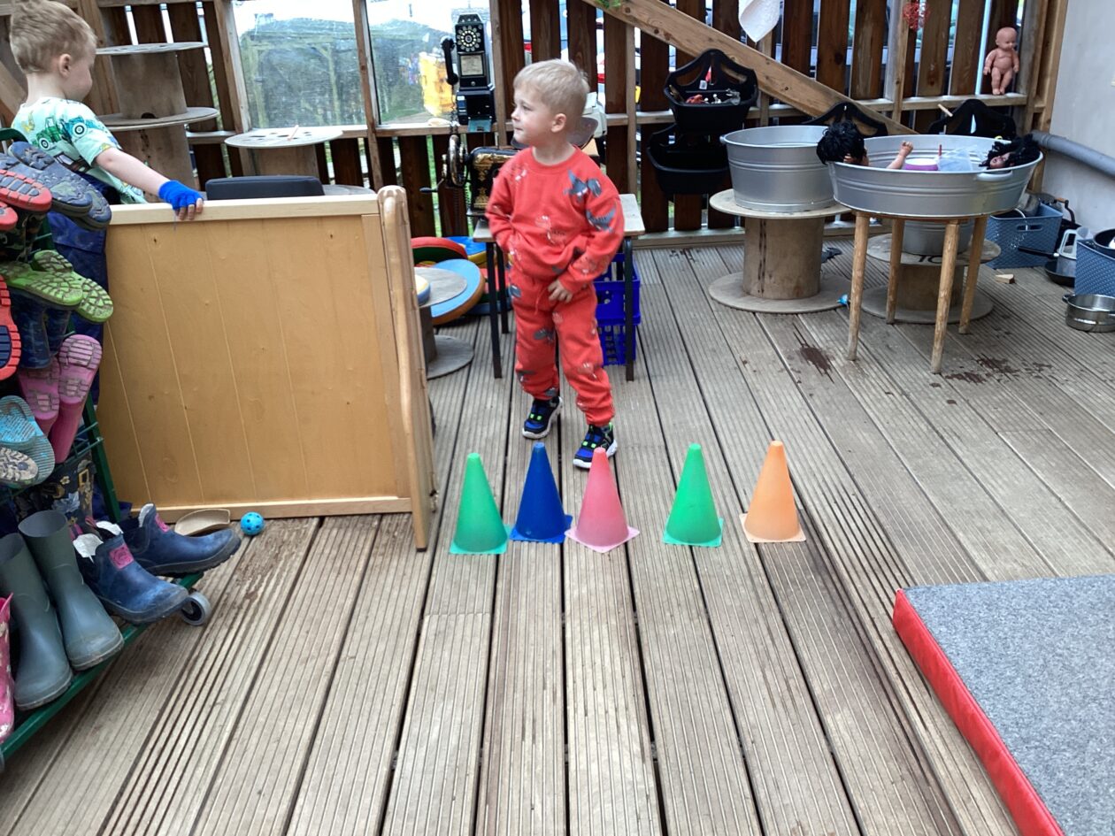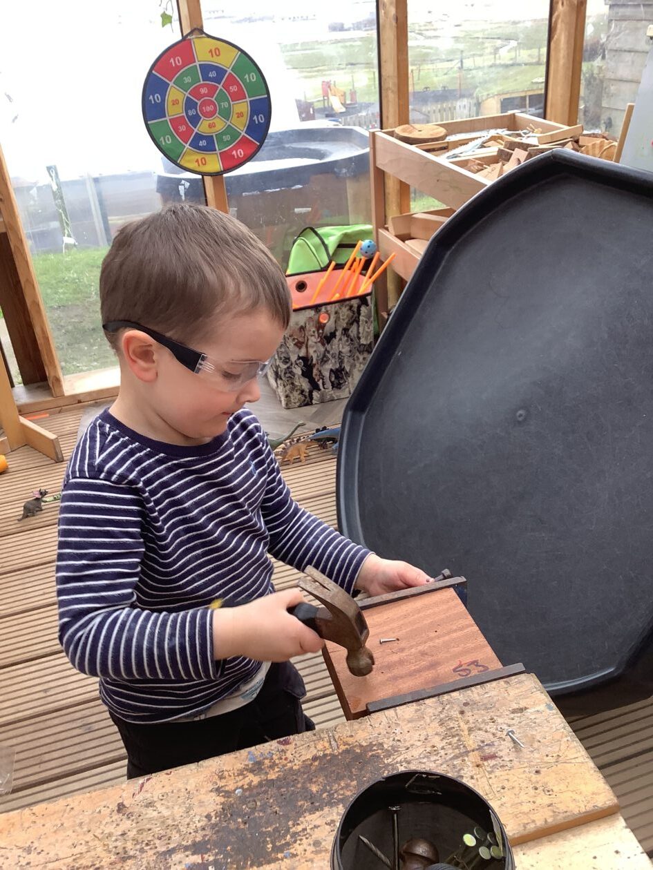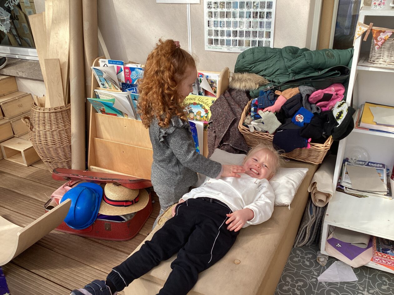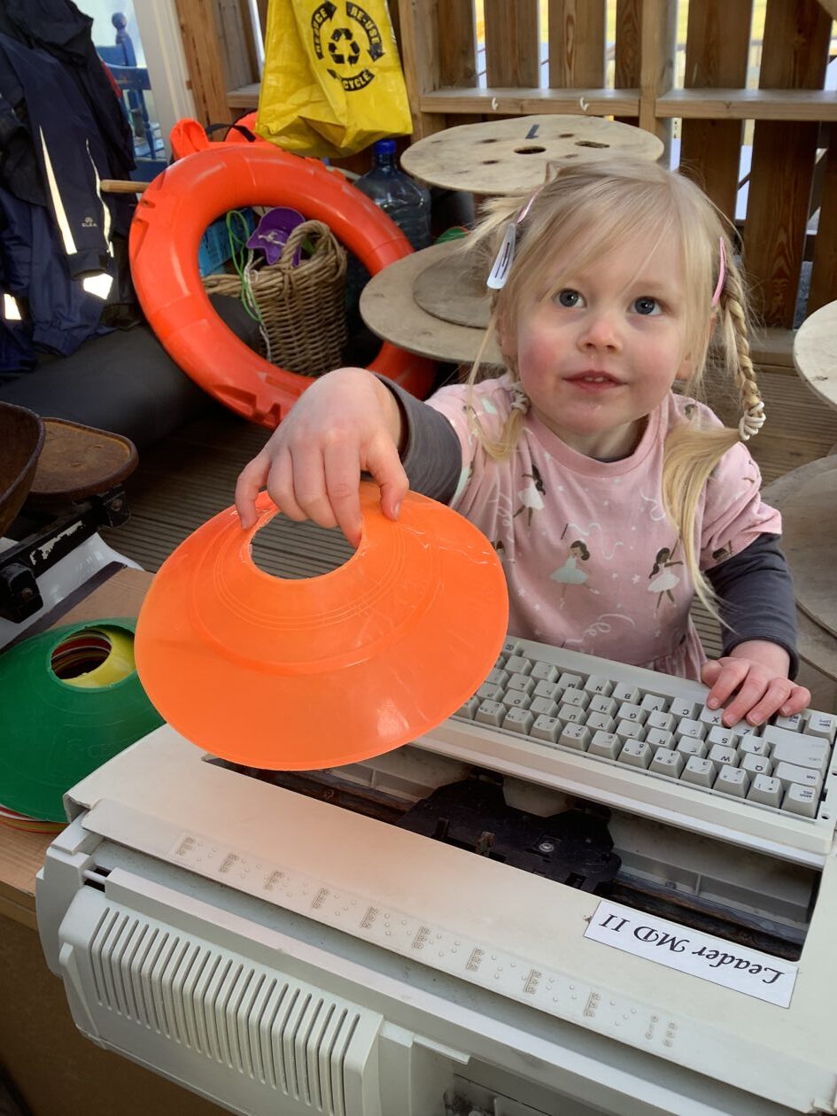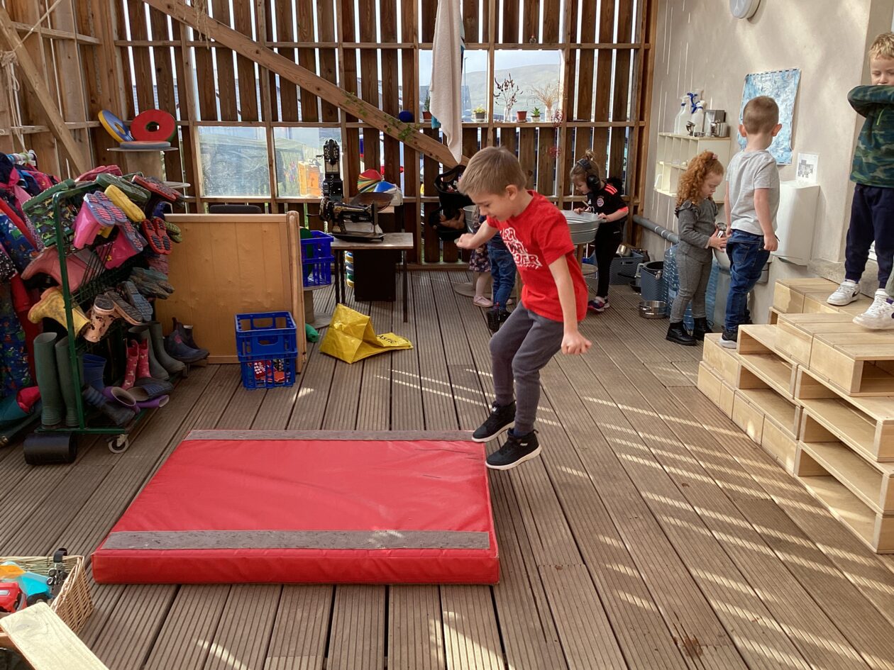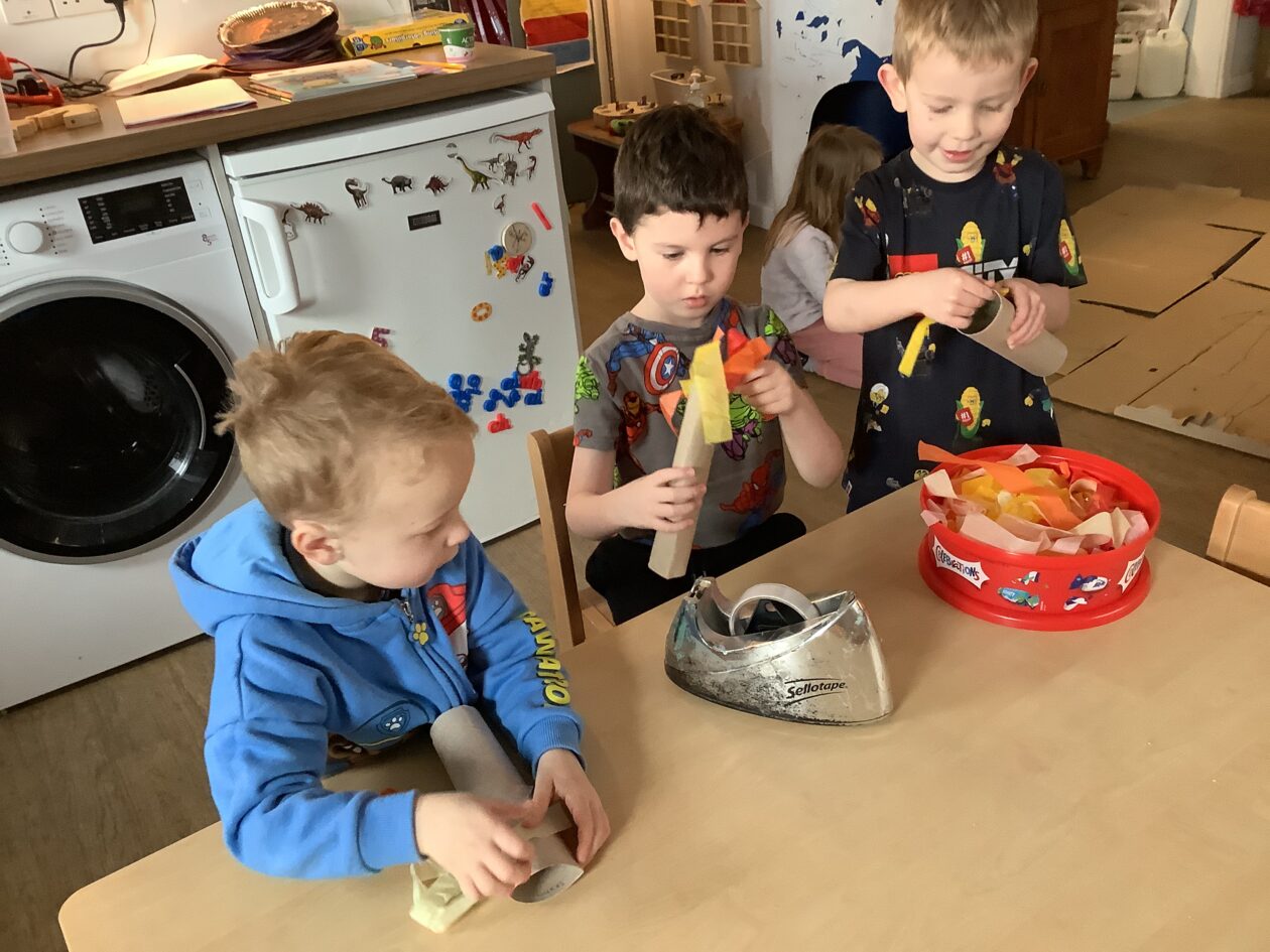 The outdoor room is always a popular choice and a great place to observe schemas (a repeated action used to explore and test theories in play). The bairns have used positioning, transporting, trajectory, enveloping, rotation and enclosure schemas in their play this week. They made paper aeroplanes and then built a platform to launch their planes from, watching how far they flew. They have also been engaged in imaginative play using the large hollow blocks and cable drums as fishing boats. “He is da een dat goes in da water. He is da fishing een and I’m da Captain.”