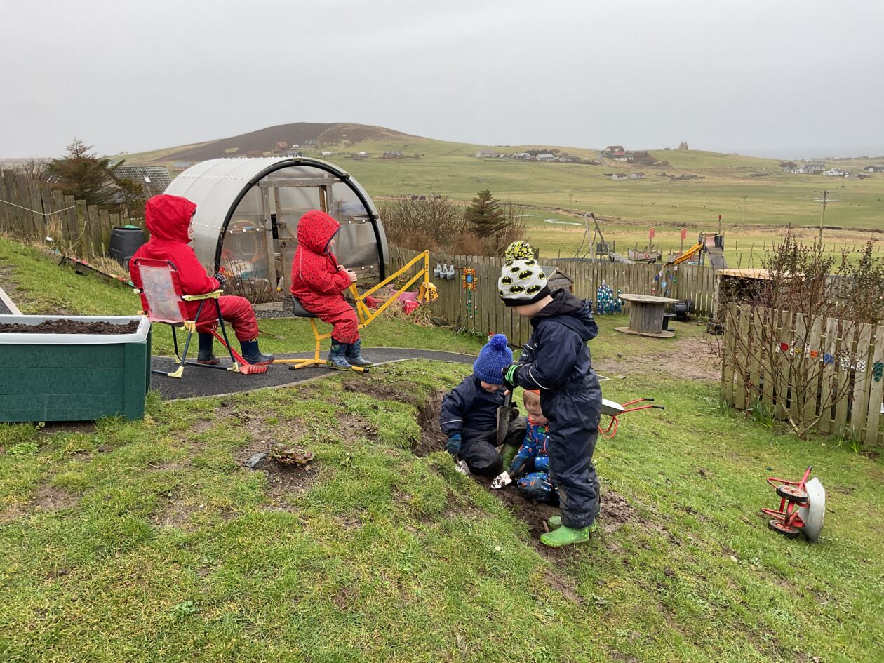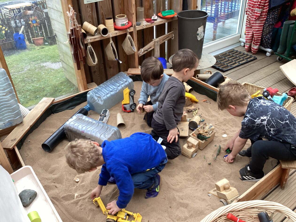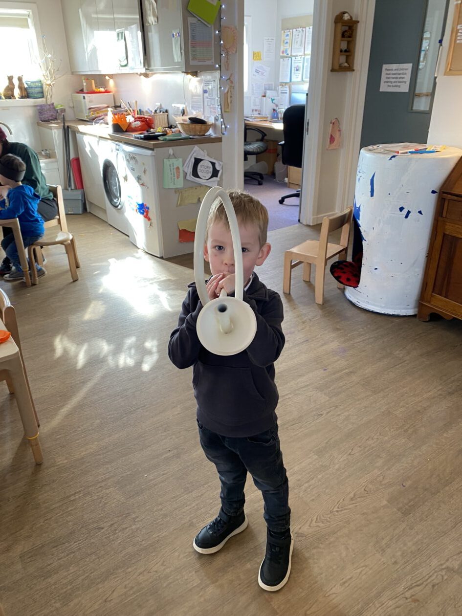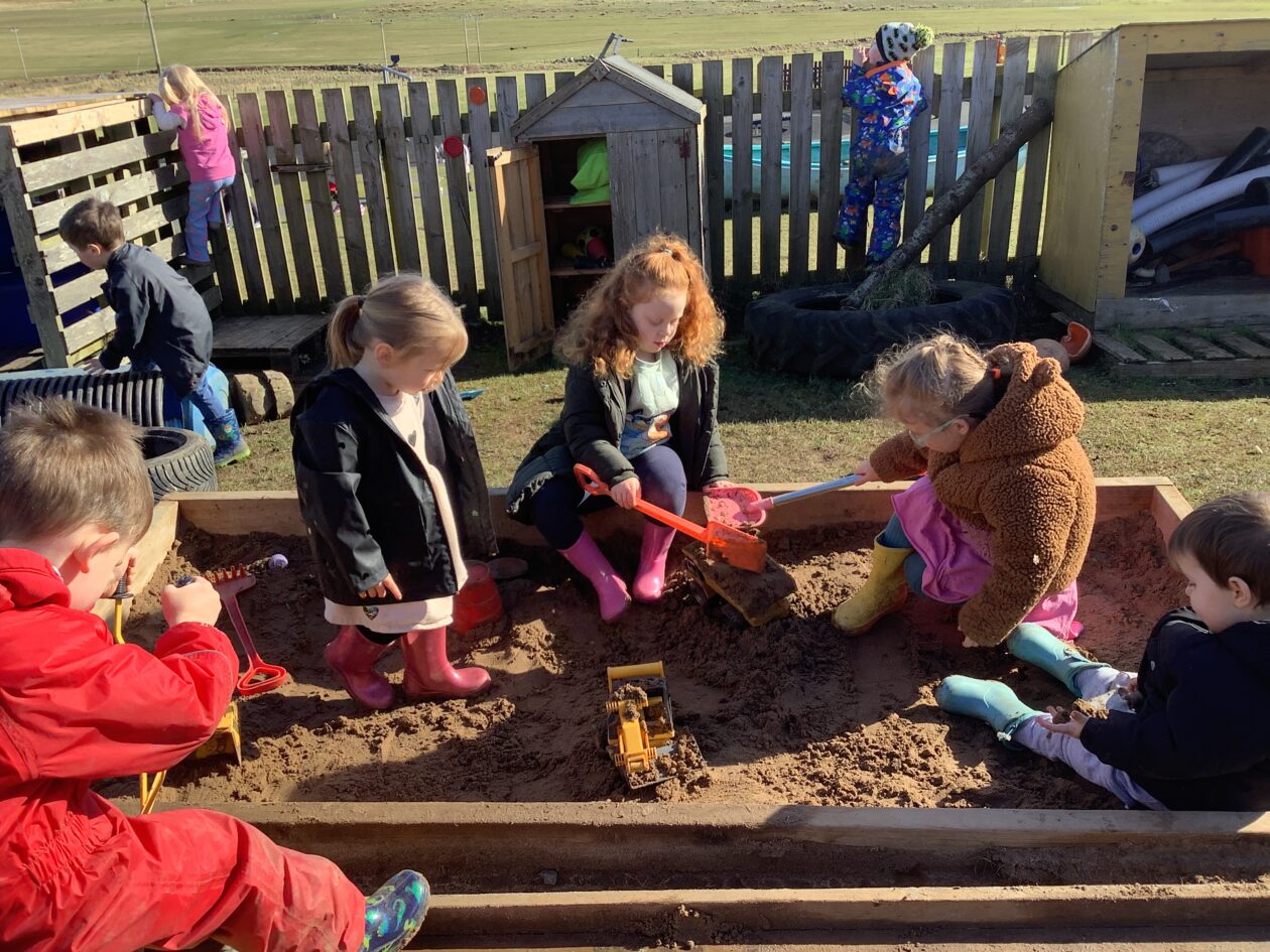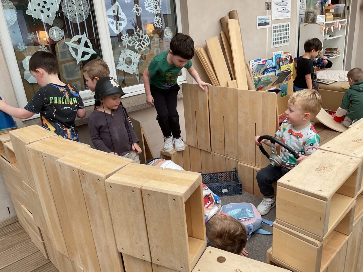 The outdoor room is always a popular choice and a great place to observe schemas (a repeated action used to explore and test theories in play). The bairns have used positioning, transporting, trajectory, enveloping, rotation and enclosure schemas in their play this week. They made paper aeroplanes and then built a platform to launch their planes from, watching how far they flew. They have also been engaged in imaginative play using the large hollow blocks and cable drums as fishing boats. “He is da een dat goes in da water. He is da fishing een and I’m da Captain.”