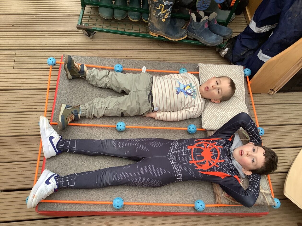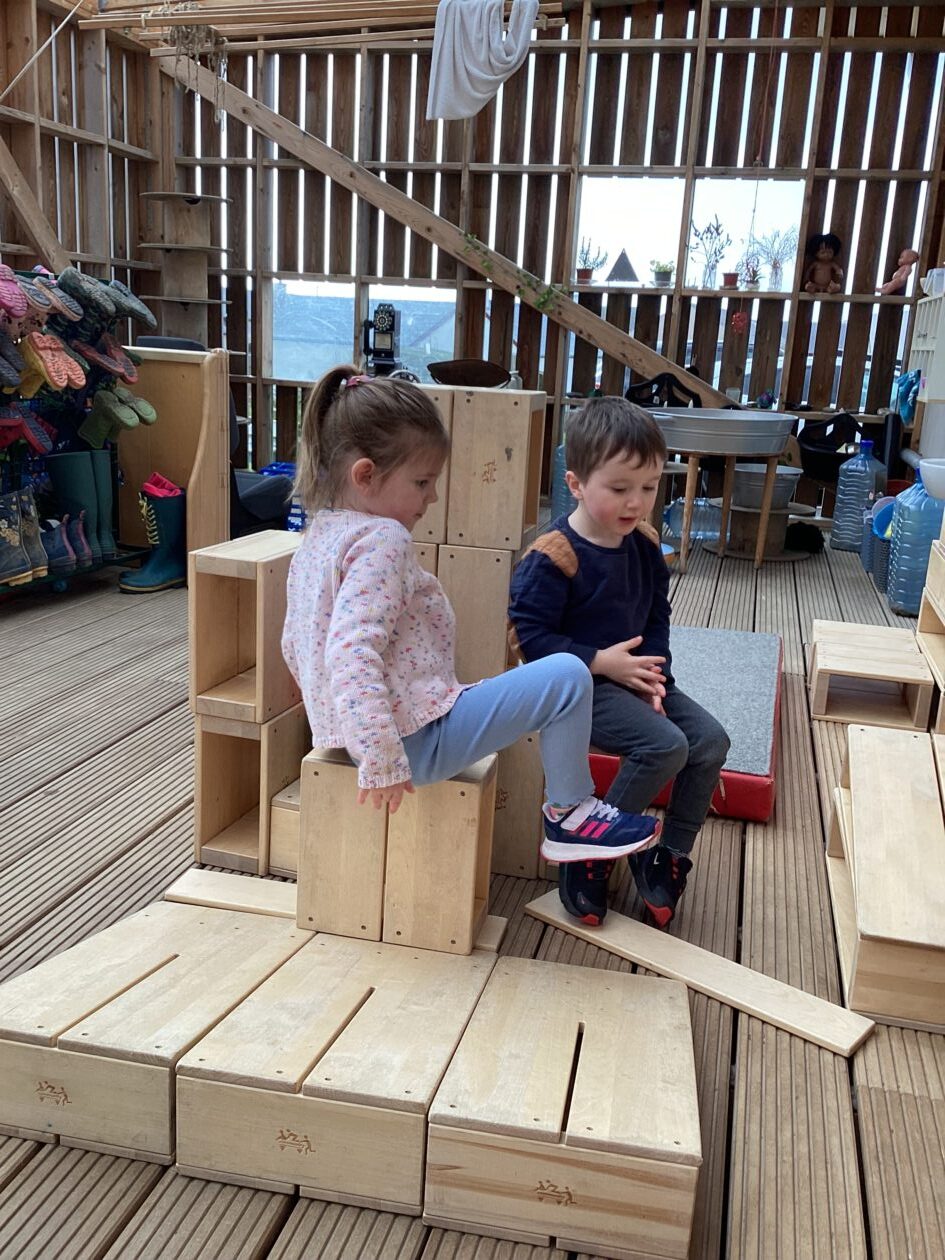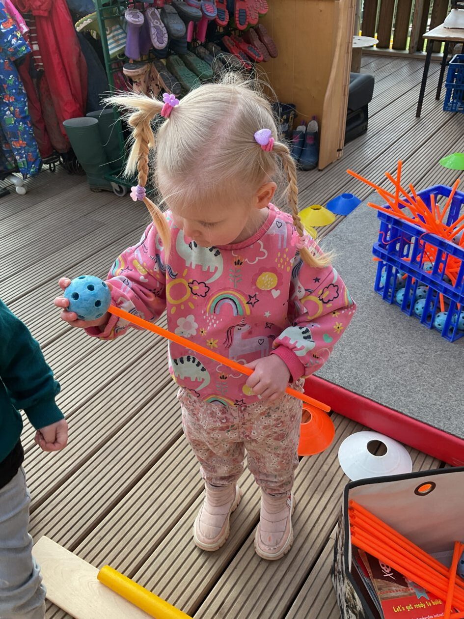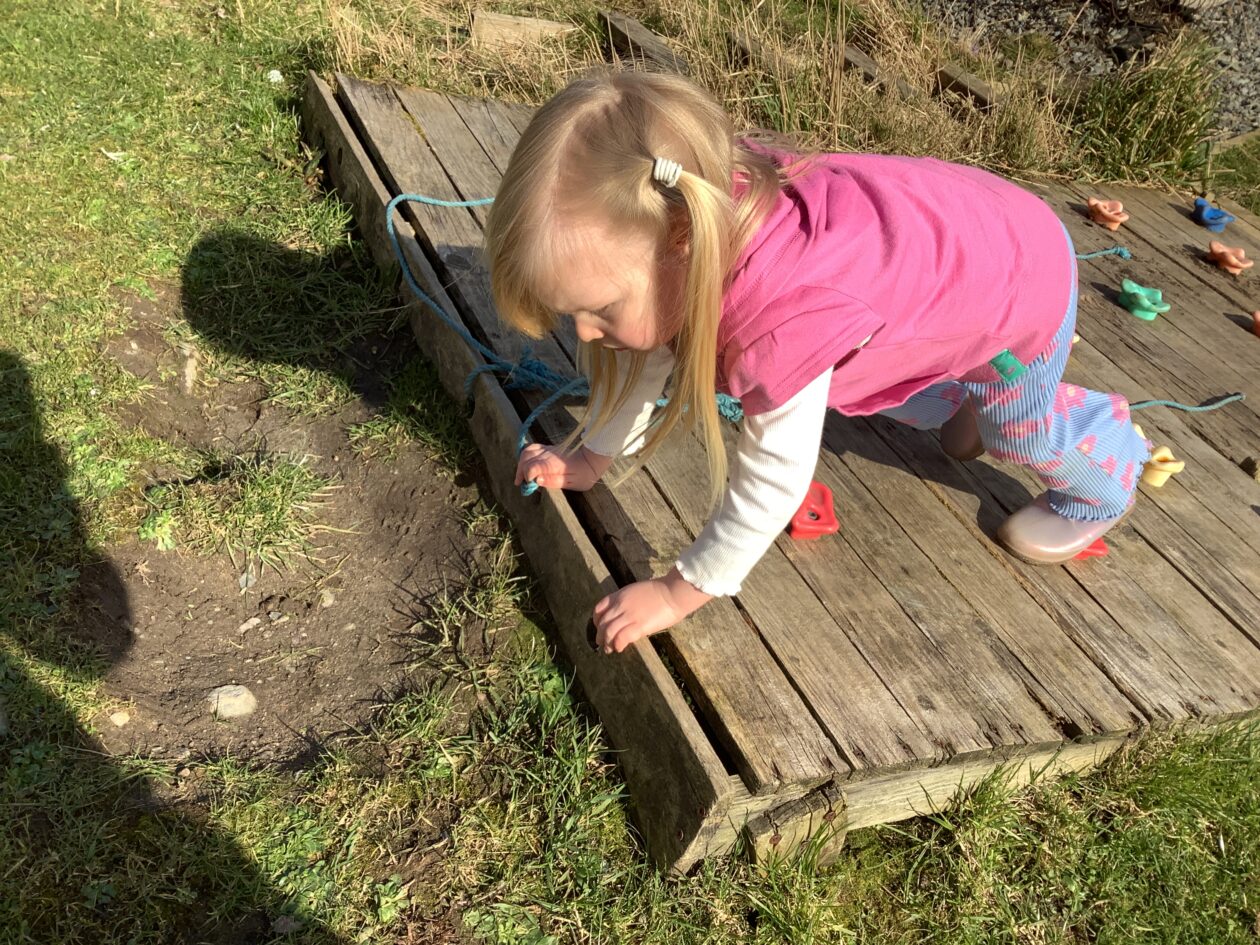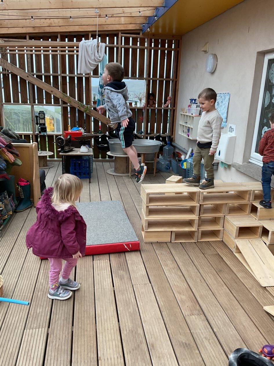 The outdoor room is always a popular choice and a great place to observe schemas (a repeated action used to explore and test theories in play). The bairns have used positioning, transporting, trajectory, enveloping, rotation and enclosure schemas in their play this week. They made paper aeroplanes and then built a platform to launch their planes from, watching how far they flew. They have also been engaged in imaginative play using the large hollow blocks and cable drums as fishing boats. “He is da een dat goes in da water. He is da fishing een and I’m da Captain.”