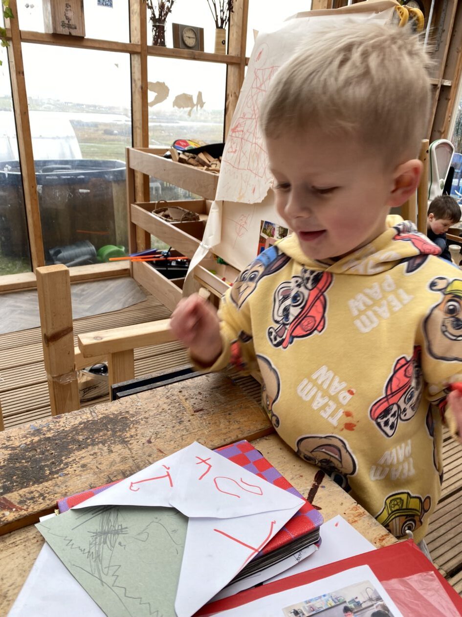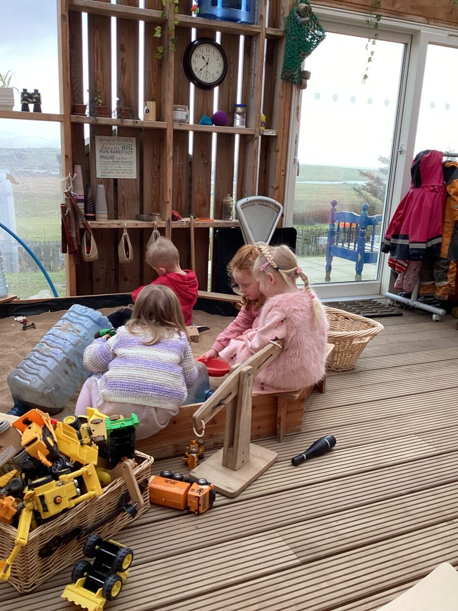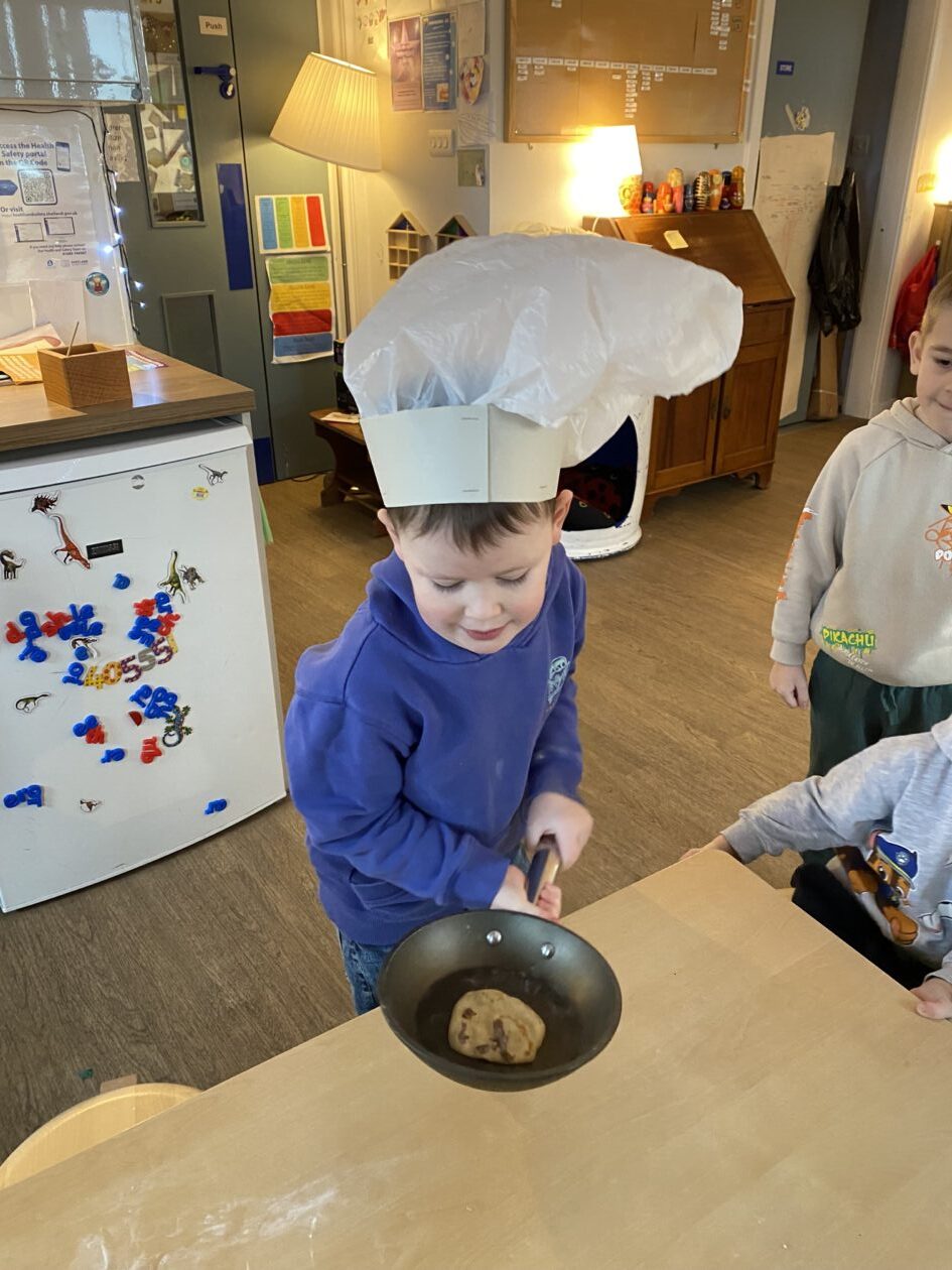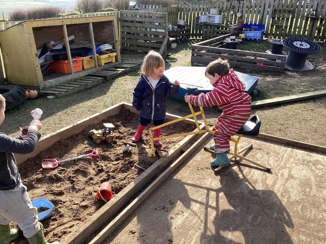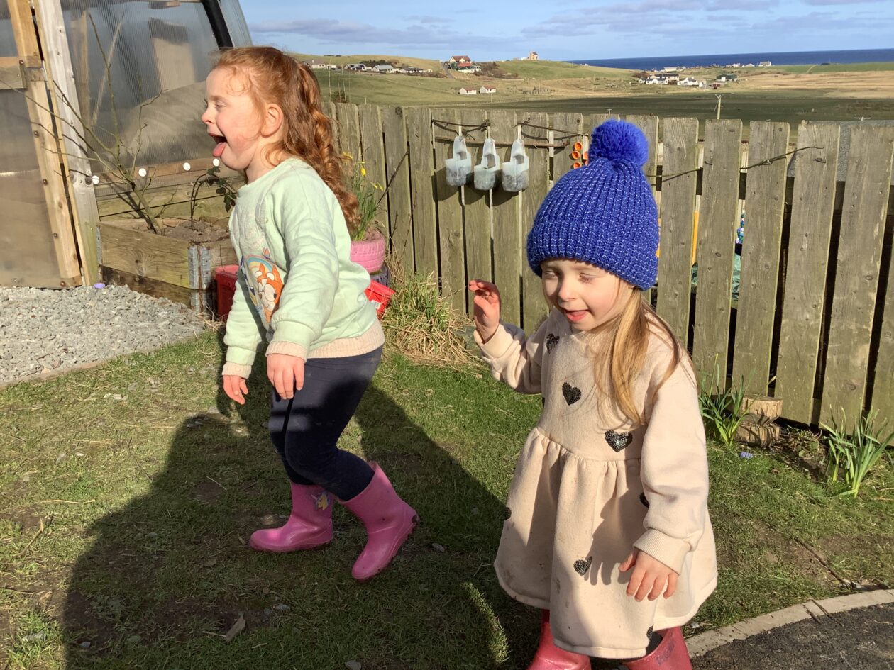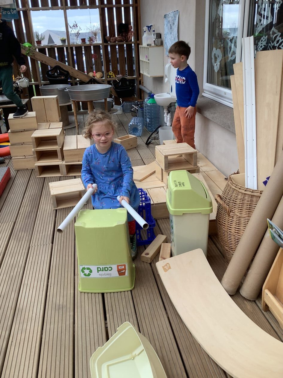 The outdoor room is always a popular choice and a great place to observe schemas (a repeated action used to explore and test theories in play). The bairns have used positioning, transporting, trajectory, enveloping, rotation and enclosure schemas in their play this week. They made paper aeroplanes and then built a platform to launch their planes from, watching how far they flew. They have also been engaged in imaginative play using the large hollow blocks and cable drums as fishing boats. “He is da een dat goes in da water. He is da fishing een and I’m da Captain.”