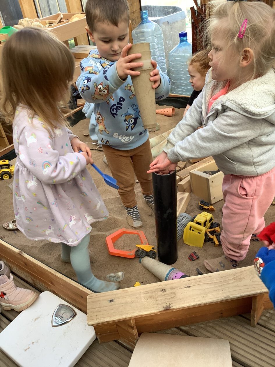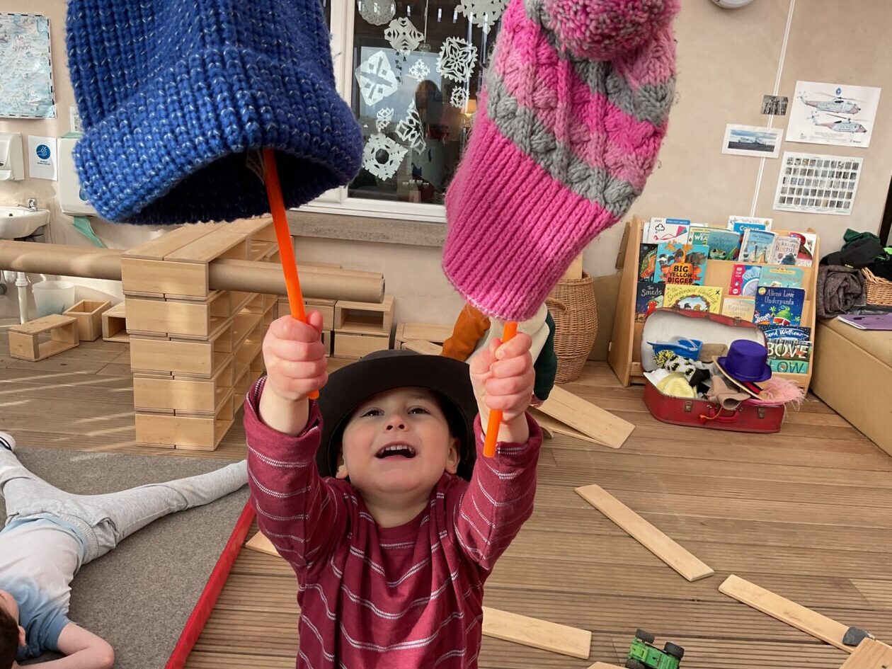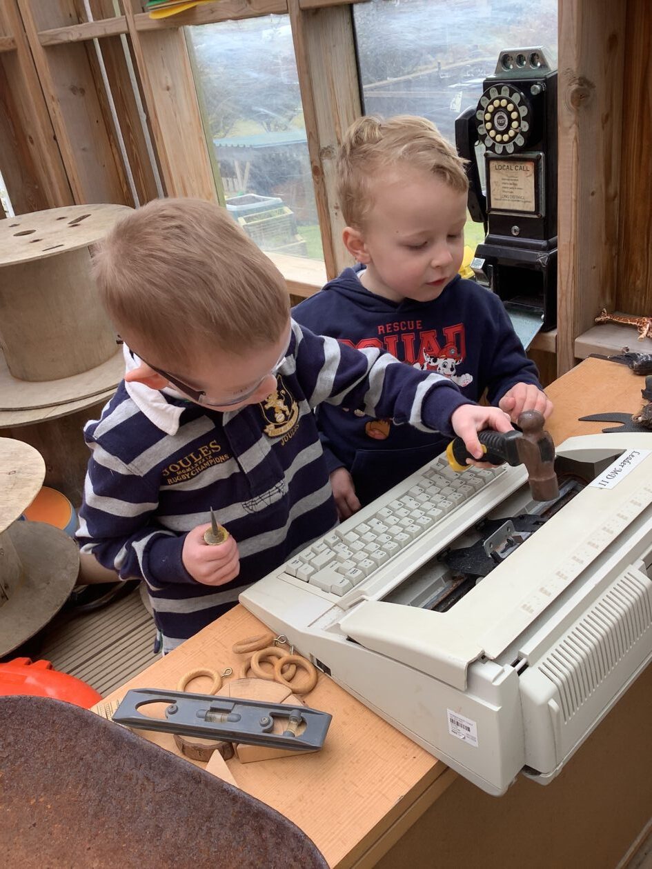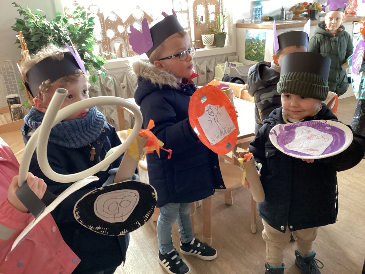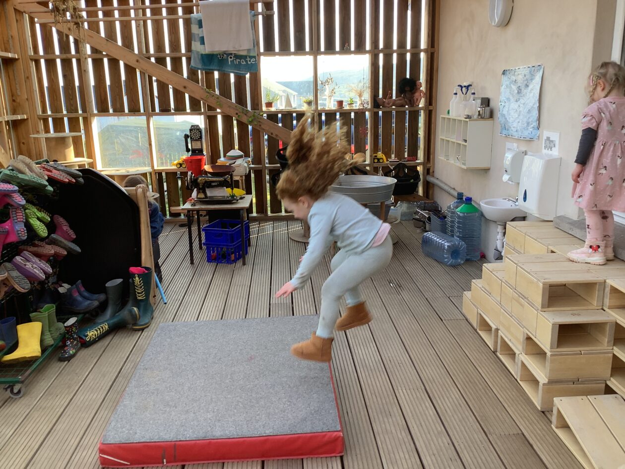 The outdoor room is always a popular choice and a great place to observe schemas (a repeated action used to explore and test theories in play). The bairns have used positioning, transporting, trajectory, enveloping, rotation and enclosure schemas in their play this week. They made paper aeroplanes and then built a platform to launch their planes from, watching how far they flew. They have also been engaged in imaginative play using the large hollow blocks and cable drums as fishing boats. “He is da een dat goes in da water. He is da fishing een and I’m da Captain.”