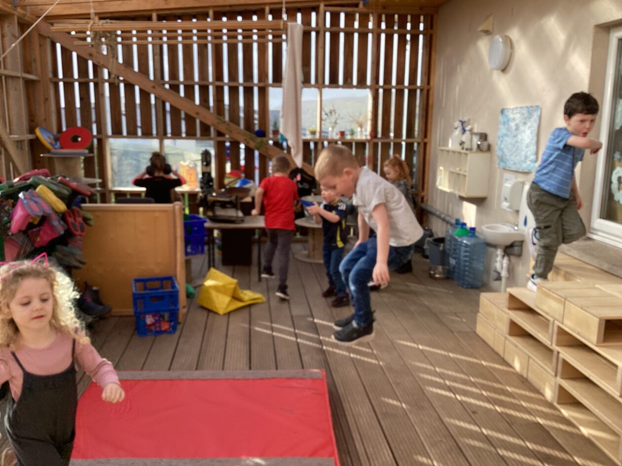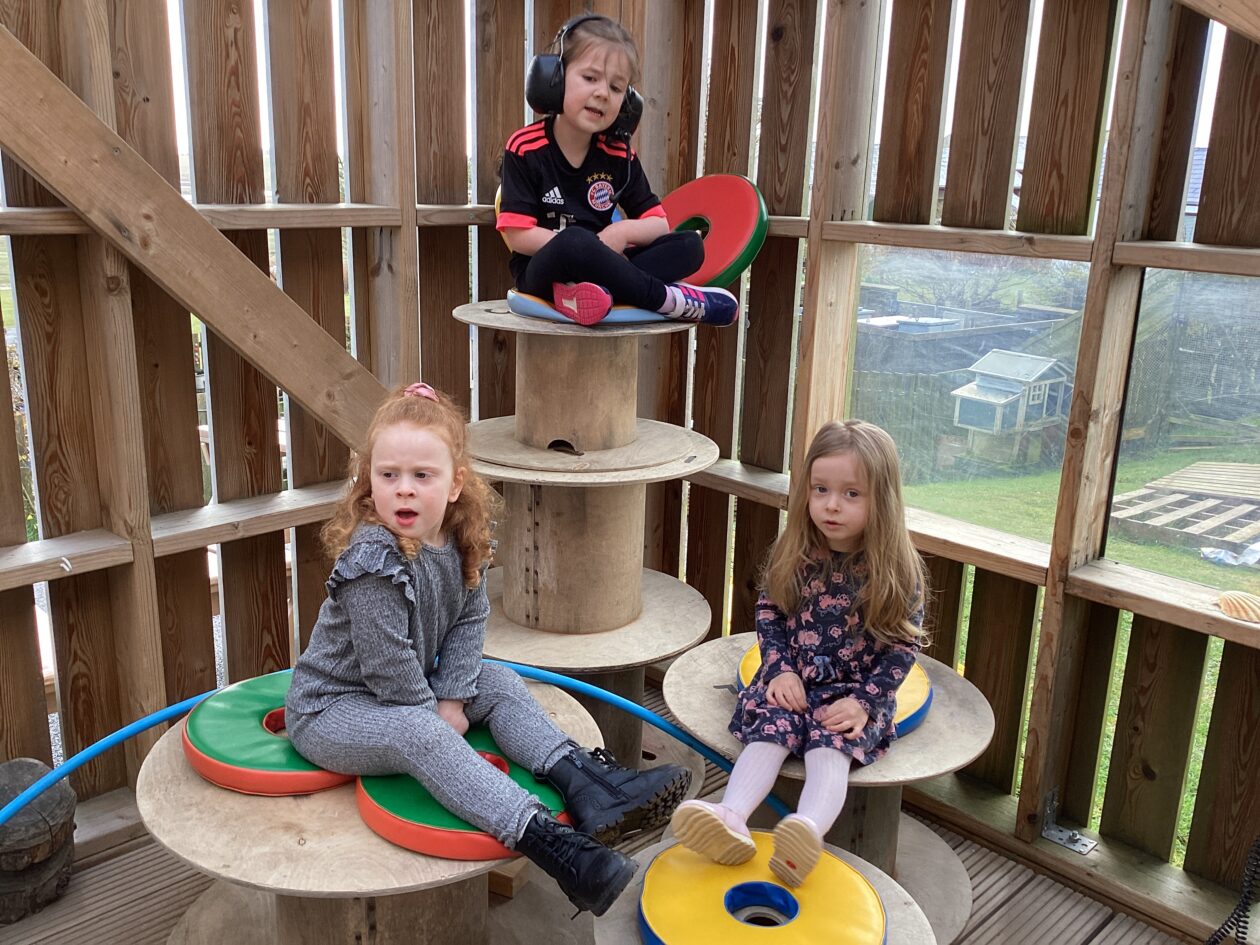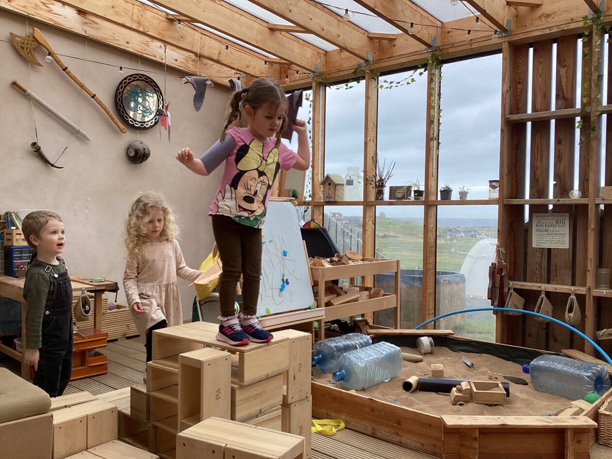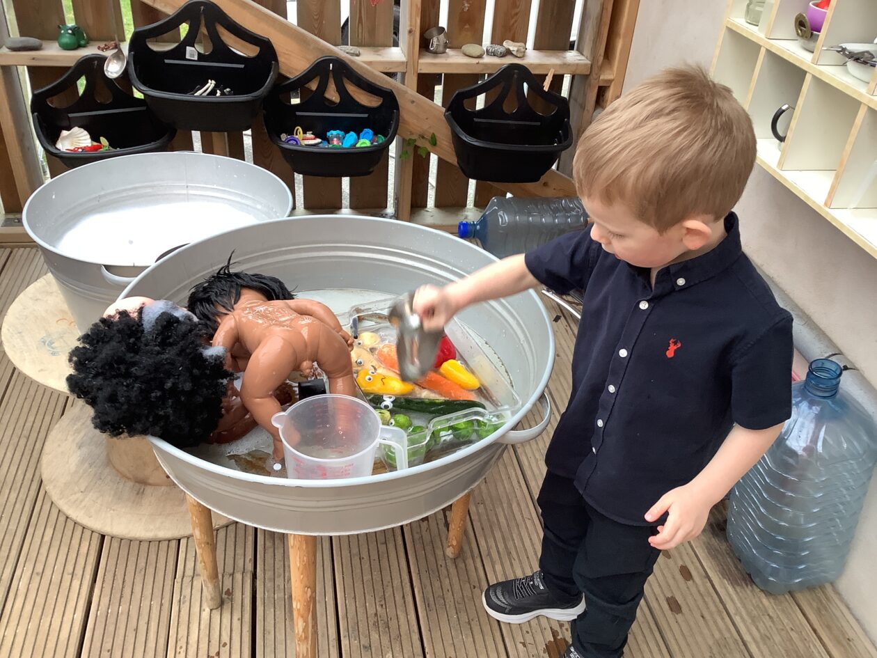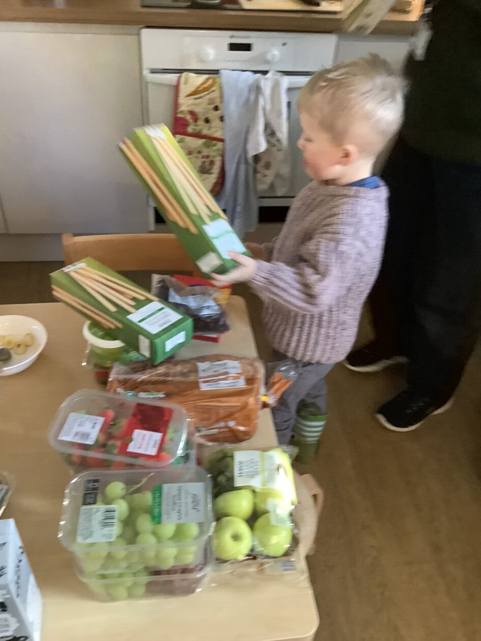 The outdoor room is always a popular choice and a great place to observe schemas (a repeated action used to explore and test theories in play). The bairns have used positioning, transporting, trajectory, enveloping, rotation and enclosure schemas in their play this week. They made paper aeroplanes and then built a platform to launch their planes from, watching how far they flew. They have also been engaged in imaginative play using the large hollow blocks and cable drums as fishing boats. “He is da een dat goes in da water. He is da fishing een and I’m da Captain.”