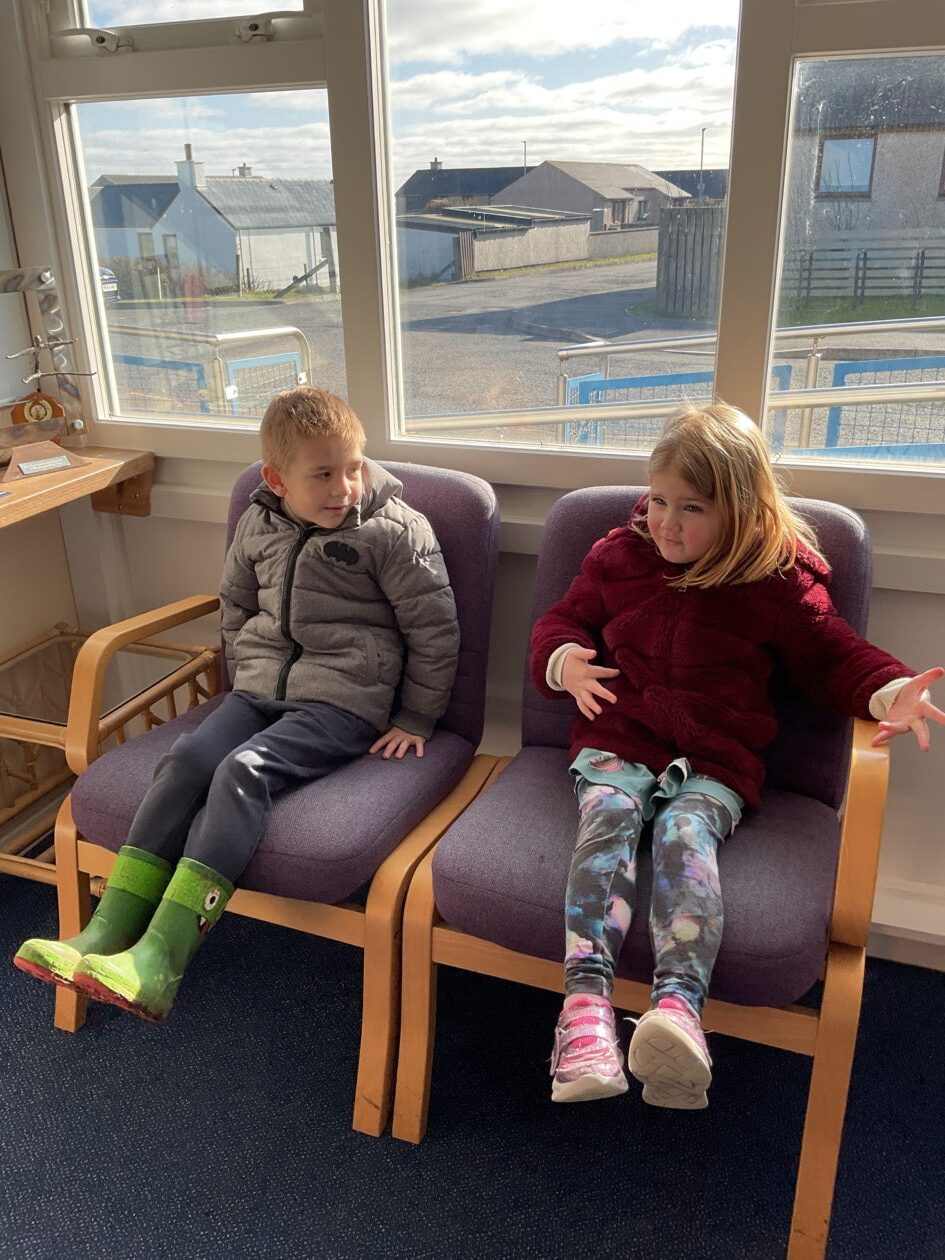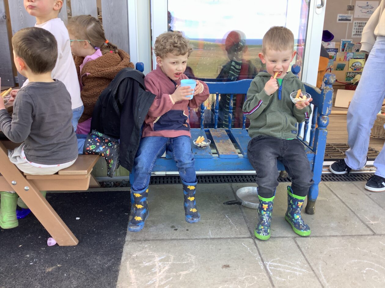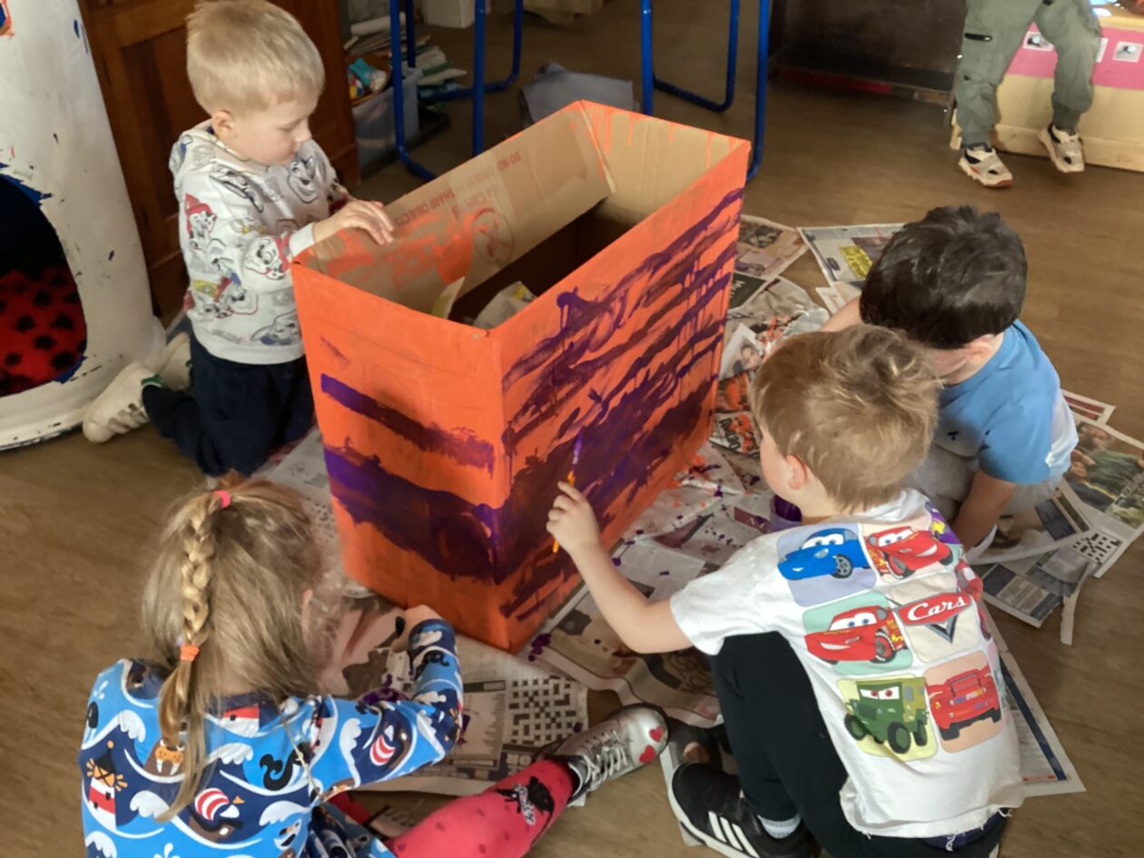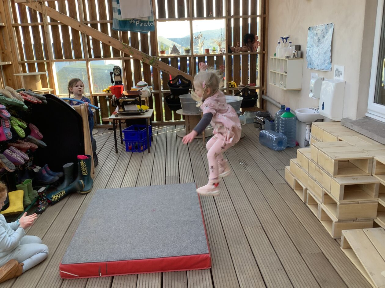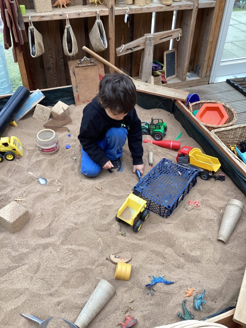 The outdoor room is always a popular choice and a great place to observe schemas (a repeated action used to explore and test theories in play). The bairns have used positioning, transporting, trajectory, enveloping, rotation and enclosure schemas in their play this week. They made paper aeroplanes and then built a platform to launch their planes from, watching how far they flew. They have also been engaged in imaginative play using the large hollow blocks and cable drums as fishing boats. “He is da een dat goes in da water. He is da fishing een and I’m da Captain.”