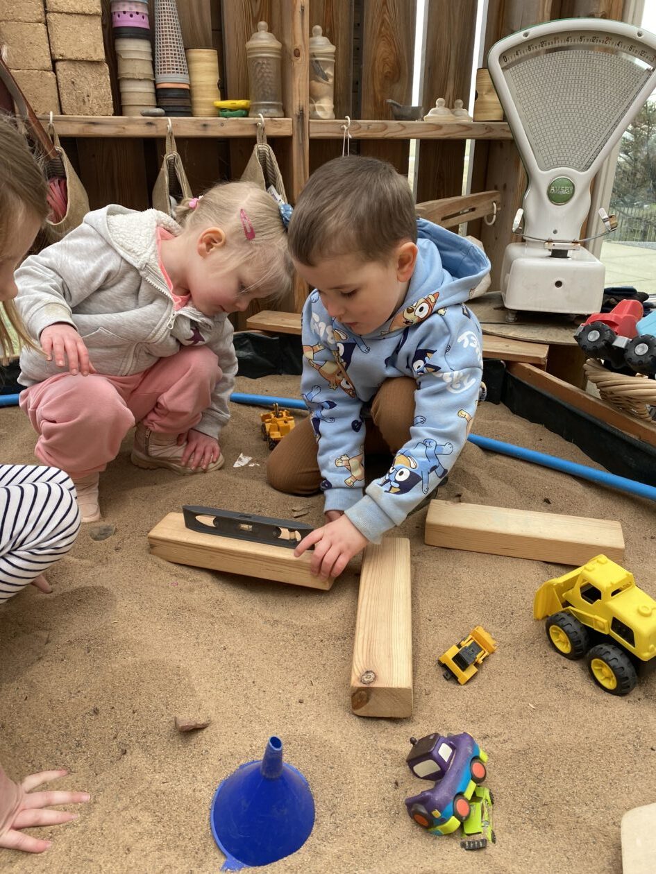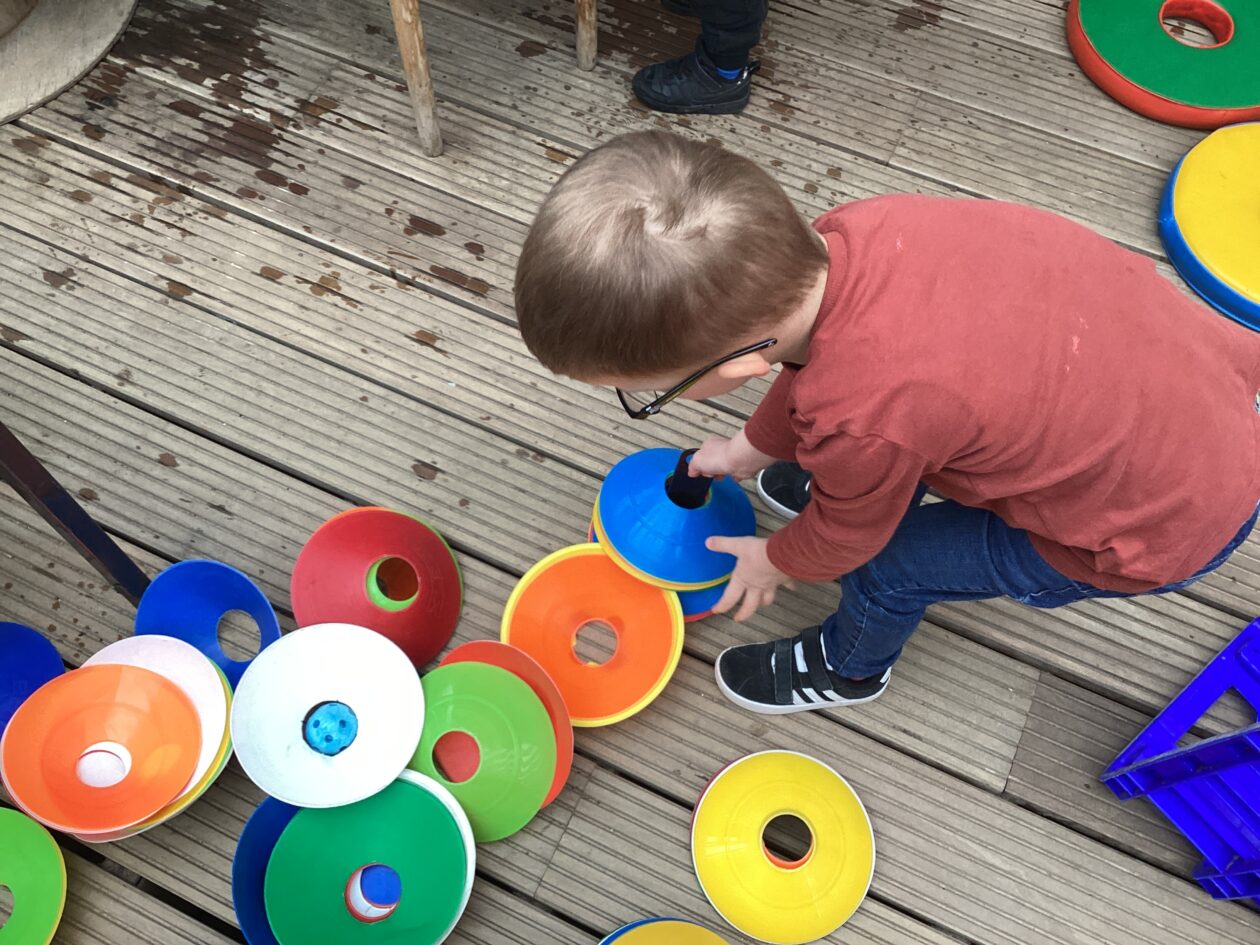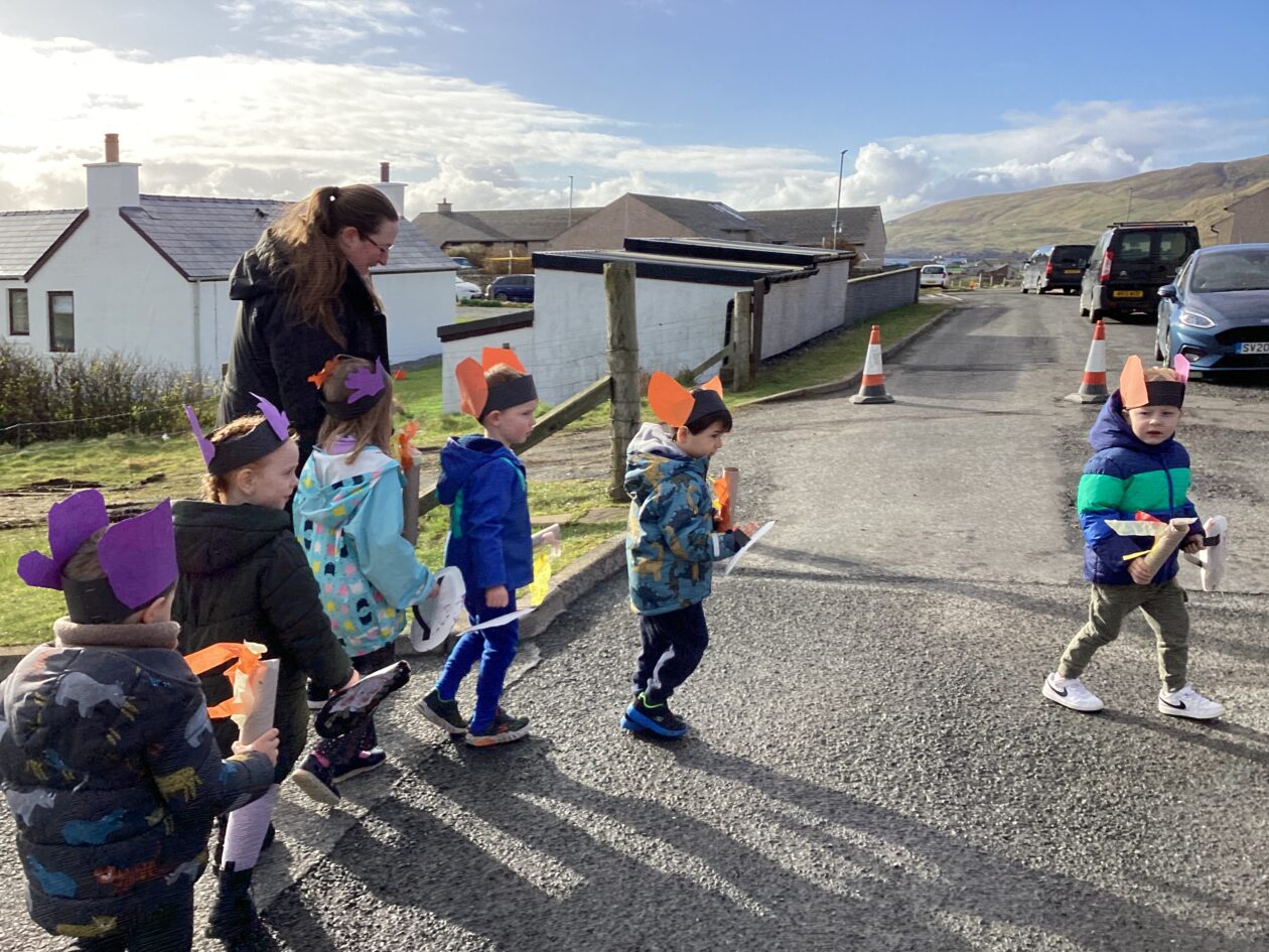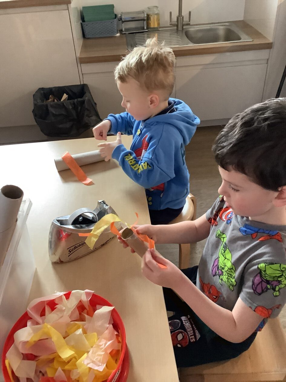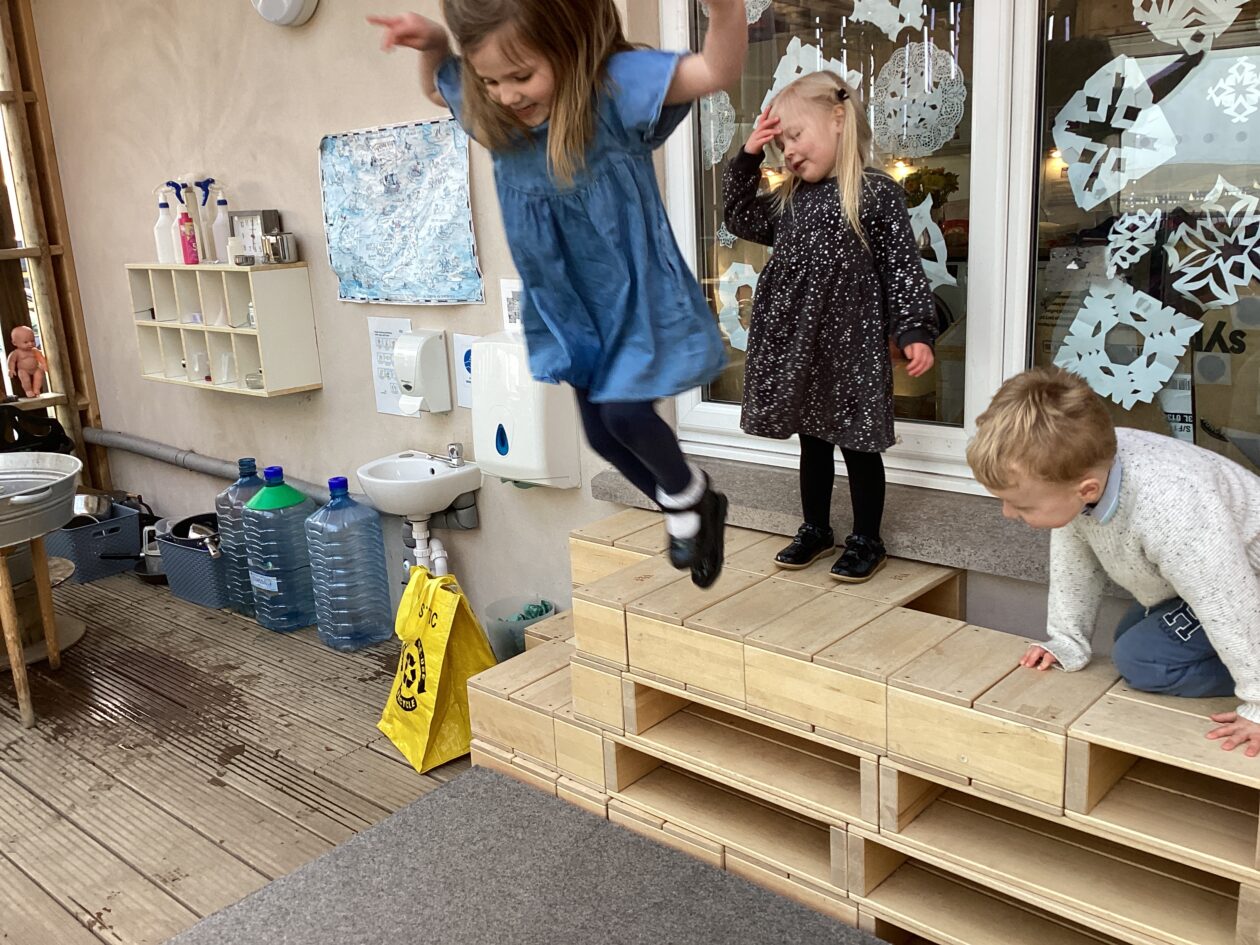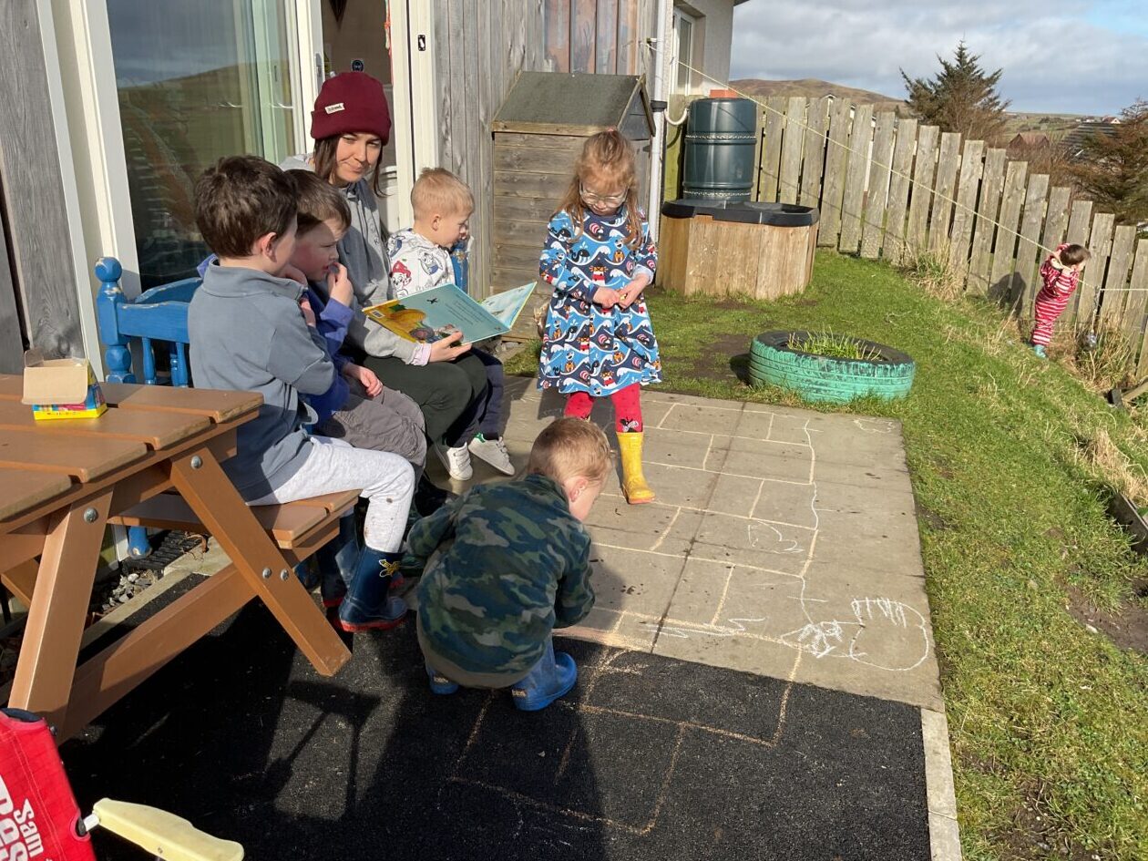 The outdoor room is always a popular choice and a great place to observe schemas (a repeated action used to explore and test theories in play). The bairns have used positioning, transporting, trajectory, enveloping, rotation and enclosure schemas in their play this week. They made paper aeroplanes and then built a platform to launch their planes from, watching how far they flew. They have also been engaged in imaginative play using the large hollow blocks and cable drums as fishing boats. “He is da een dat goes in da water. He is da fishing een and I’m da Captain.”