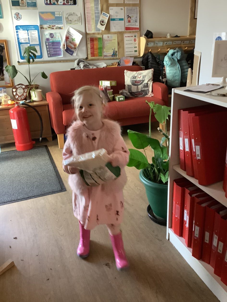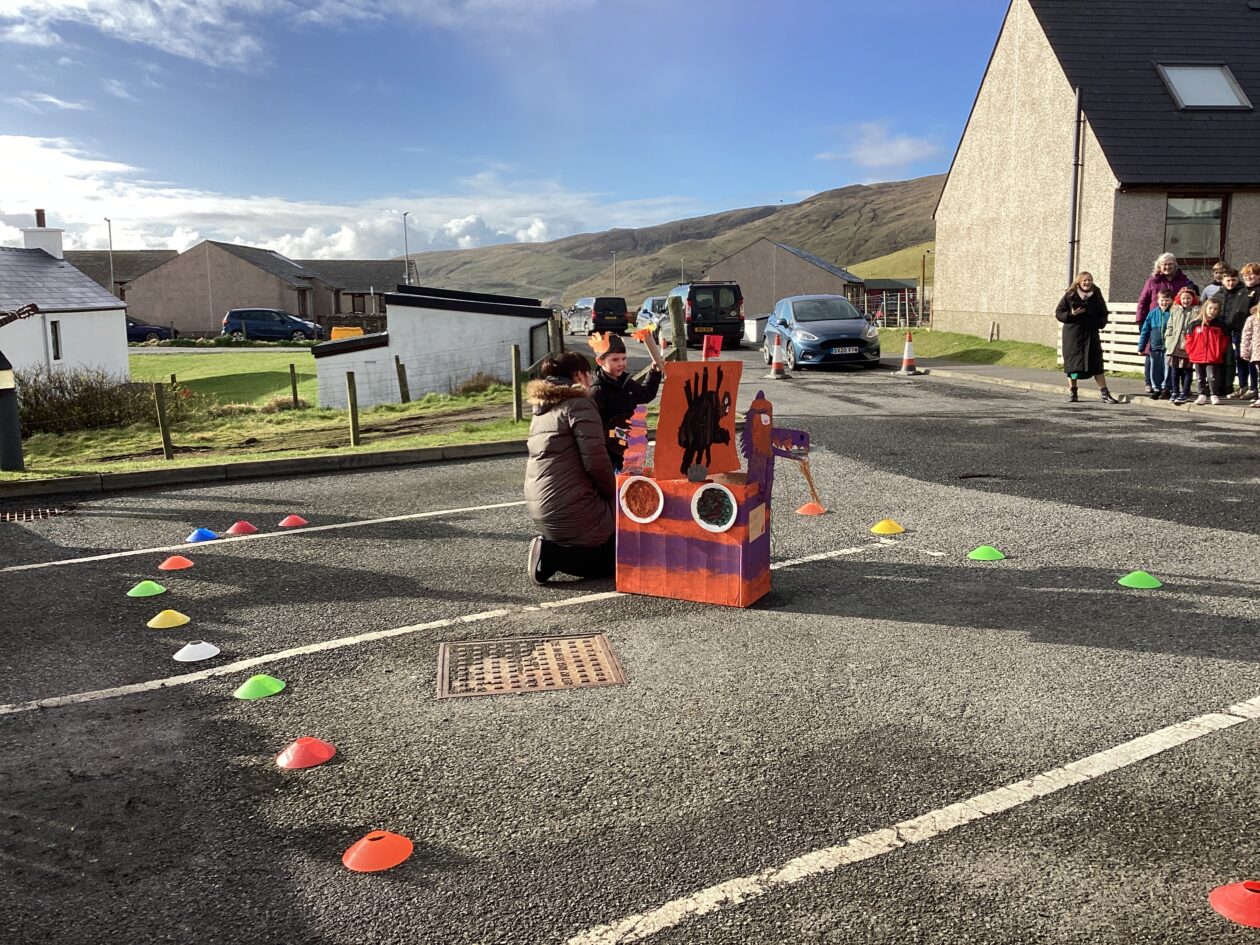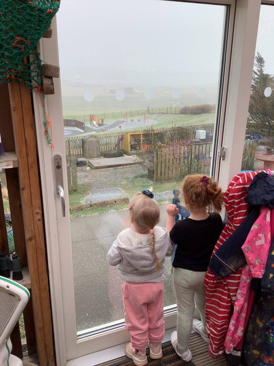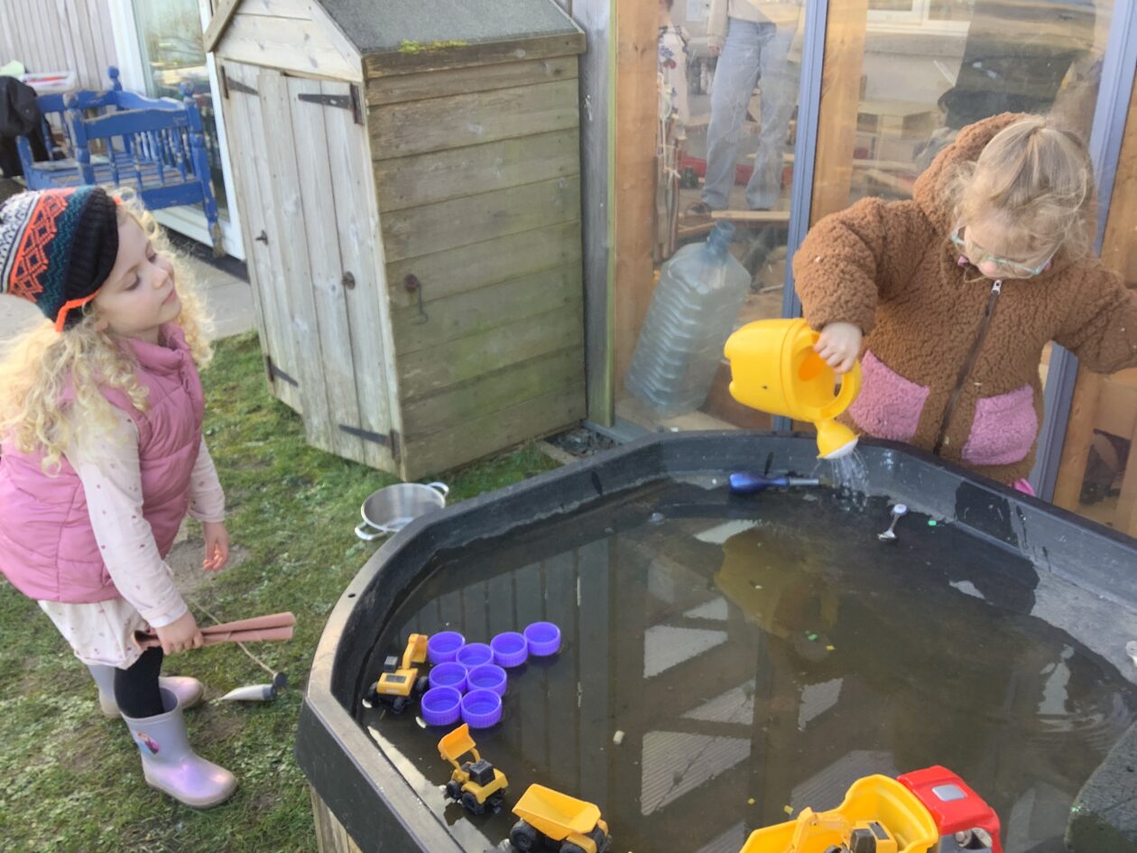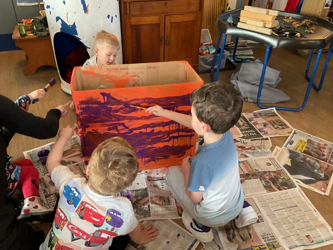 The outdoor room is always a popular choice and a great place to observe schemas (a repeated action used to explore and test theories in play). The bairns have used positioning, transporting, trajectory, enveloping, rotation and enclosure schemas in their play this week. They made paper aeroplanes and then built a platform to launch their planes from, watching how far they flew. They have also been engaged in imaginative play using the large hollow blocks and cable drums as fishing boats. “He is da een dat goes in da water. He is da fishing een and I’m da Captain.”