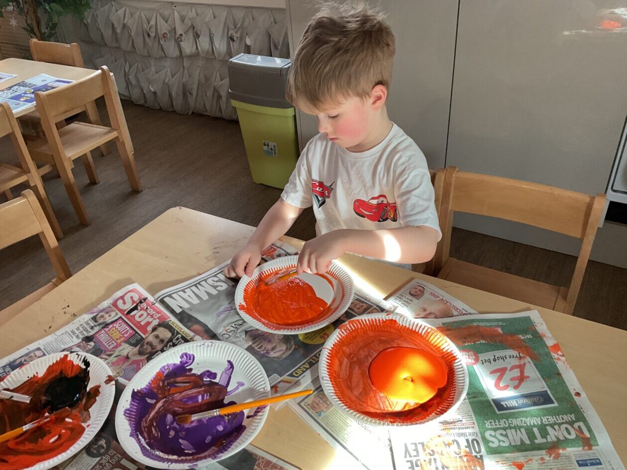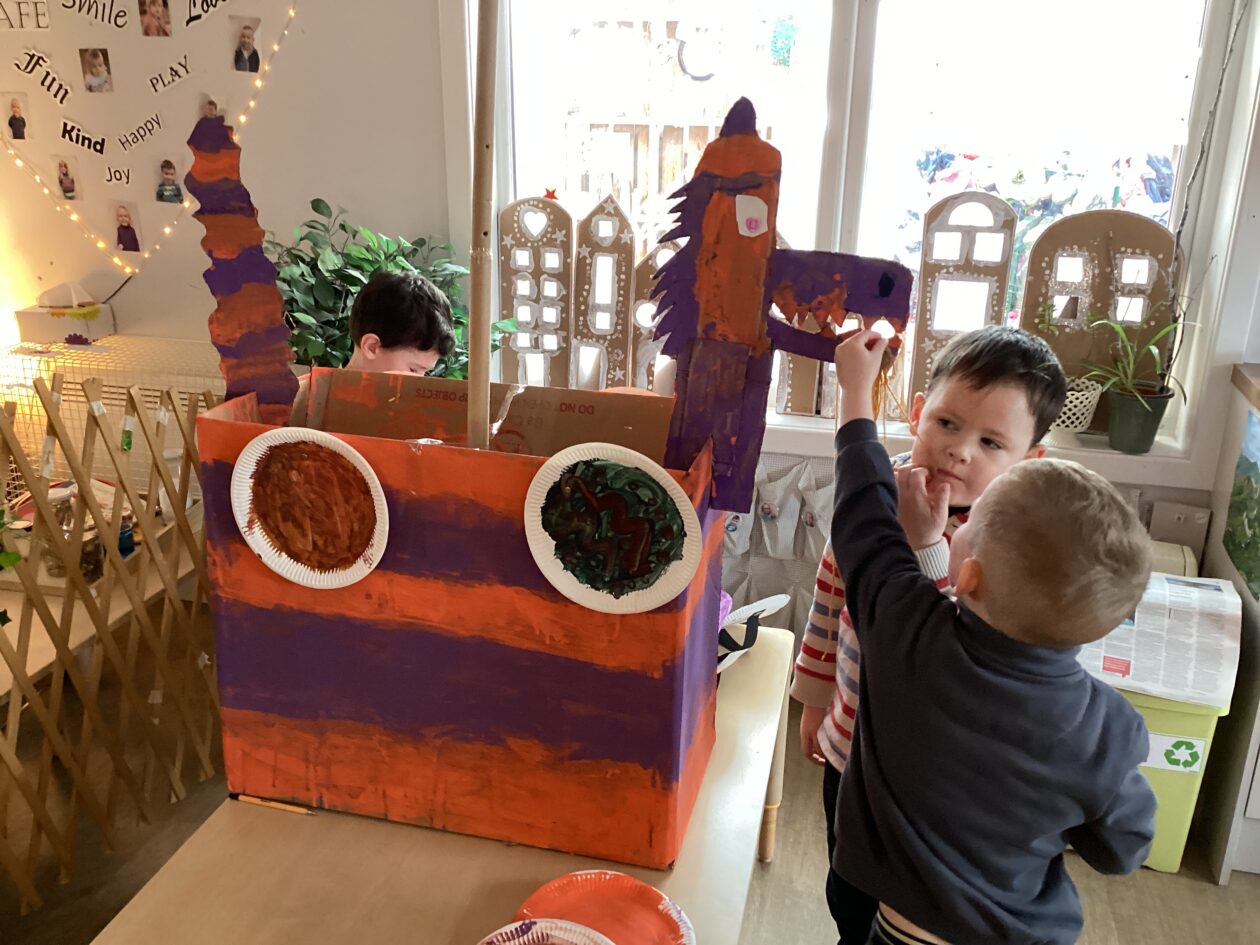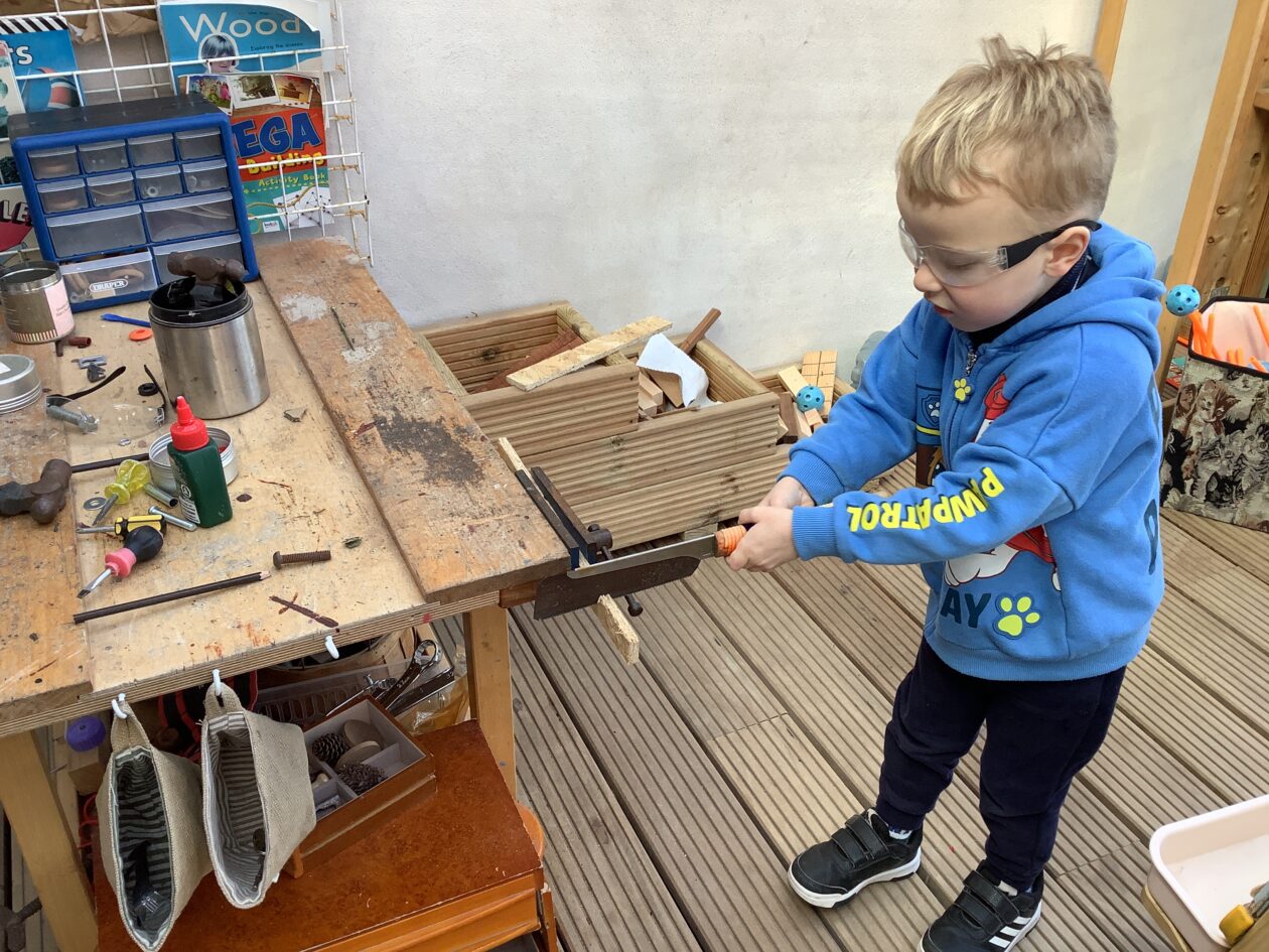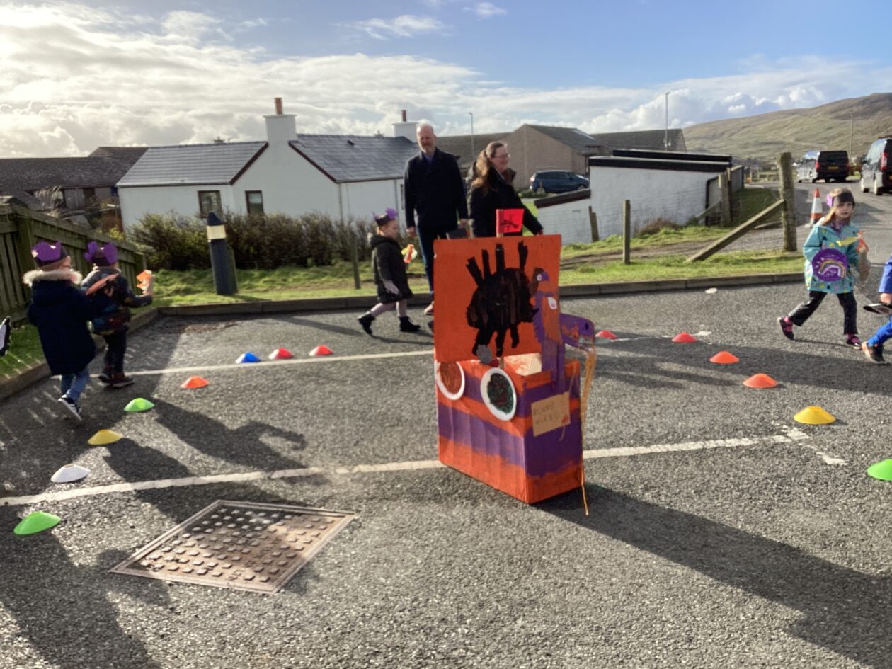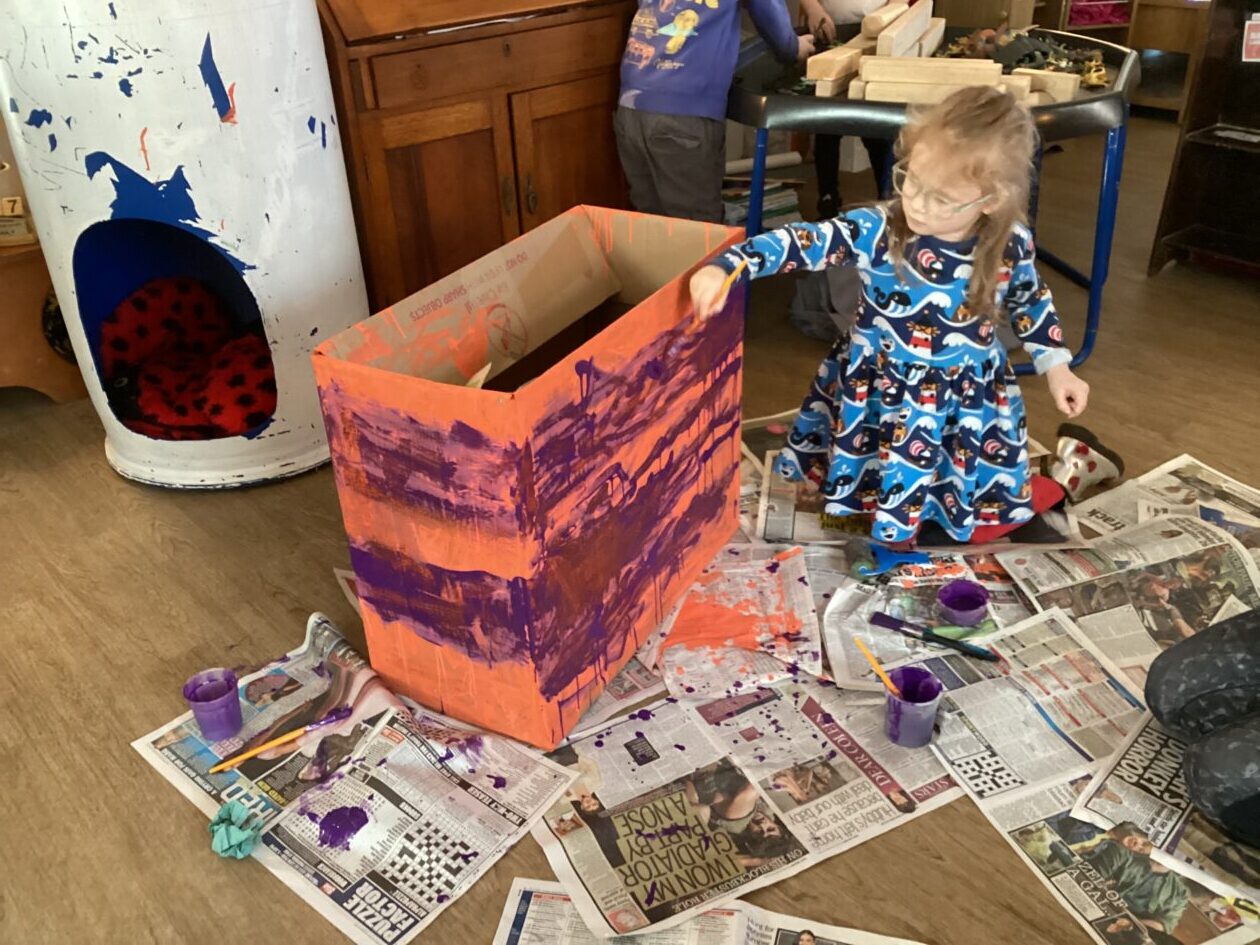 The outdoor room is always a popular choice and a great place to observe schemas (a repeated action used to explore and test theories in play). The bairns have used positioning, transporting, trajectory, enveloping, rotation and enclosure schemas in their play this week. They made paper aeroplanes and then built a platform to launch their planes from, watching how far they flew. They have also been engaged in imaginative play using the large hollow blocks and cable drums as fishing boats. “He is da een dat goes in da water. He is da fishing een and I’m da Captain.”
