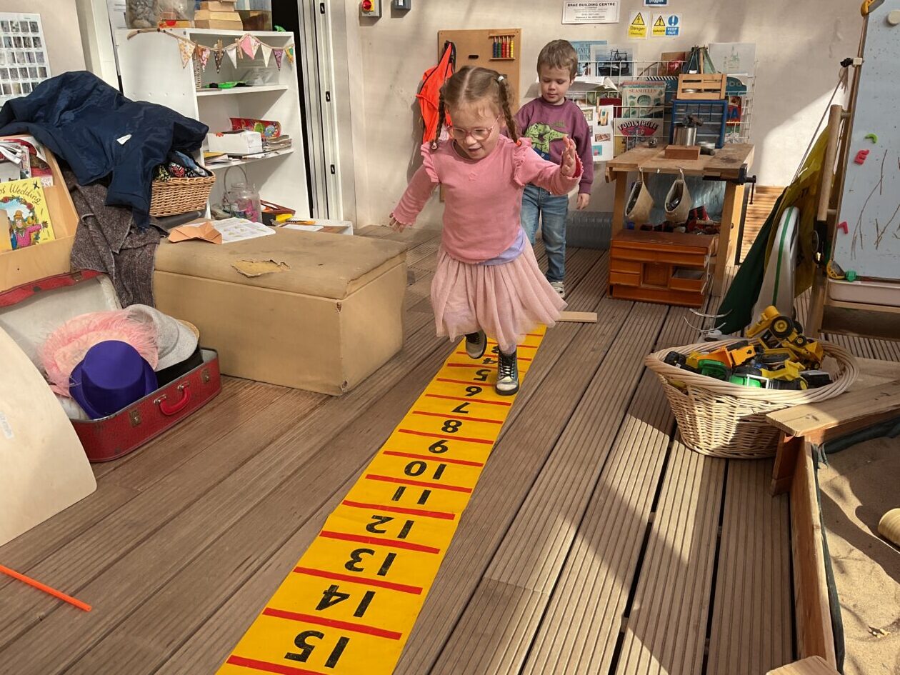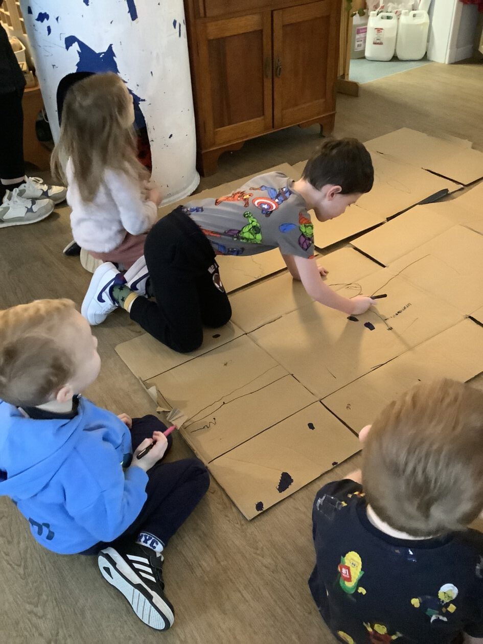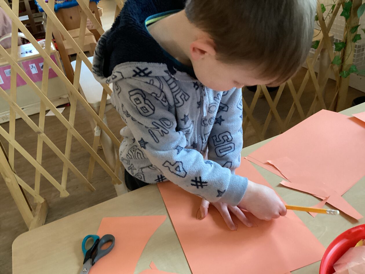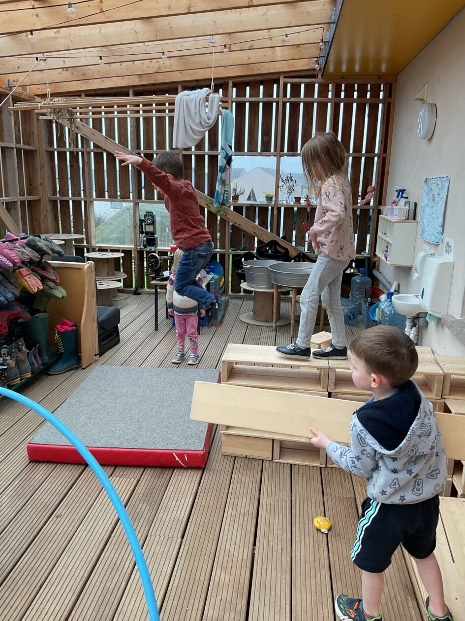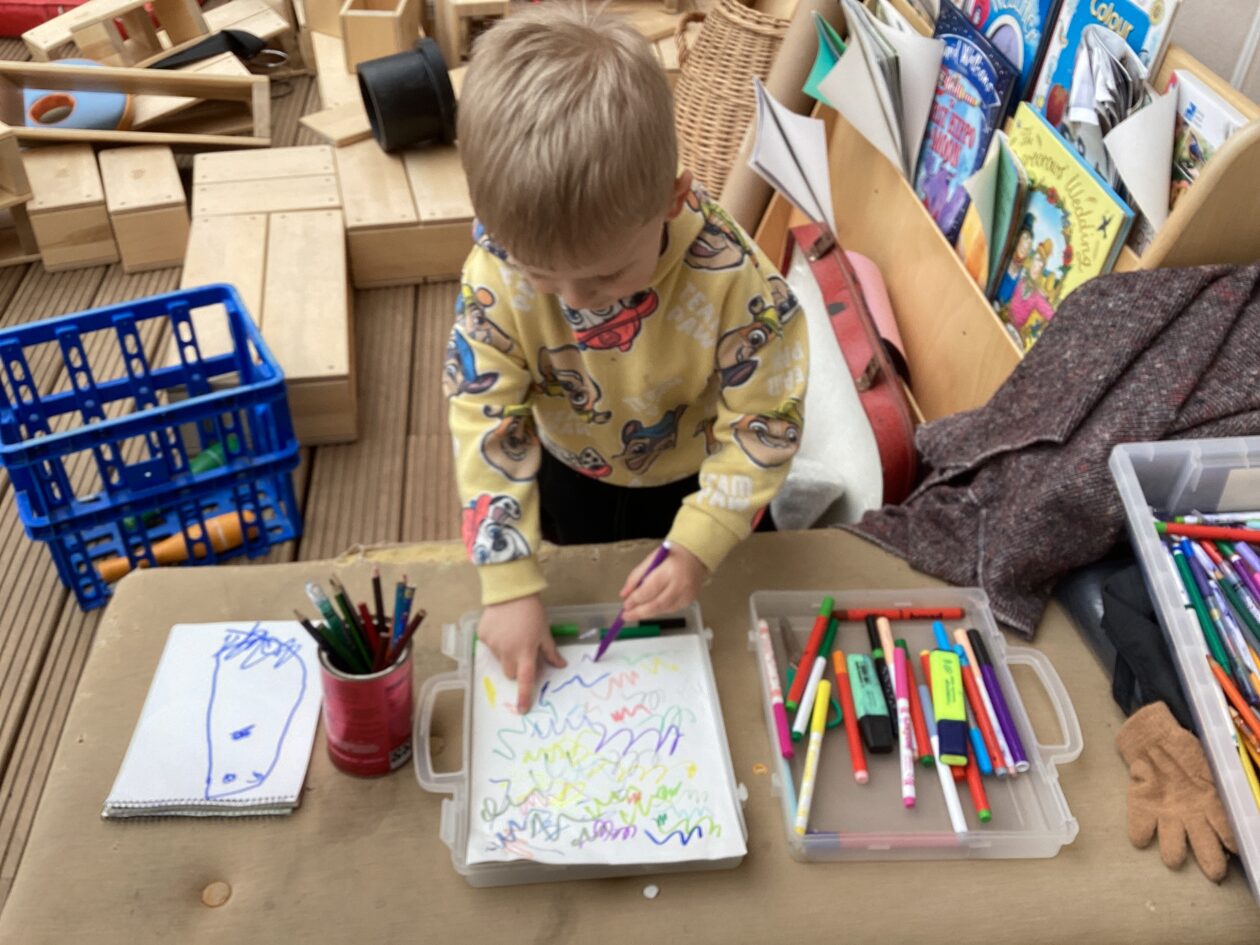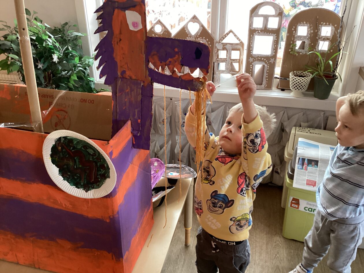 The outdoor room is always a popular choice and a great place to observe schemas (a repeated action used to explore and test theories in play). The bairns have used positioning, transporting, trajectory, enveloping, rotation and enclosure schemas in their play this week. They made paper aeroplanes and then built a platform to launch their planes from, watching how far they flew. They have also been engaged in imaginative play using the large hollow blocks and cable drums as fishing boats. “He is da een dat goes in da water. He is da fishing een and I’m da Captain.”