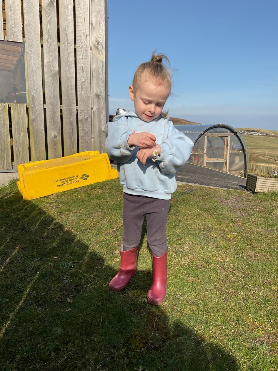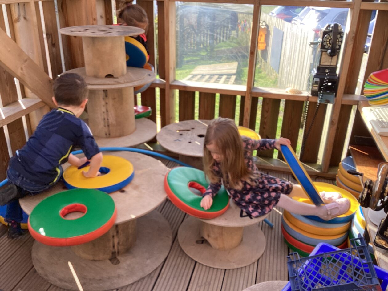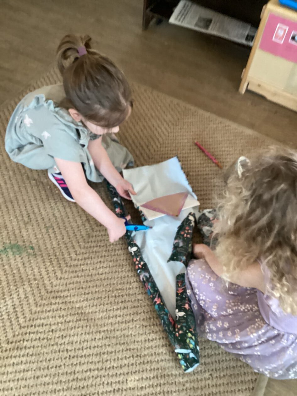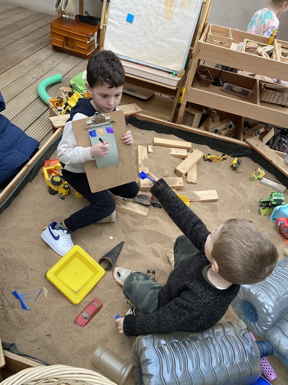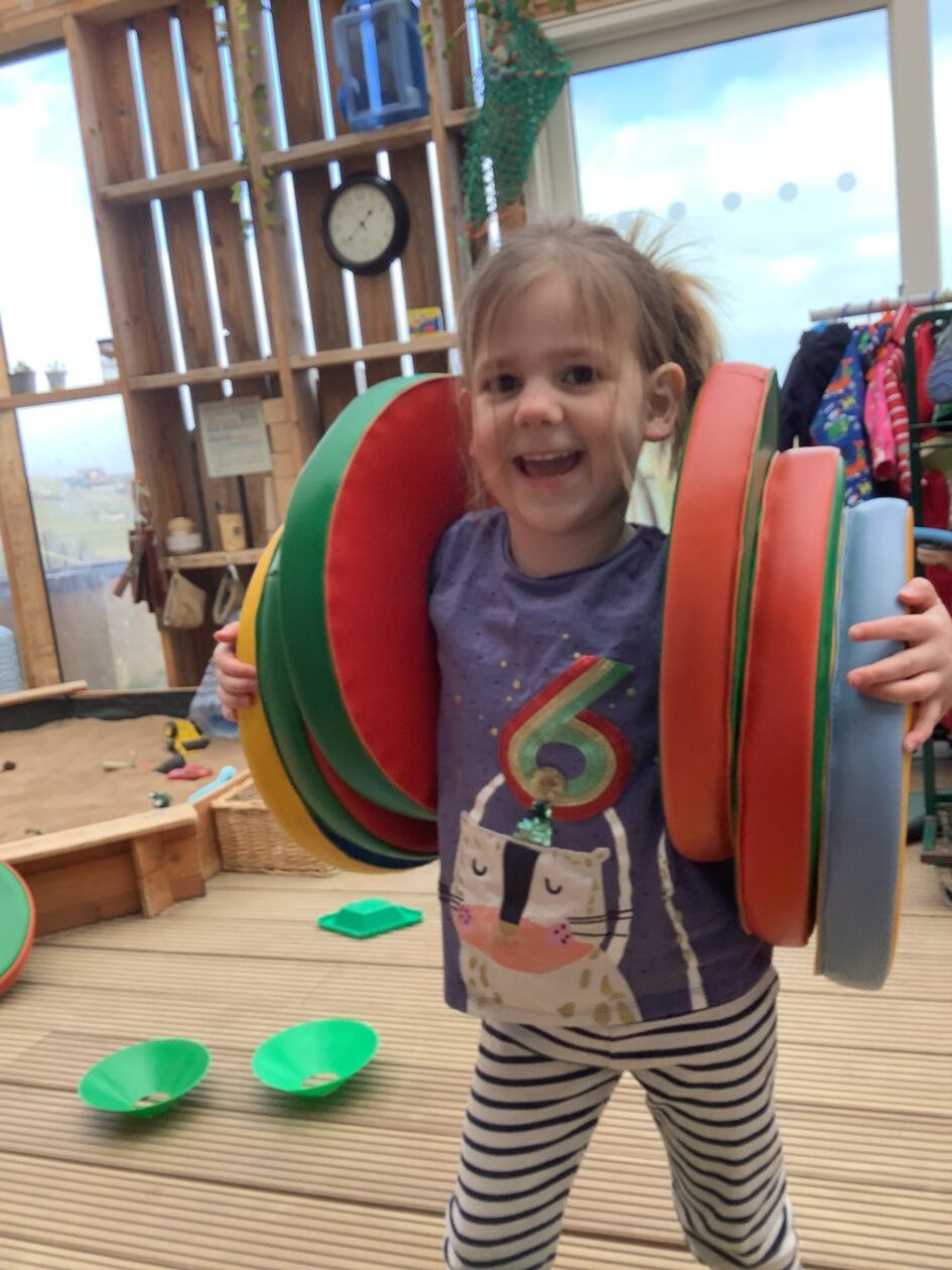 The outdoor room is always a popular choice and a great place to observe schemas (a repeated action used to explore and test theories in play). The bairns have used positioning, transporting, trajectory, enveloping, rotation and enclosure schemas in their play this week. They made paper aeroplanes and then built a platform to launch their planes from, watching how far they flew. They have also been engaged in imaginative play using the large hollow blocks and cable drums as fishing boats. “He is da een dat goes in da water. He is da fishing een and I’m da Captain.”