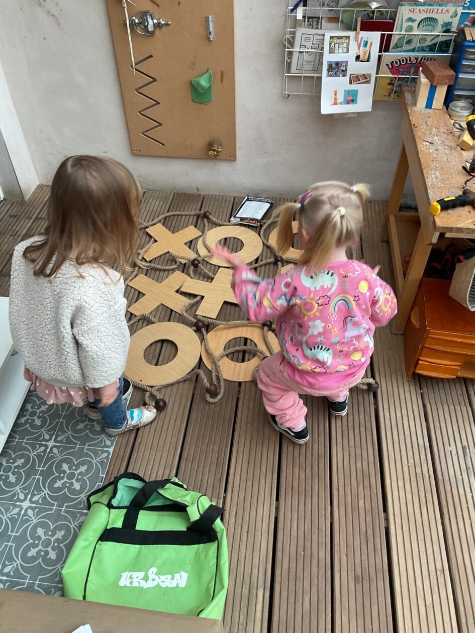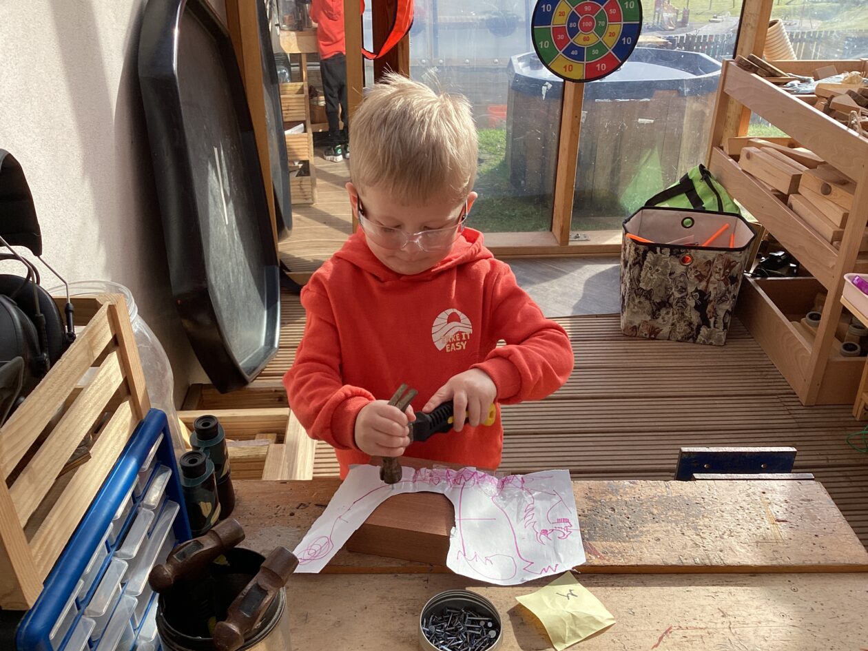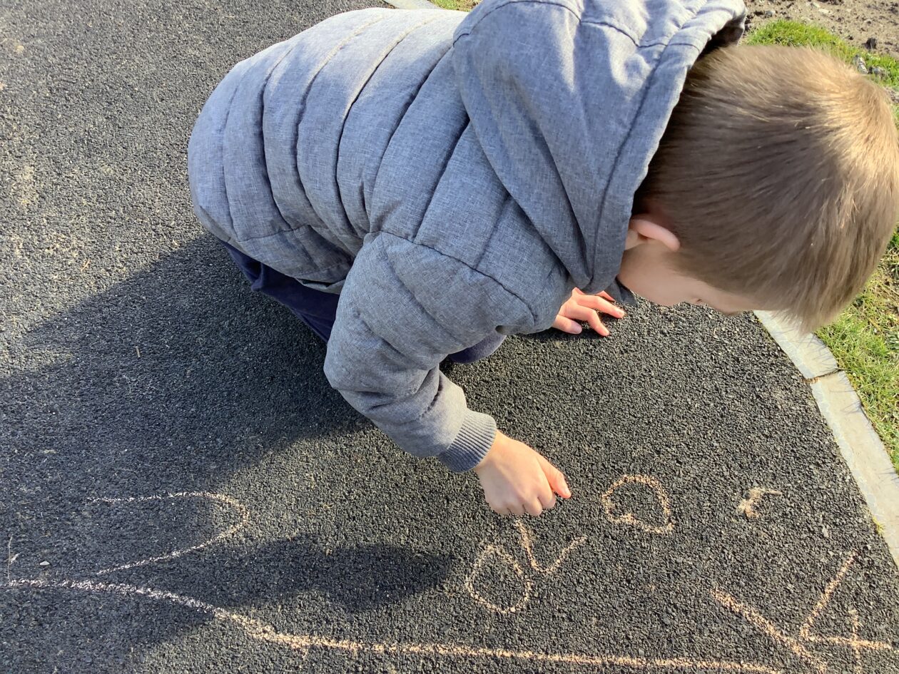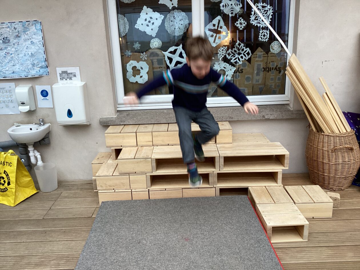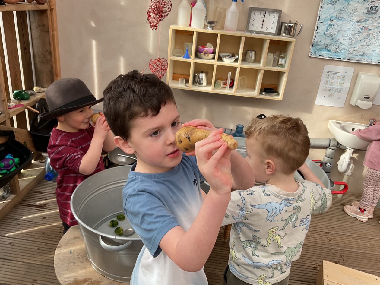 The outdoor room is always a popular choice and a great place to observe schemas (a repeated action used to explore and test theories in play). The bairns have used positioning, transporting, trajectory, enveloping, rotation and enclosure schemas in their play this week. They made paper aeroplanes and then built a platform to launch their planes from, watching how far they flew. They have also been engaged in imaginative play using the large hollow blocks and cable drums as fishing boats. “He is da een dat goes in da water. He is da fishing een and I’m da Captain.”