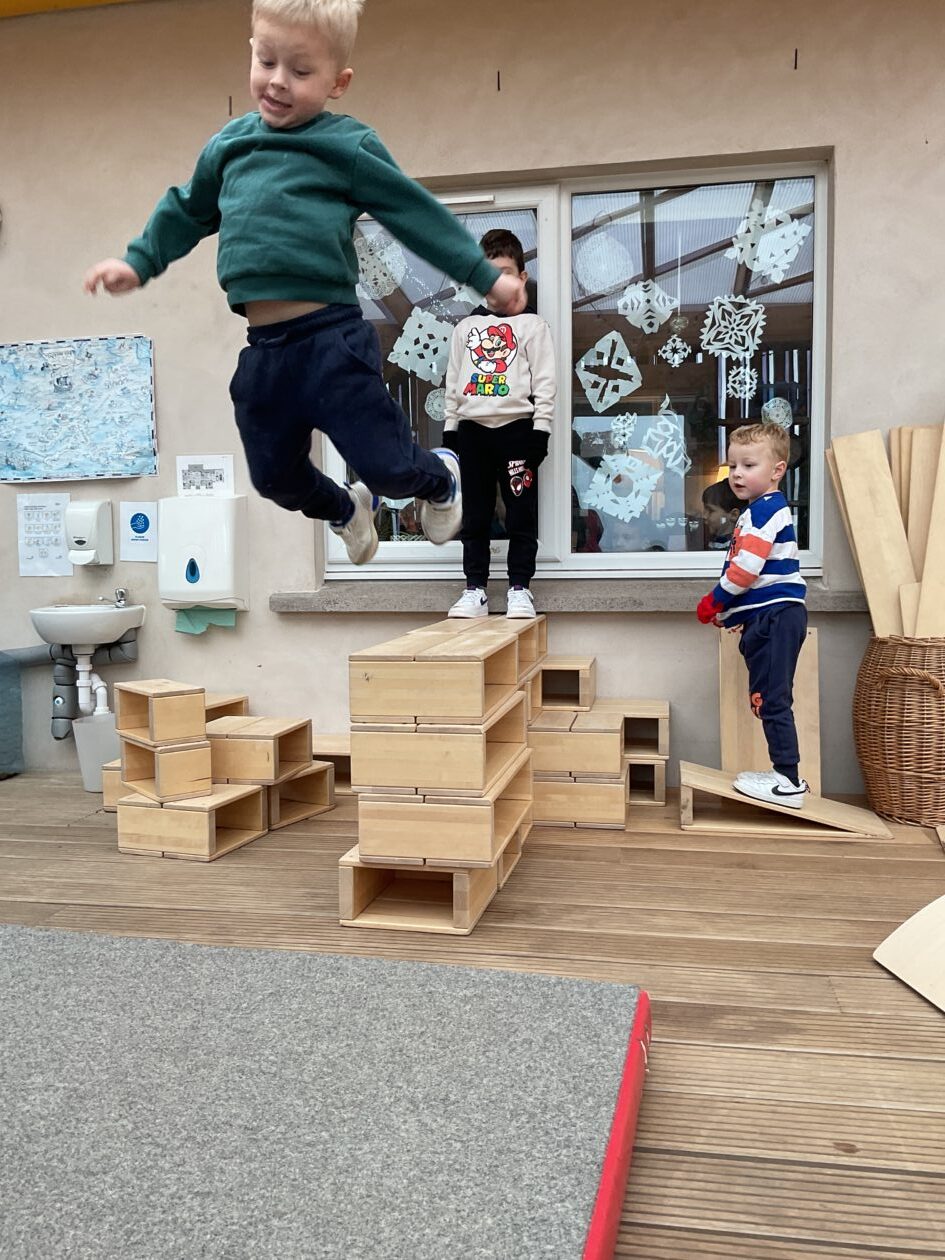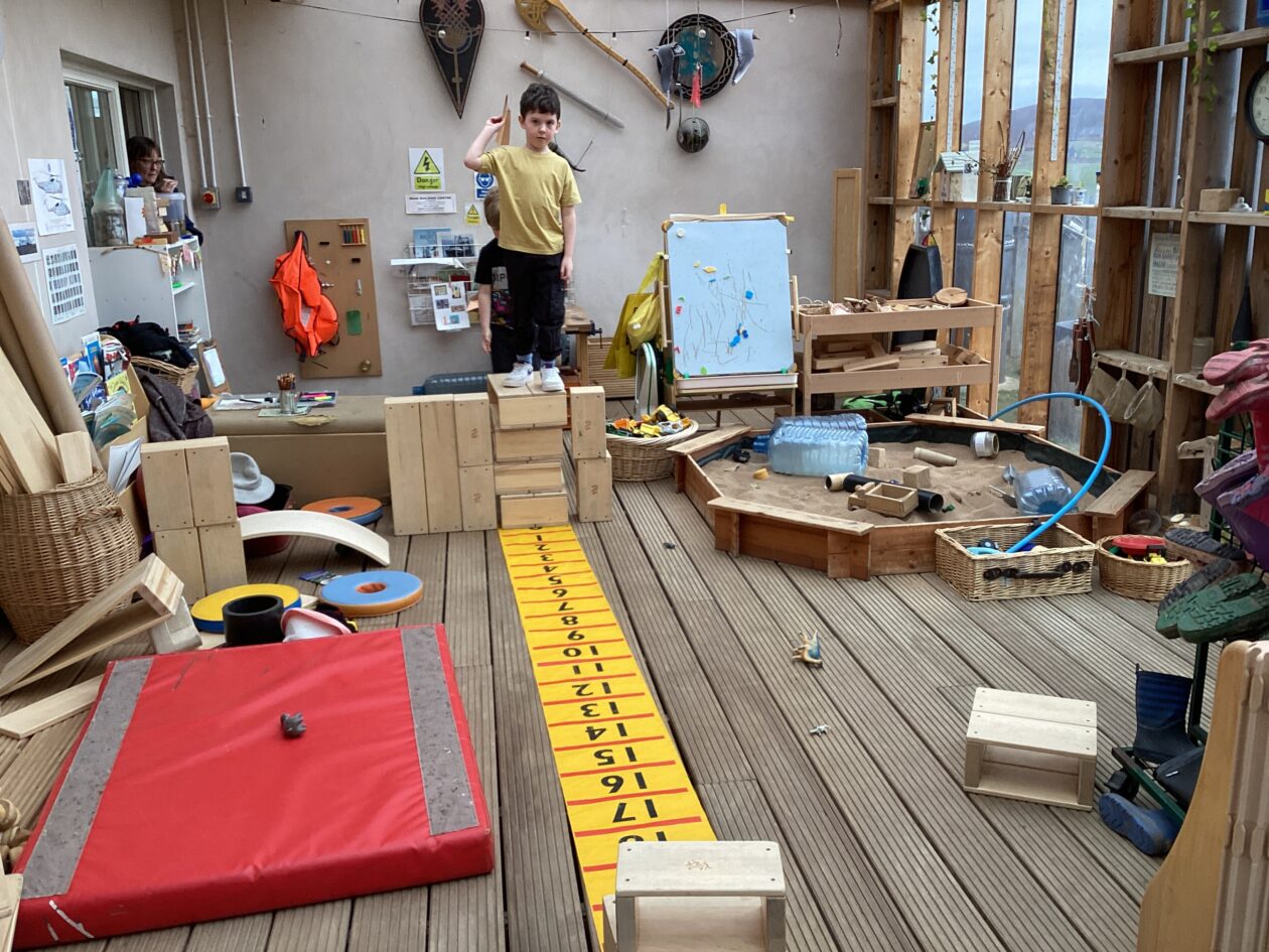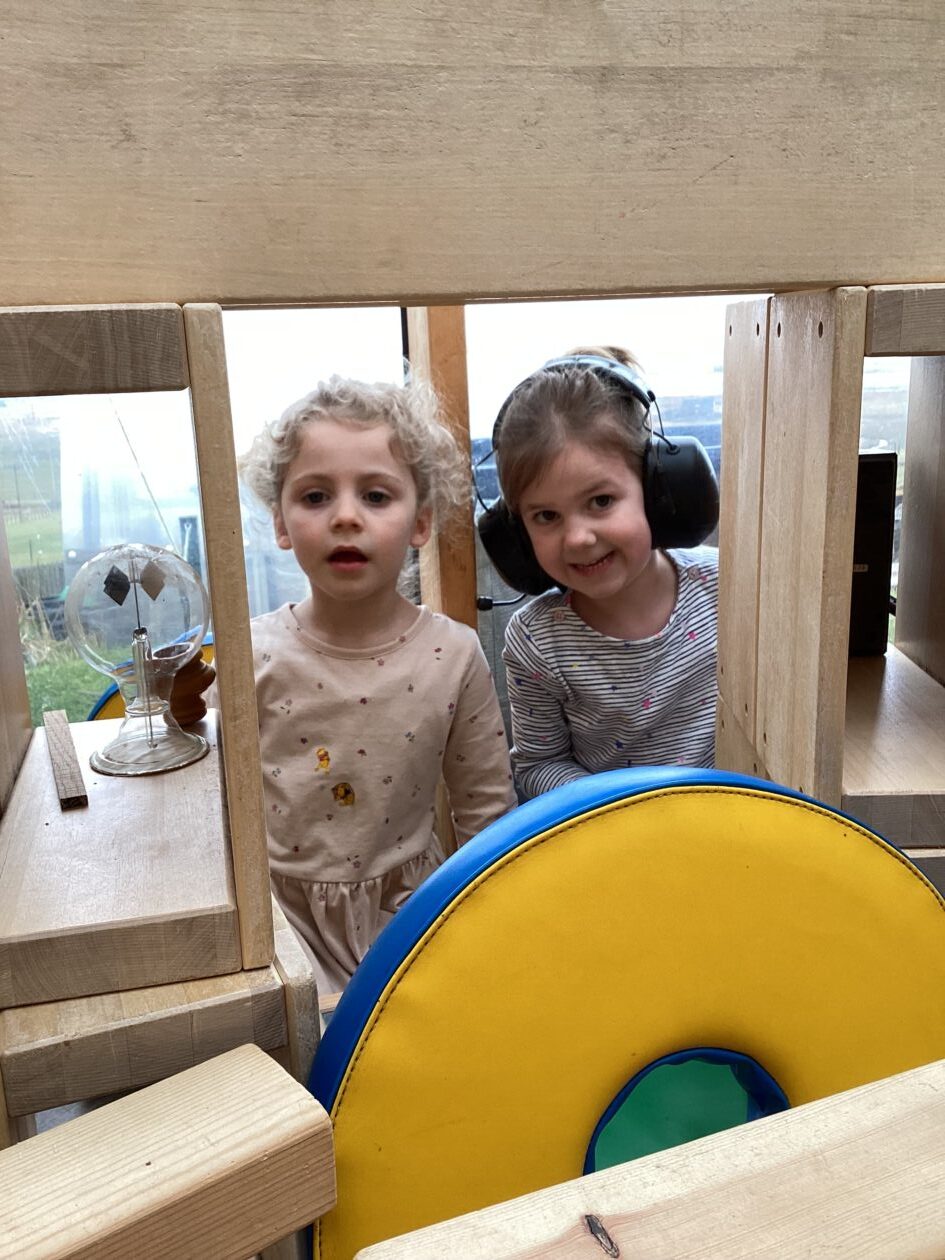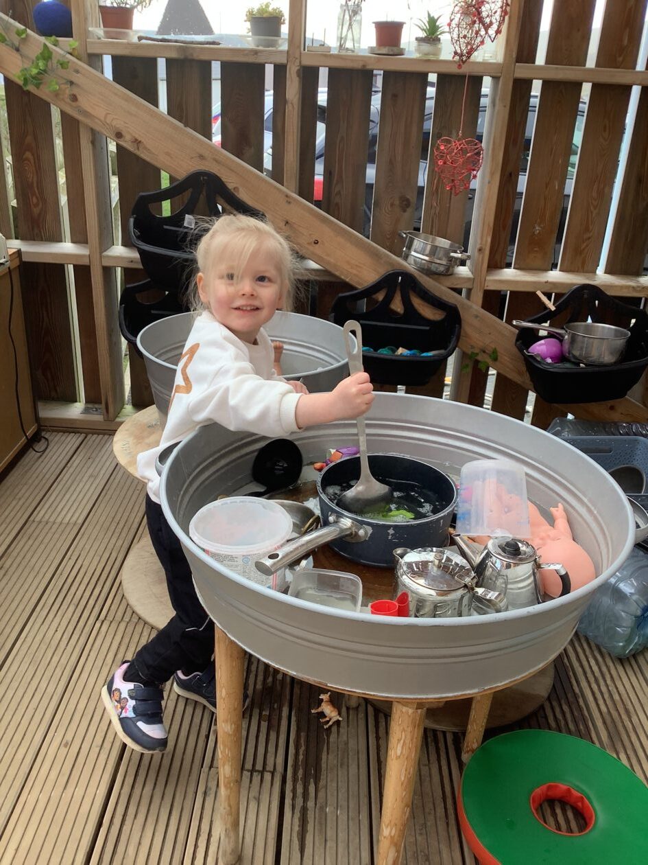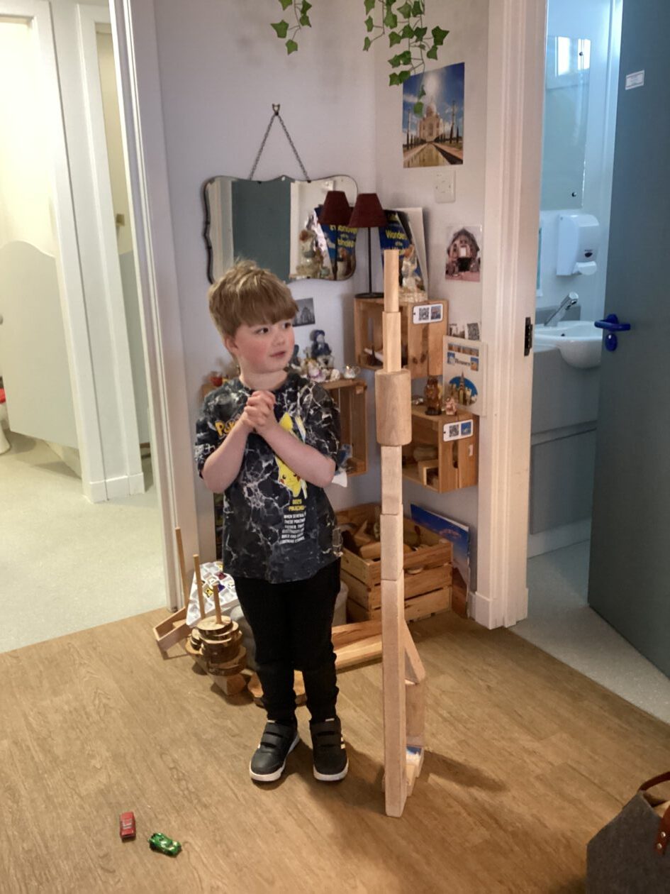 The outdoor room is always a popular choice and a great place to observe schemas (a repeated action used to explore and test theories in play). The bairns have used positioning, transporting, trajectory, enveloping, rotation and enclosure schemas in their play this week. They made paper aeroplanes and then built a platform to launch their planes from, watching how far they flew. They have also been engaged in imaginative play using the large hollow blocks and cable drums as fishing boats. “He is da een dat goes in da water. He is da fishing een and I’m da Captain.”