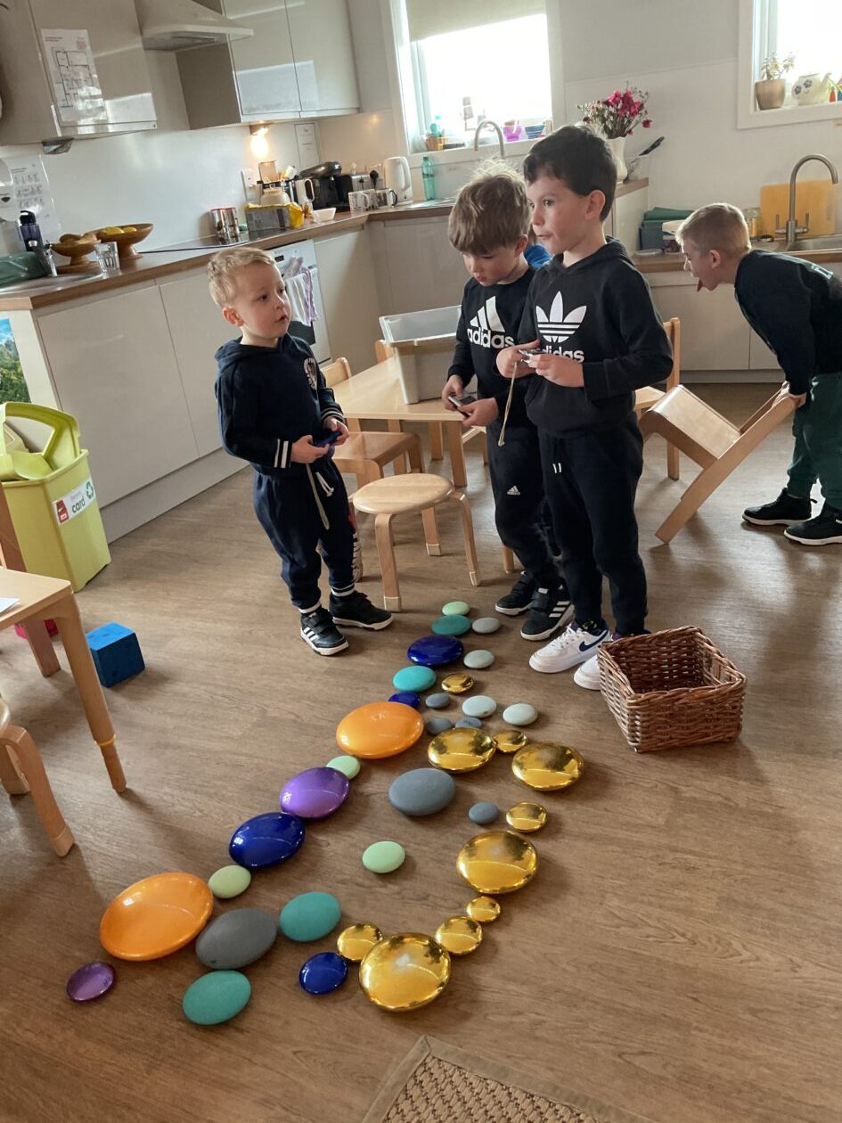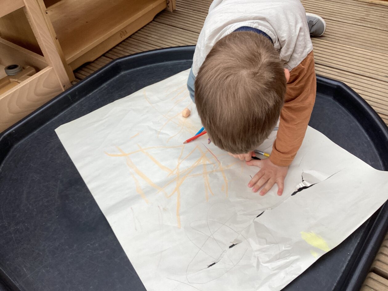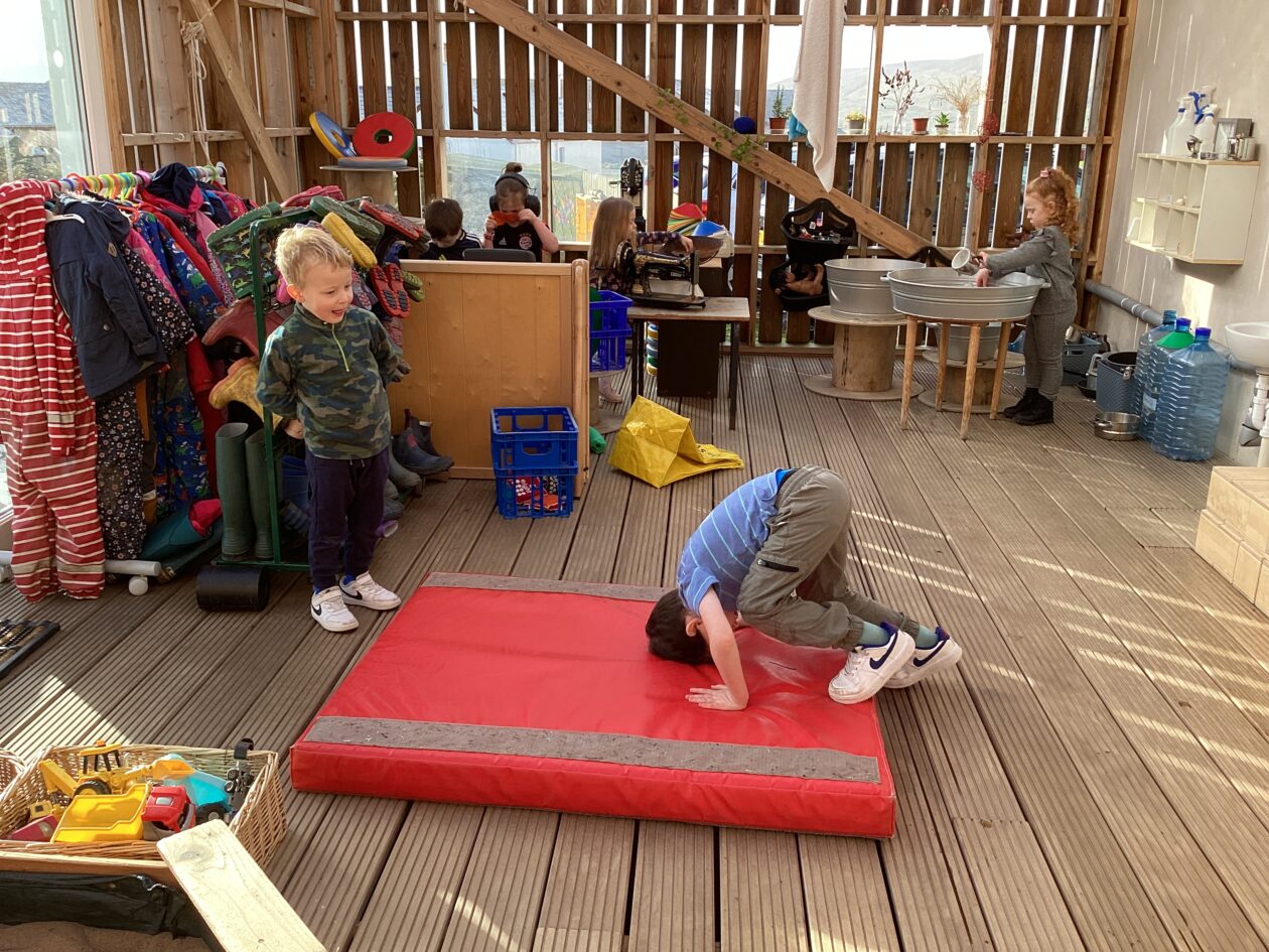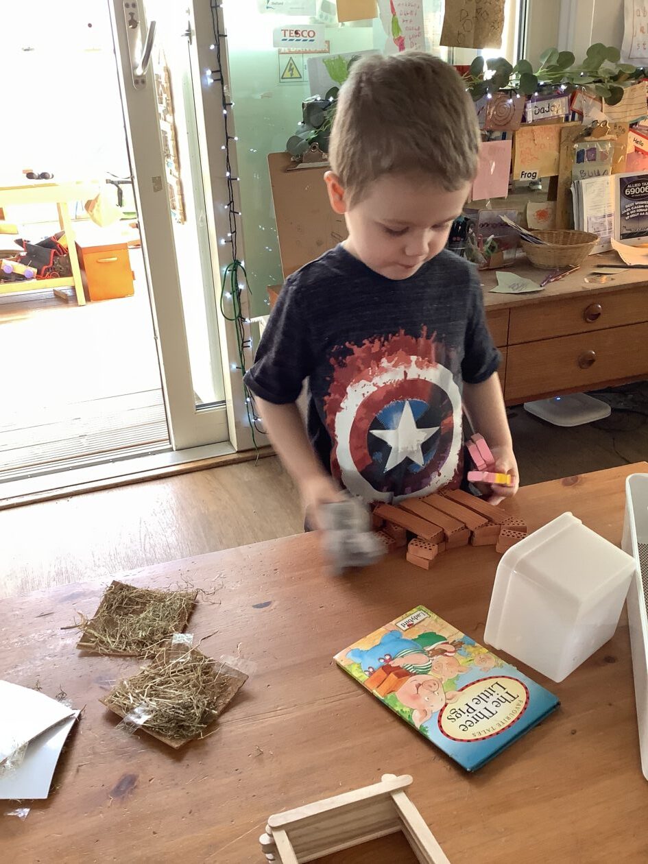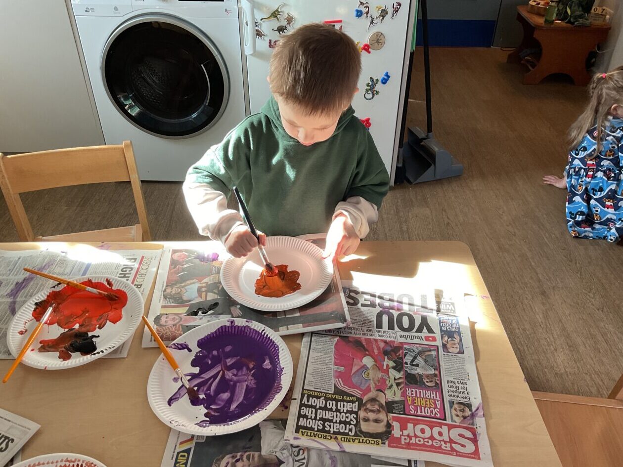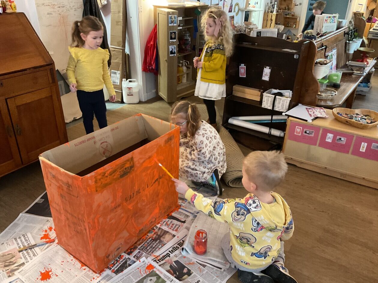The outdoor room is always a popular choice and a great place to observe schemas (a repeated action used to explore and test theories in play). The bairns have used positioning, transporting, trajectory, enveloping, rotation and enclosure schemas in their play this week. They made paper aeroplanes and then built a platform to launch their planes from, watching how far they flew. They have also been engaged in imaginative play using the large hollow blocks and cable drums as fishing boats. “He is da een dat goes in da water. He is da fishing een and I’m da Captain.”