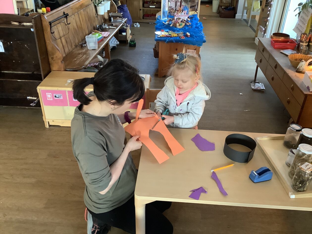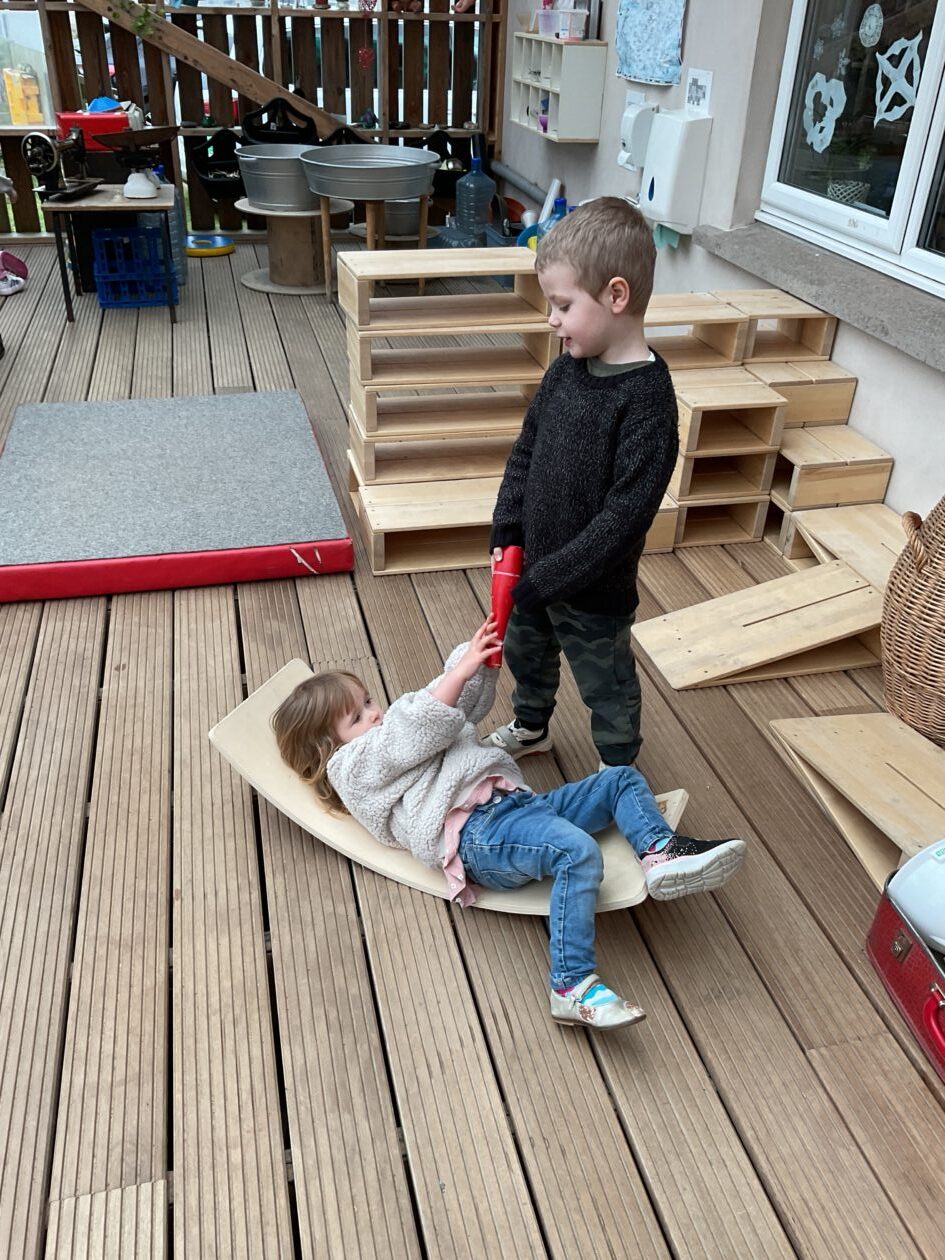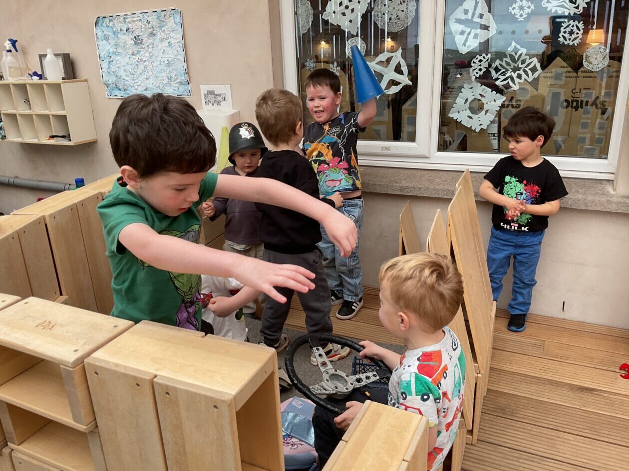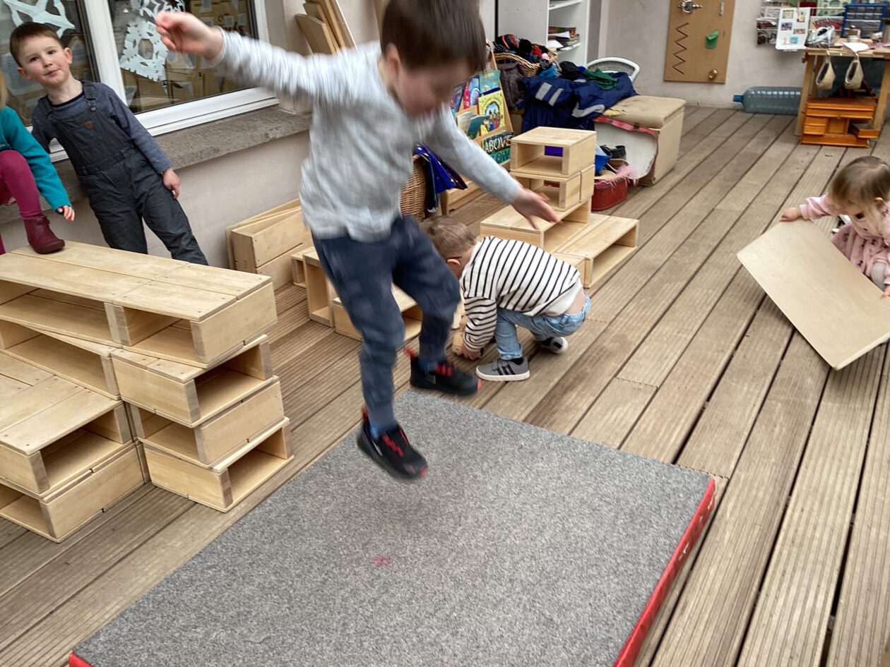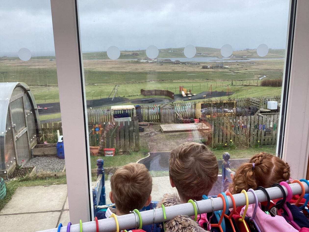 The outdoor room is always a popular choice and a great place to observe schemas (a repeated action used to explore and test theories in play). The bairns have used positioning, transporting, trajectory, enveloping, rotation and enclosure schemas in their play this week. They made paper aeroplanes and then built a platform to launch their planes from, watching how far they flew. They have also been engaged in imaginative play using the large hollow blocks and cable drums as fishing boats. “He is da een dat goes in da water. He is da fishing een and I’m da Captain.”