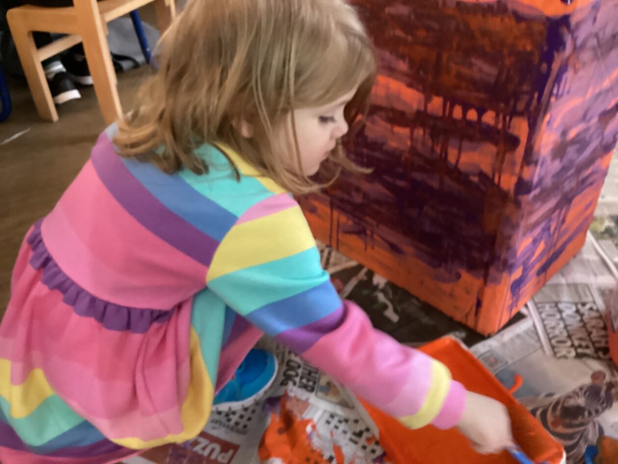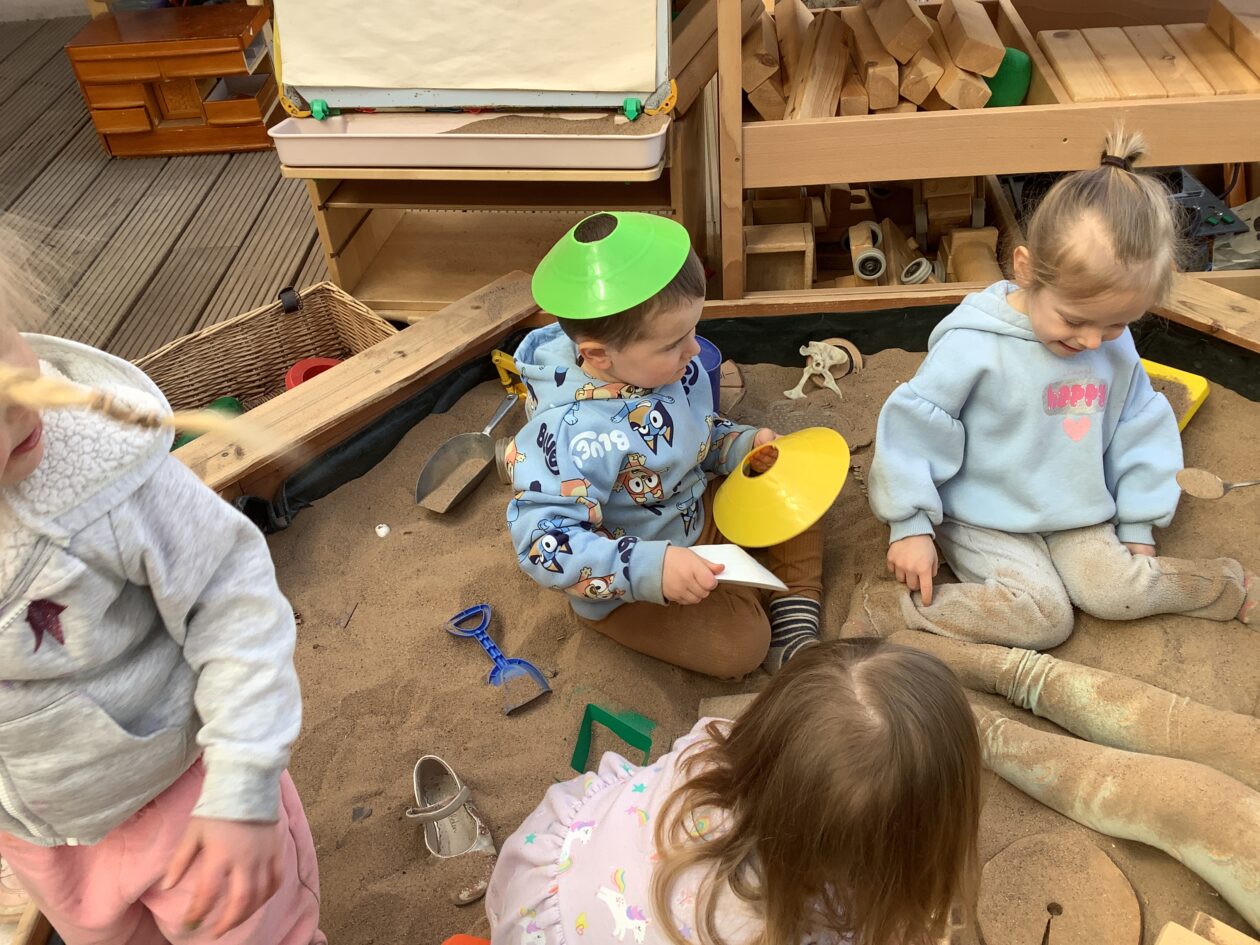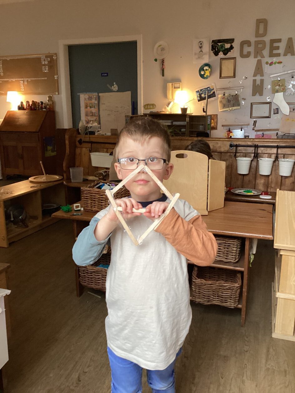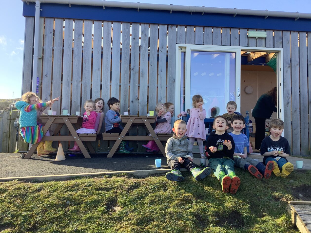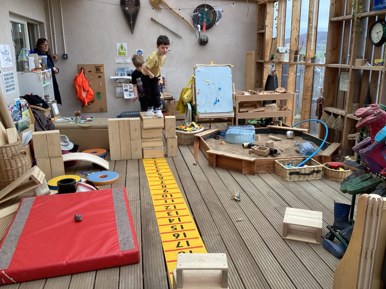 The outdoor room is always a popular choice and a great place to observe schemas (a repeated action used to explore and test theories in play). The bairns have used positioning, transporting, trajectory, enveloping, rotation and enclosure schemas in their play this week. They made paper aeroplanes and then built a platform to launch their planes from, watching how far they flew. They have also been engaged in imaginative play using the large hollow blocks and cable drums as fishing boats. “He is da een dat goes in da water. He is da fishing een and I’m da Captain.”
