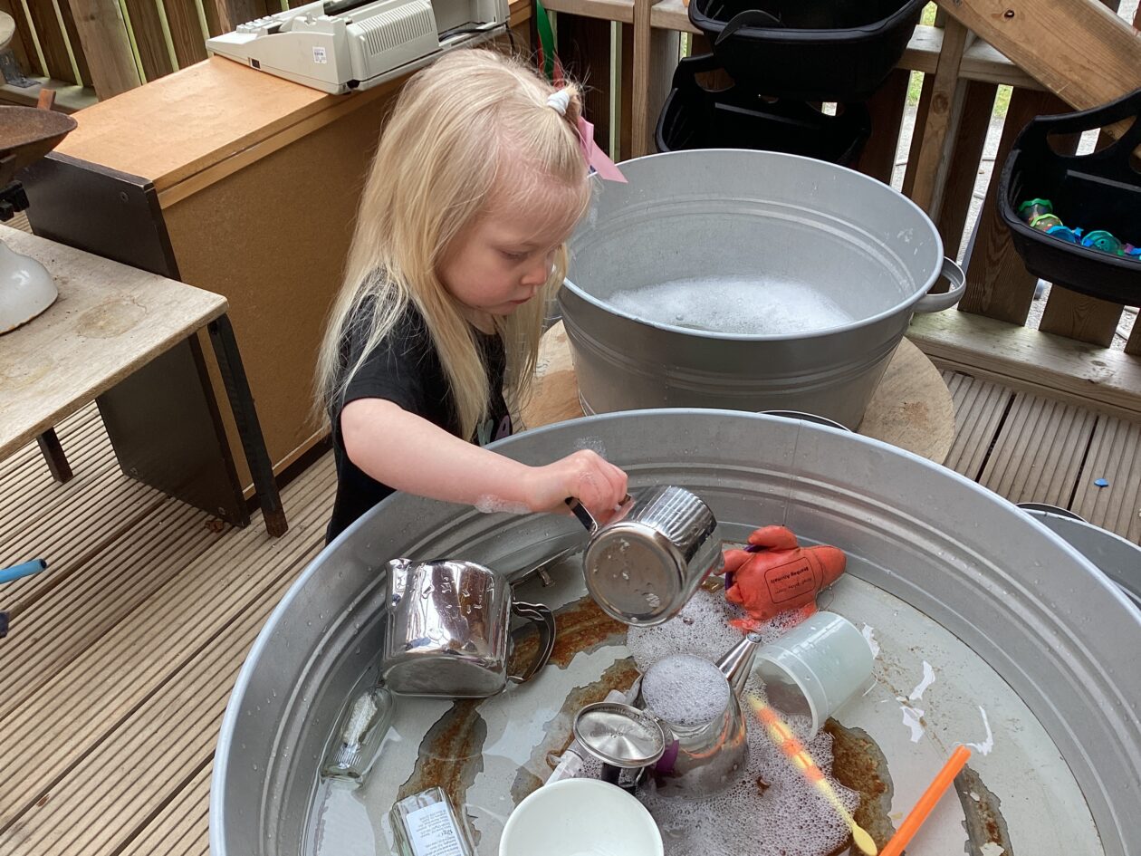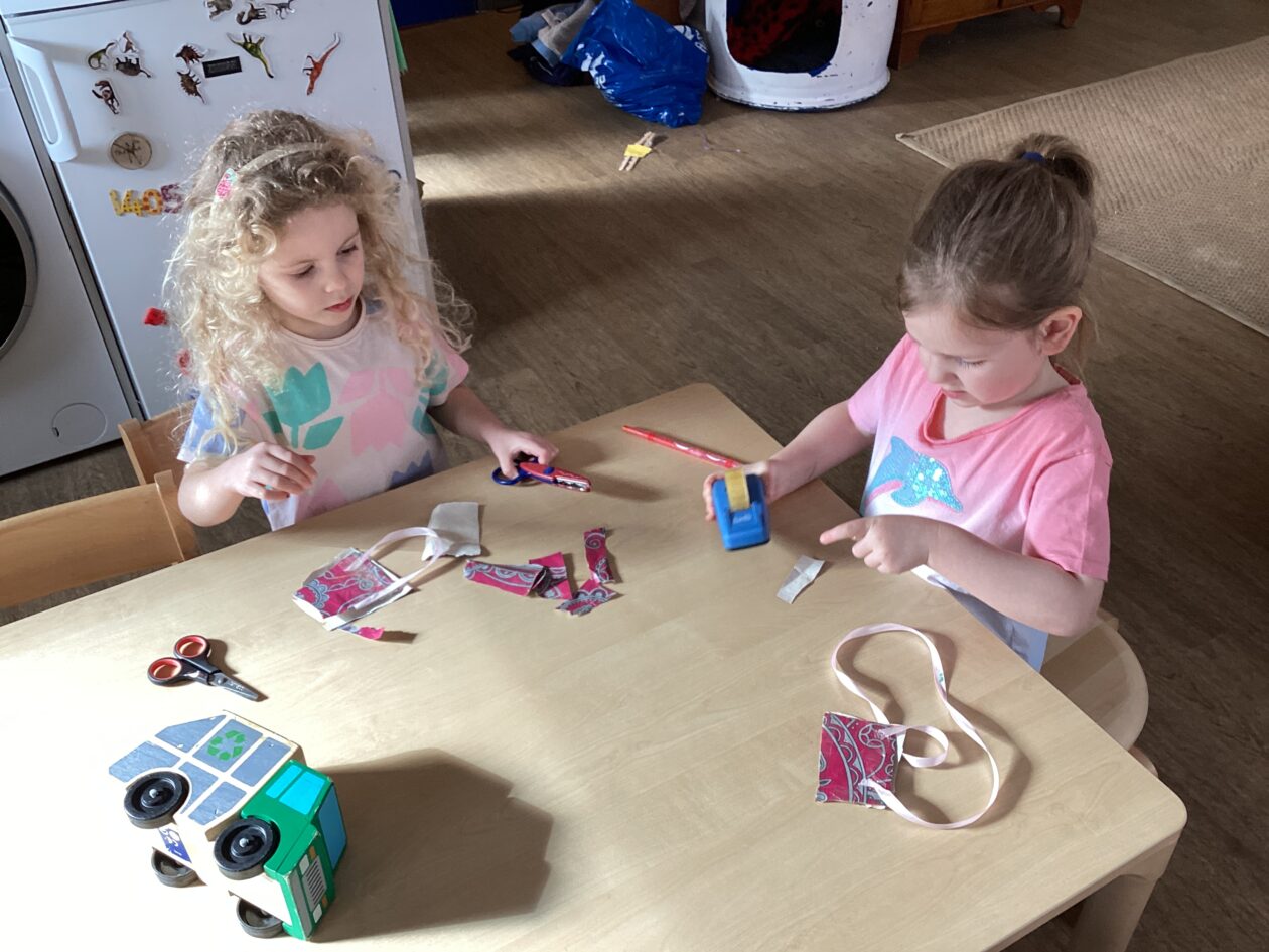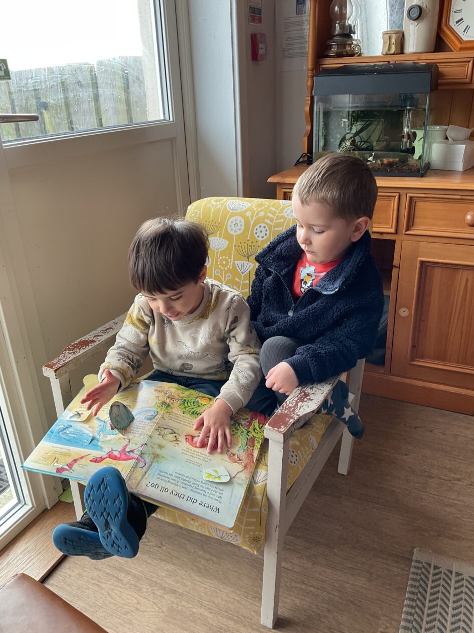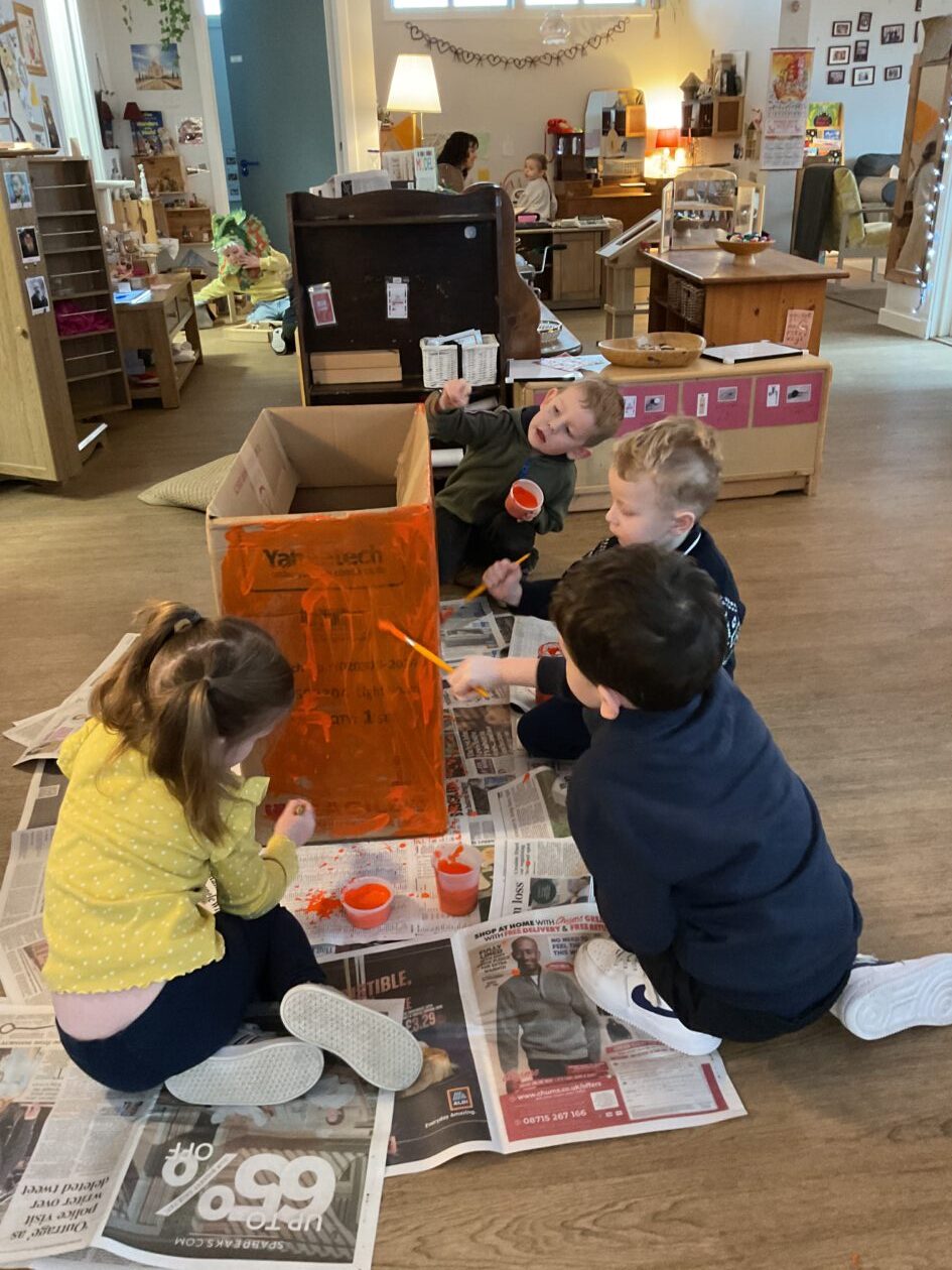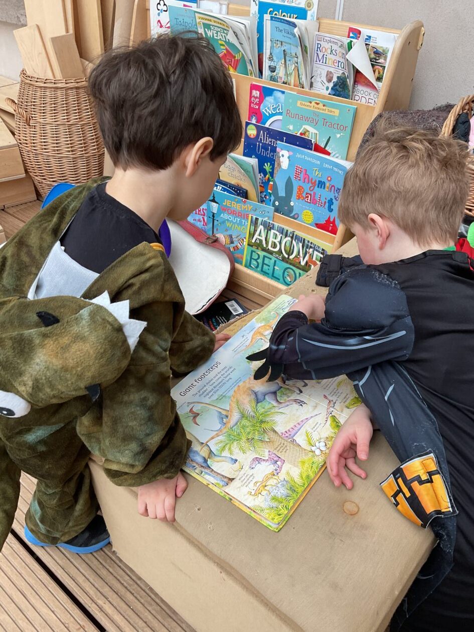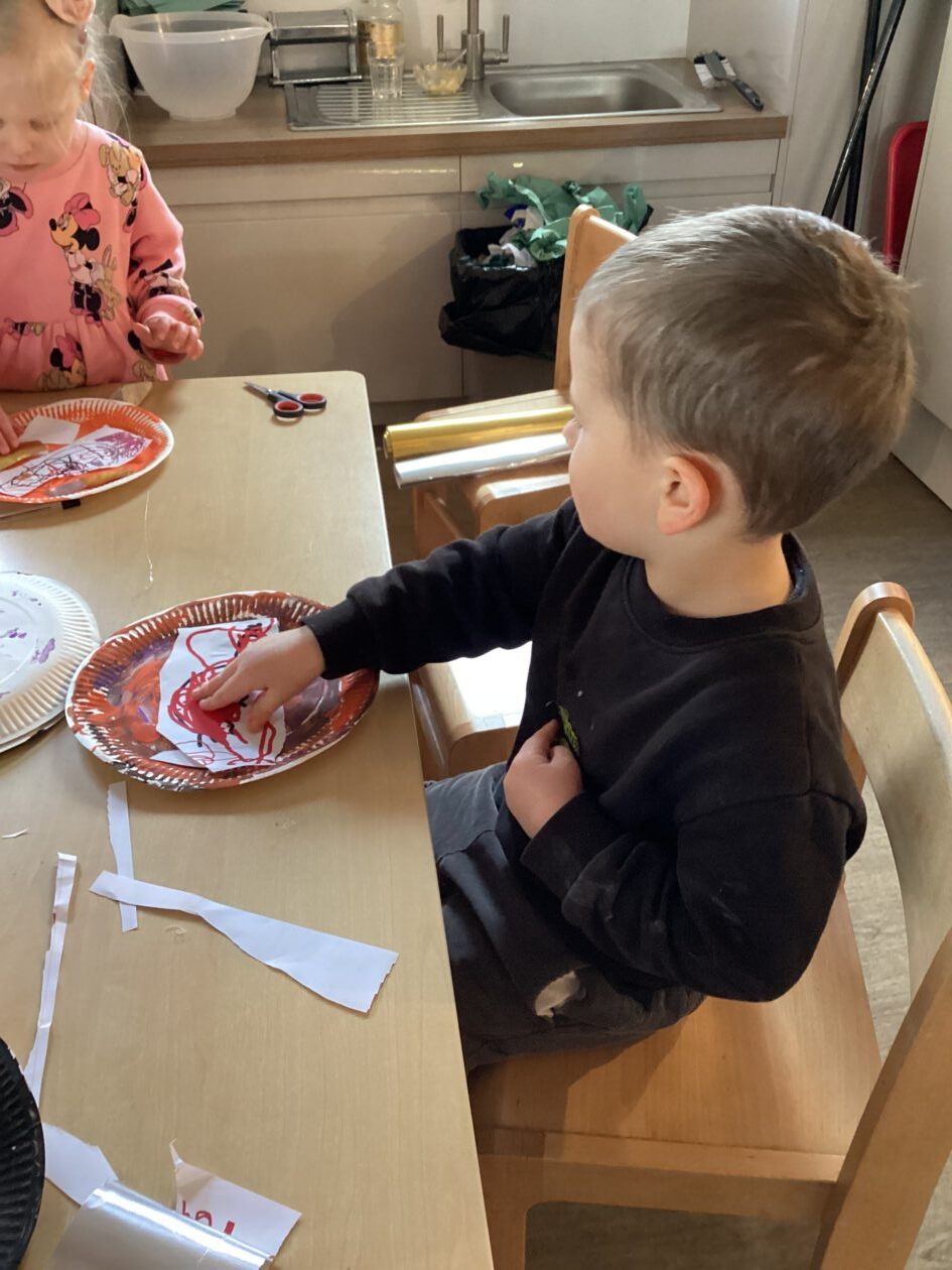 The outdoor room is always a popular choice and a great place to observe schemas (a repeated action used to explore and test theories in play). The bairns have used positioning, transporting, trajectory, enveloping, rotation and enclosure schemas in their play this week. They made paper aeroplanes and then built a platform to launch their planes from, watching how far they flew. They have also been engaged in imaginative play using the large hollow blocks and cable drums as fishing boats. “He is da een dat goes in da water. He is da fishing een and I’m da Captain.”