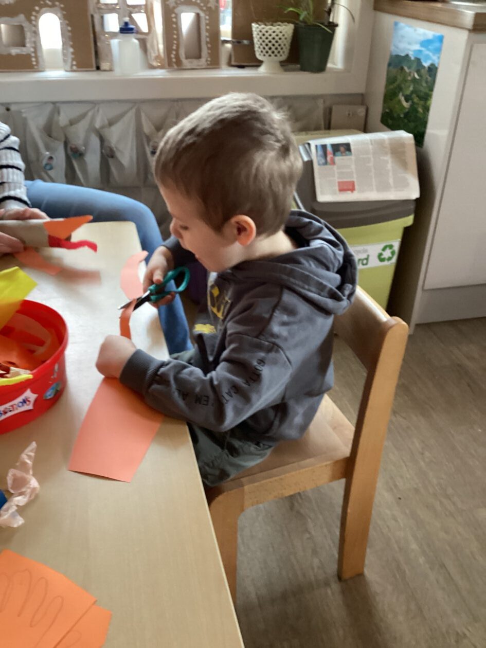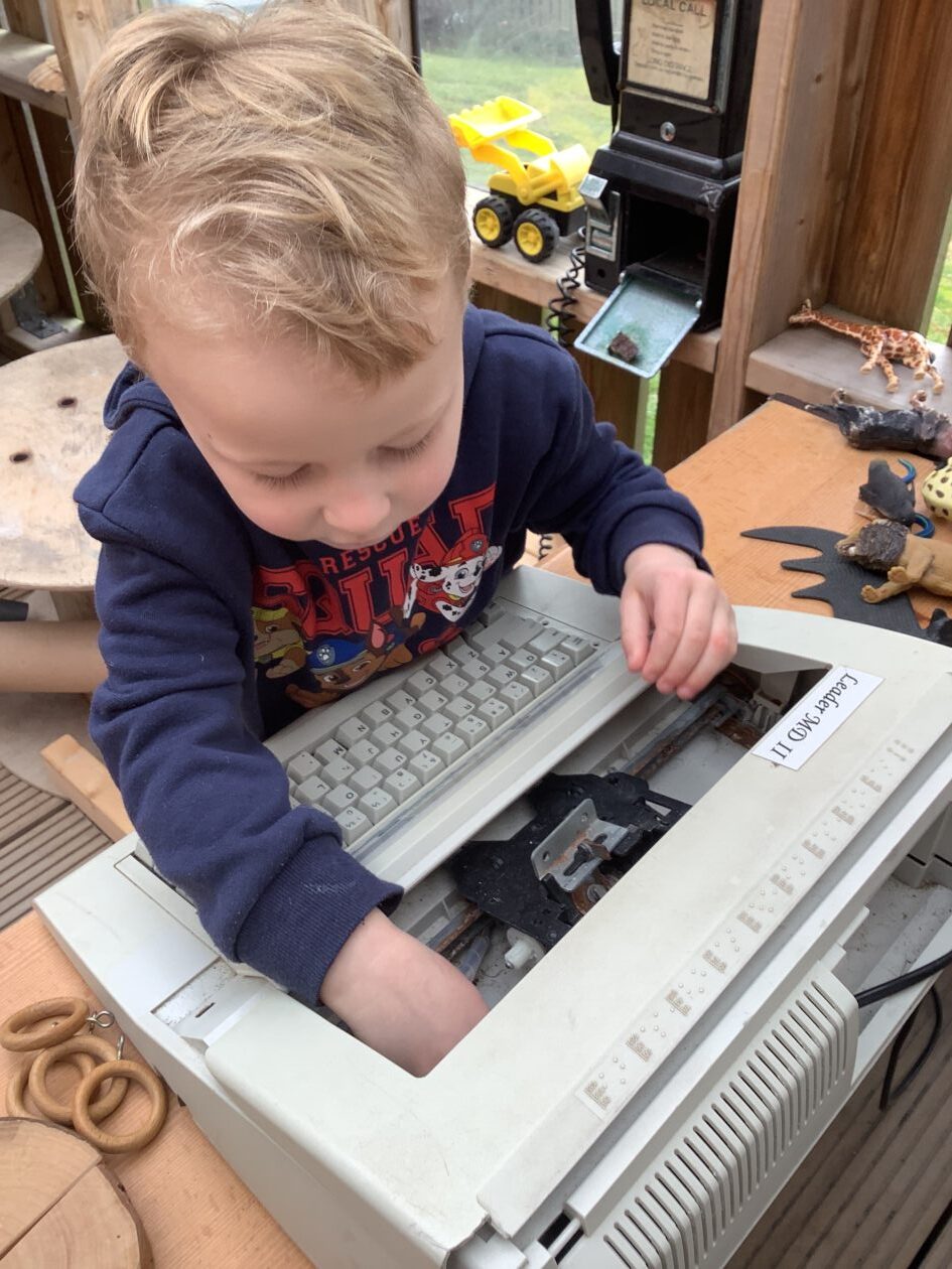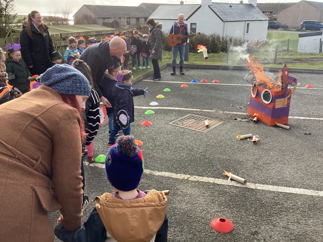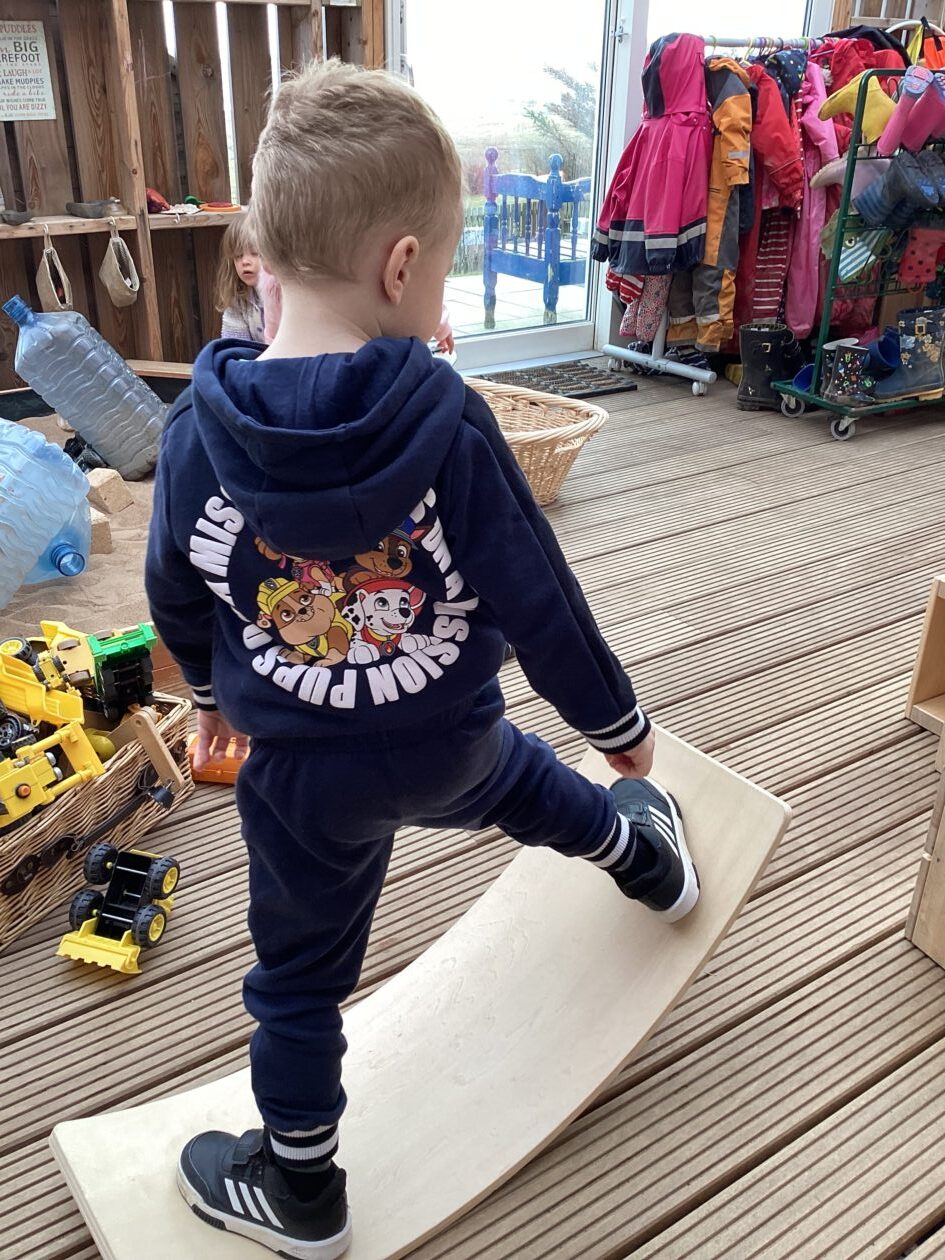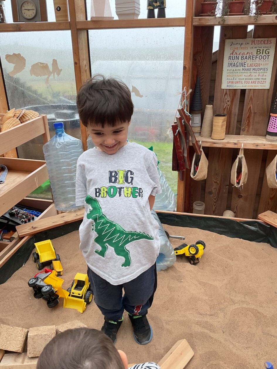 The outdoor room is always a popular choice and a great place to observe schemas (a repeated action used to explore and test theories in play). The bairns have used positioning, transporting, trajectory, enveloping, rotation and enclosure schemas in their play this week. They made paper aeroplanes and then built a platform to launch their planes from, watching how far they flew. They have also been engaged in imaginative play using the large hollow blocks and cable drums as fishing boats. “He is da een dat goes in da water. He is da fishing een and I’m da Captain.”