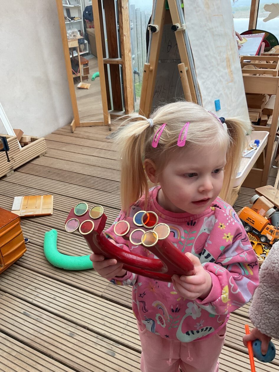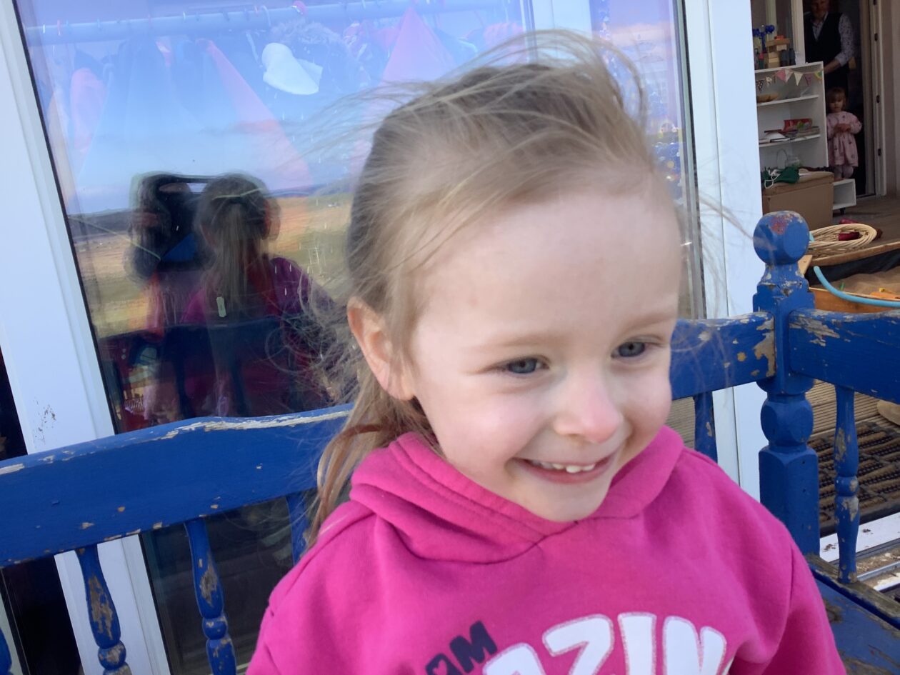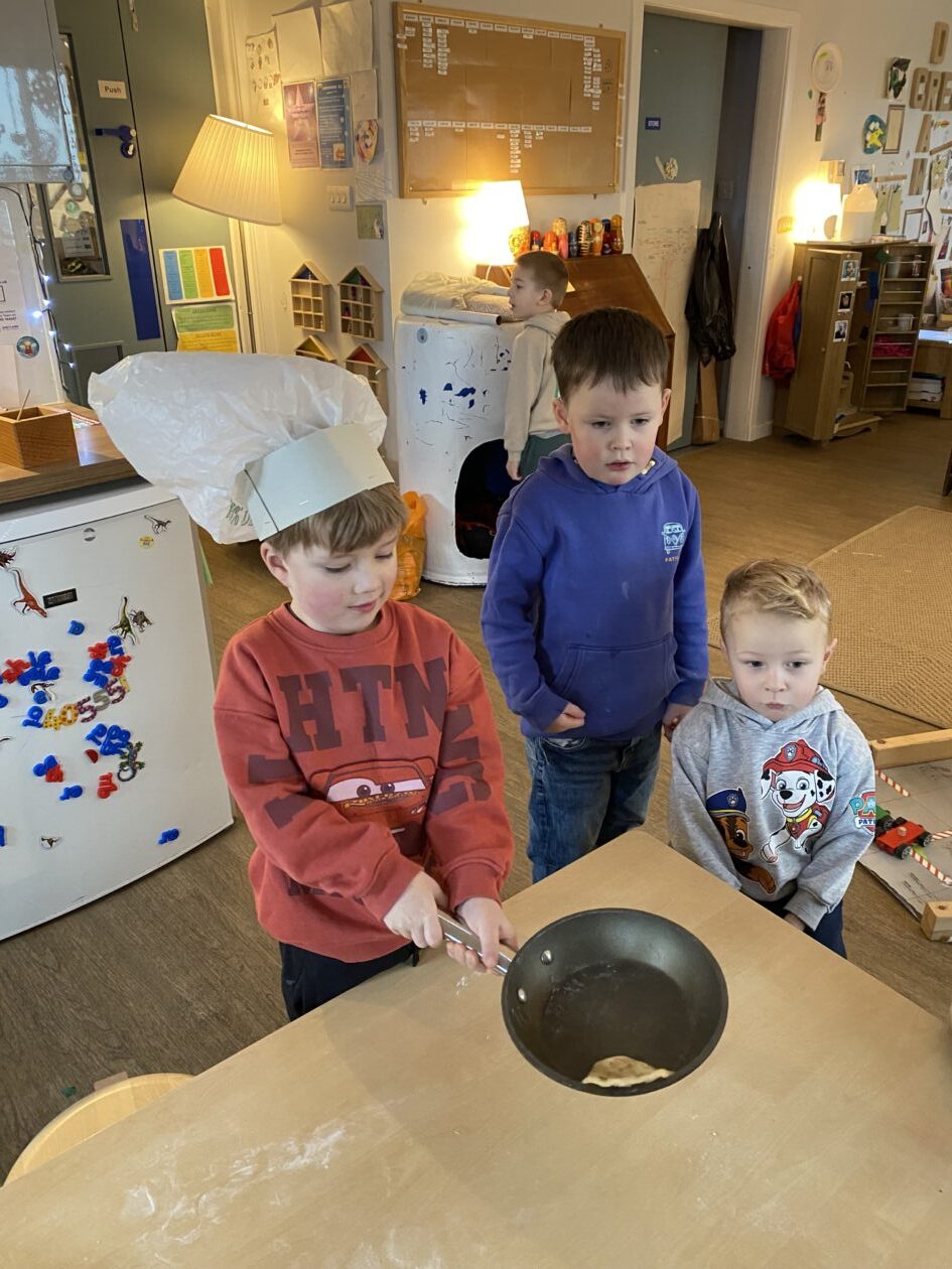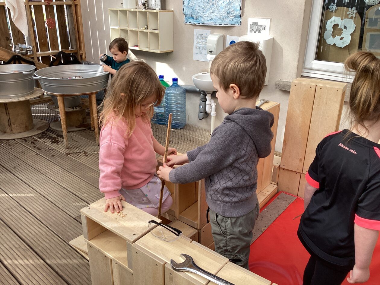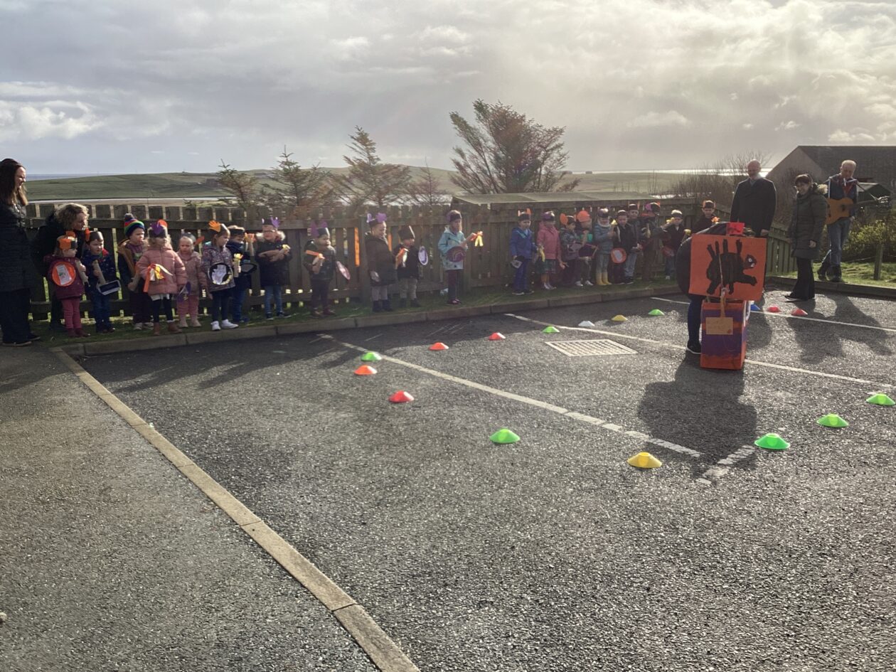 The outdoor room is always a popular choice and a great place to observe schemas (a repeated action used to explore and test theories in play). The bairns have used positioning, transporting, trajectory, enveloping, rotation and enclosure schemas in their play this week. They made paper aeroplanes and then built a platform to launch their planes from, watching how far they flew. They have also been engaged in imaginative play using the large hollow blocks and cable drums as fishing boats. “He is da een dat goes in da water. He is da fishing een and I’m da Captain.”
