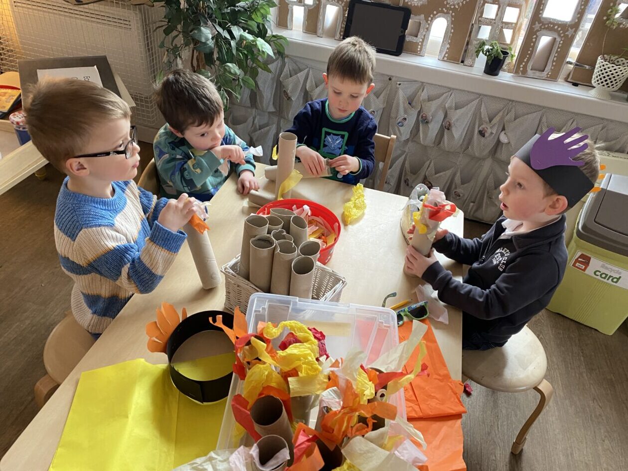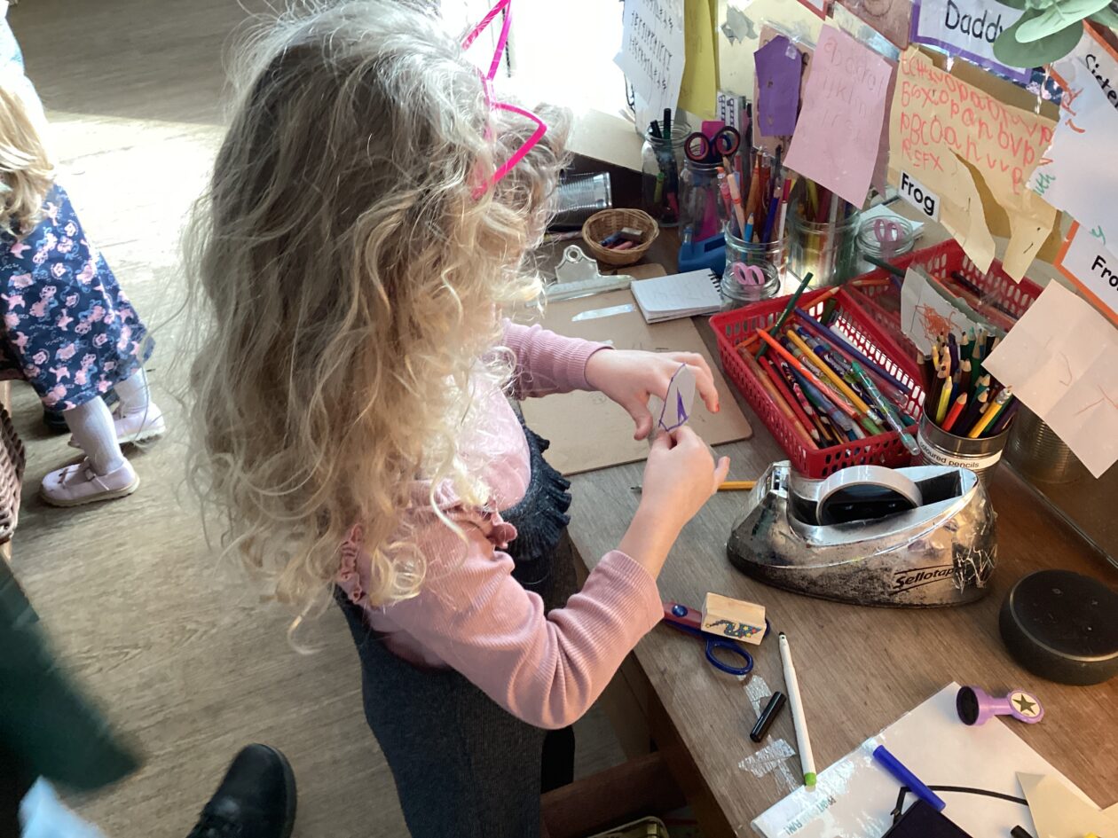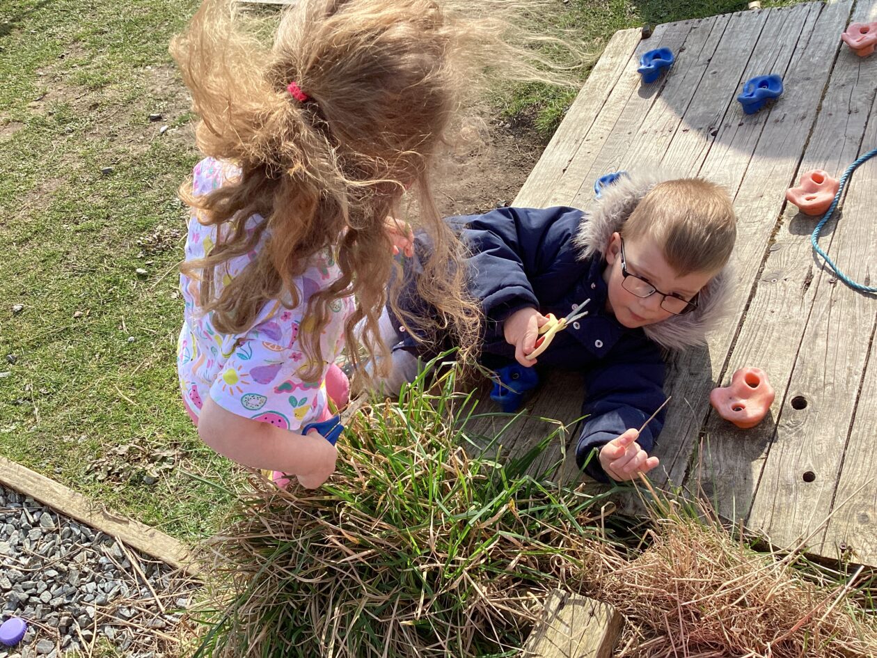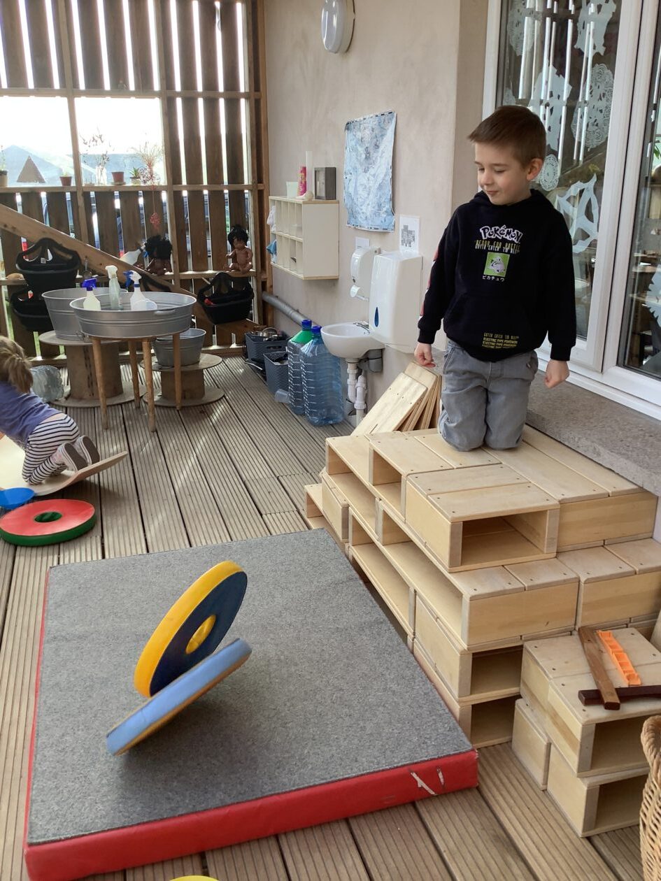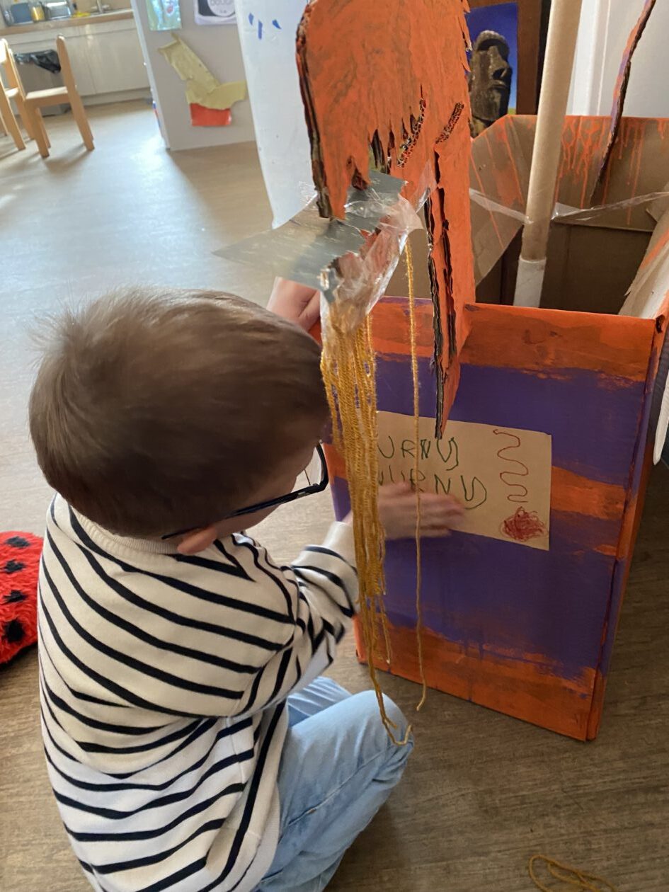 The outdoor room is always a popular choice and a great place to observe schemas (a repeated action used to explore and test theories in play). The bairns have used positioning, transporting, trajectory, enveloping, rotation and enclosure schemas in their play this week. They made paper aeroplanes and then built a platform to launch their planes from, watching how far they flew. They have also been engaged in imaginative play using the large hollow blocks and cable drums as fishing boats. “He is da een dat goes in da water. He is da fishing een and I’m da Captain.”
