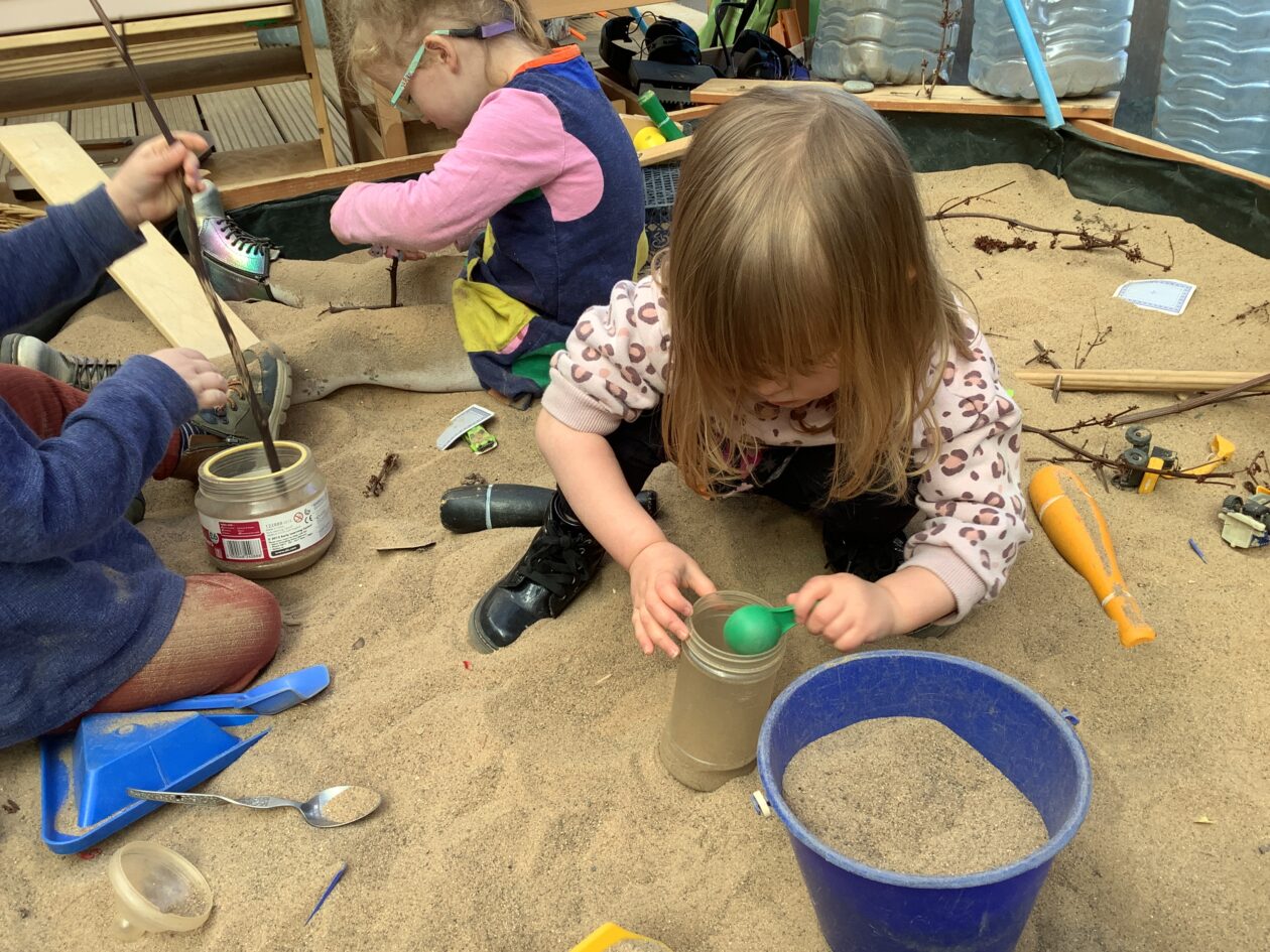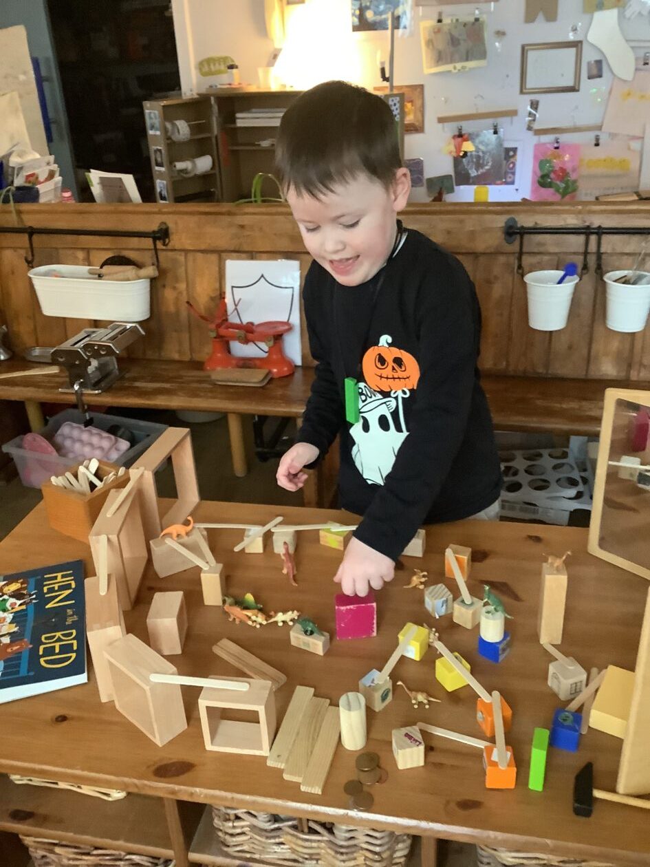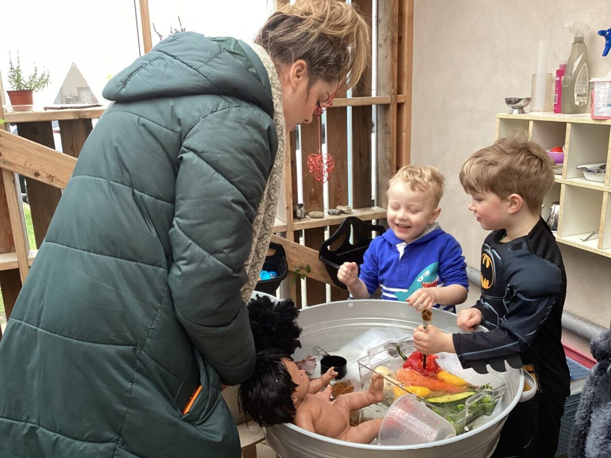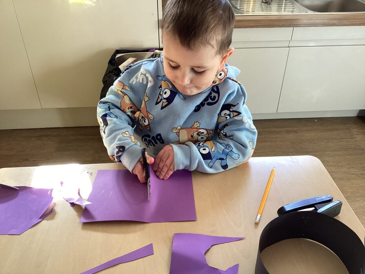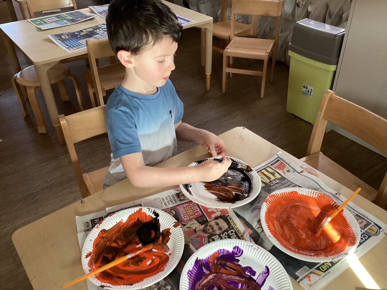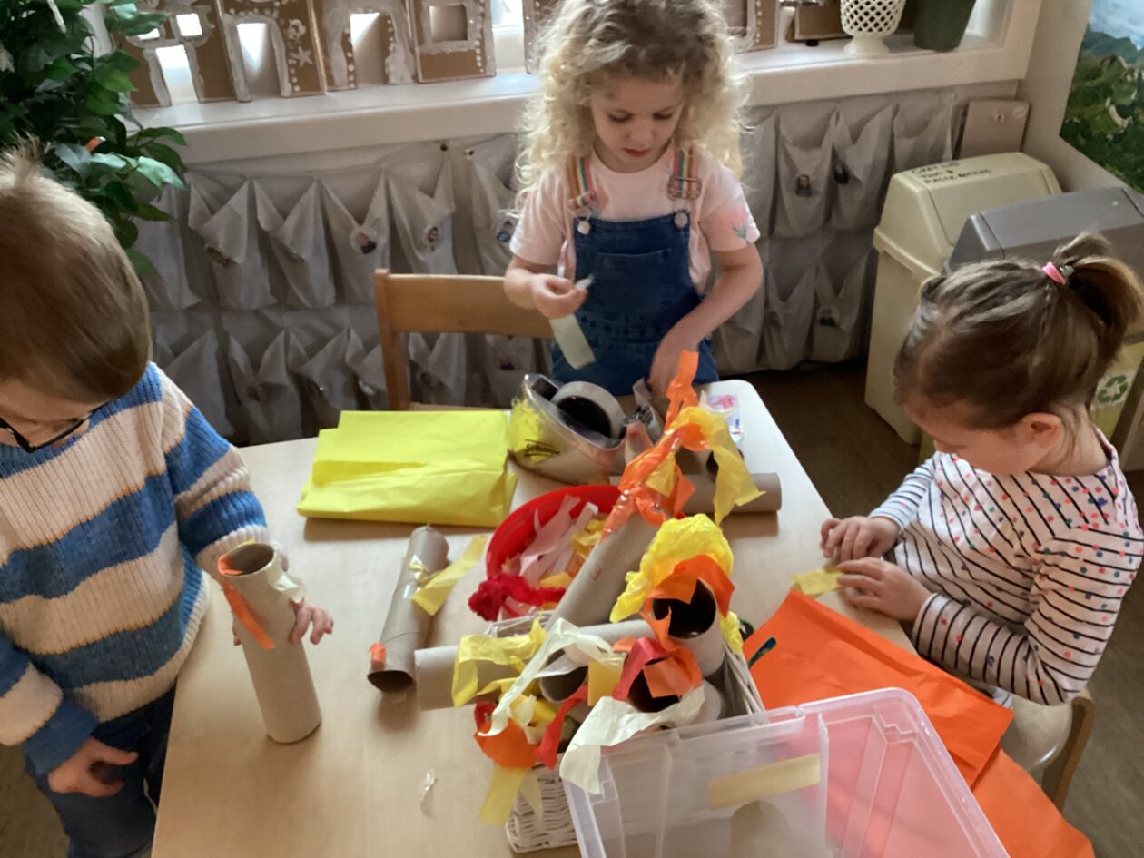 The outdoor room is always a popular choice and a great place to observe schemas (a repeated action used to explore and test theories in play). The bairns have used positioning, transporting, trajectory, enveloping, rotation and enclosure schemas in their play this week. They made paper aeroplanes and then built a platform to launch their planes from, watching how far they flew. They have also been engaged in imaginative play using the large hollow blocks and cable drums as fishing boats. “He is da een dat goes in da water. He is da fishing een and I’m da Captain.”