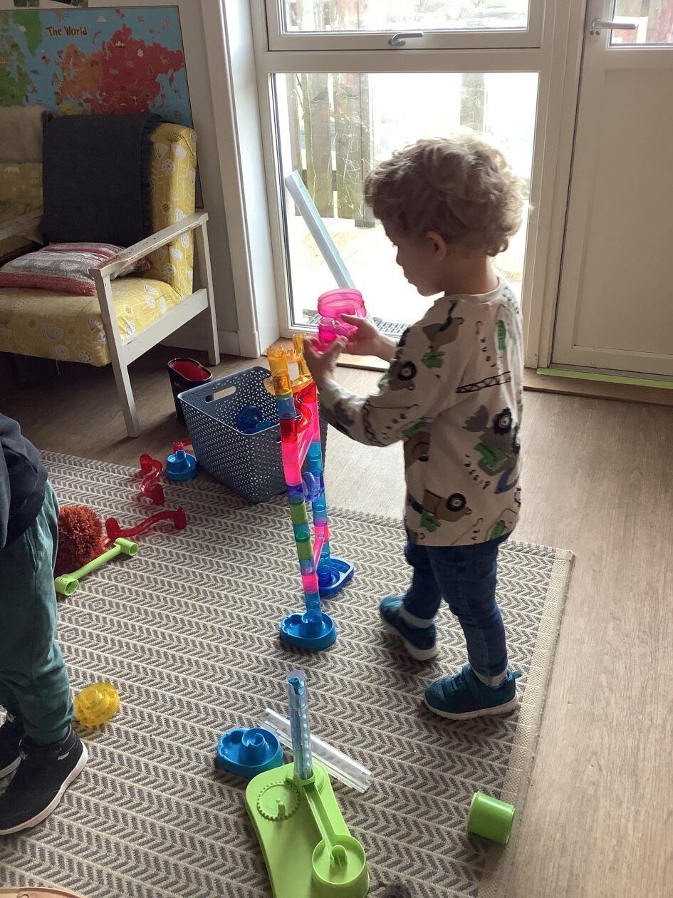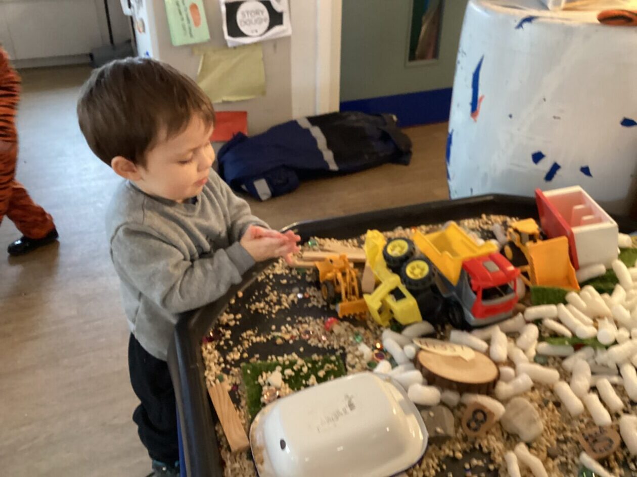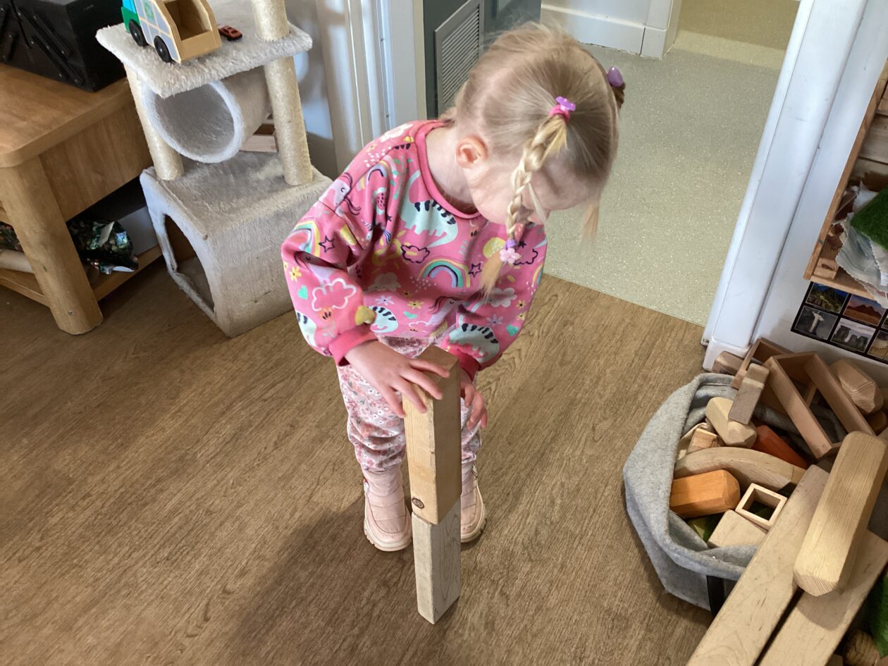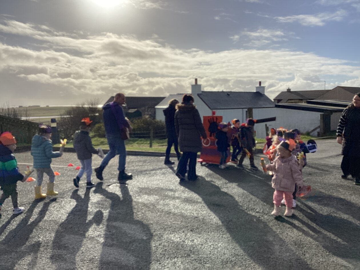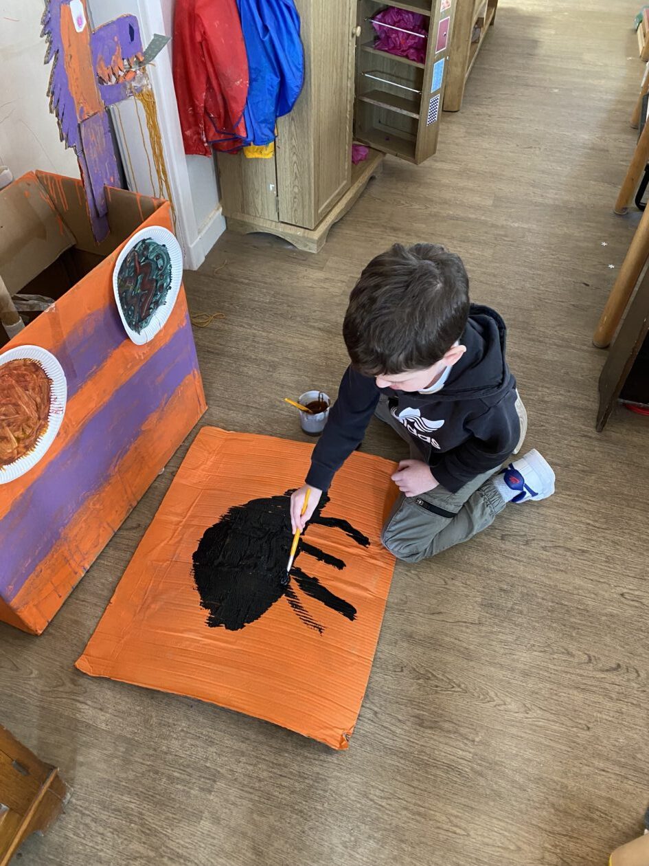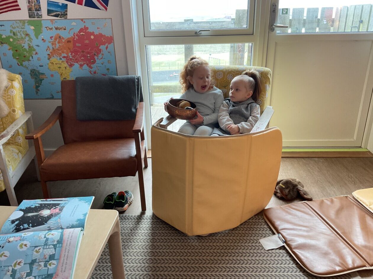 The outdoor room is always a popular choice and a great place to observe schemas (a repeated action used to explore and test theories in play). The bairns have used positioning, transporting, trajectory, enveloping, rotation and enclosure schemas in their play this week. They made paper aeroplanes and then built a platform to launch their planes from, watching how far they flew. They have also been engaged in imaginative play using the large hollow blocks and cable drums as fishing boats. “He is da een dat goes in da water. He is da fishing een and I’m da Captain.”